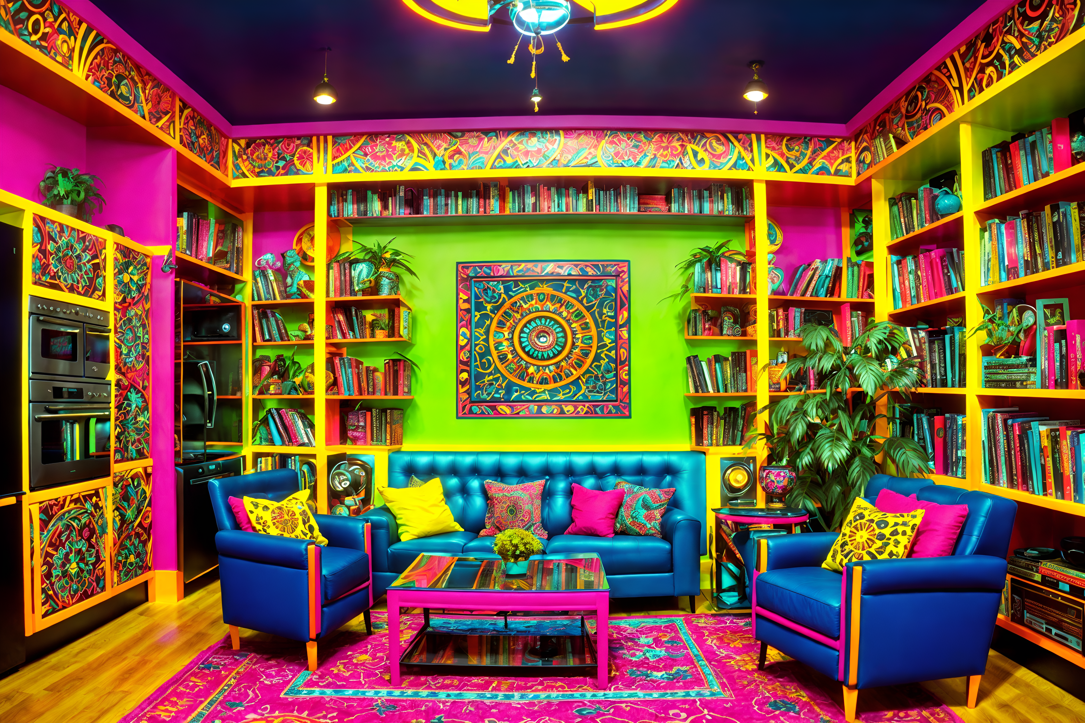 photo from pinterest of maximalist-style interior designed (kitchen living combo interior) with sink and stove and refrigerator and electric lamps and plant and bookshelves and televisions and coffee tables. . with over-the-top aesthetic and vibrant and bold creativity and bold colors and bold patterns and more is more philosophy and bold design and eye-catching. . cinematic photo, highly detailed, cinematic lighting, ultra-detailed, ultrarealistic, photorealism, 8k. trending on pinterest. maximalist interior design style. masterpiece, cinematic light, ultrarealistic+, photorealistic+, 8k, raw photo, realistic, sharp focus on eyes, (symmetrical eyes), (intact eyes), hyperrealistic, highest quality, best quality, , highly detailed, masterpiece, best quality, extremely detailed 8k wallpaper, masterpiece, best quality, ultra-detailed, best shadow, detailed background, detailed face, detailed eyes, high contrast, best illumination, detailed face, dulux, caustic, dynamic angle, detailed glow. dramatic lighting. highly detailed, insanely detailed hair, symmetrical, intricate details, professionally retouched, 8k high definition. strong bokeh. award winning photo.