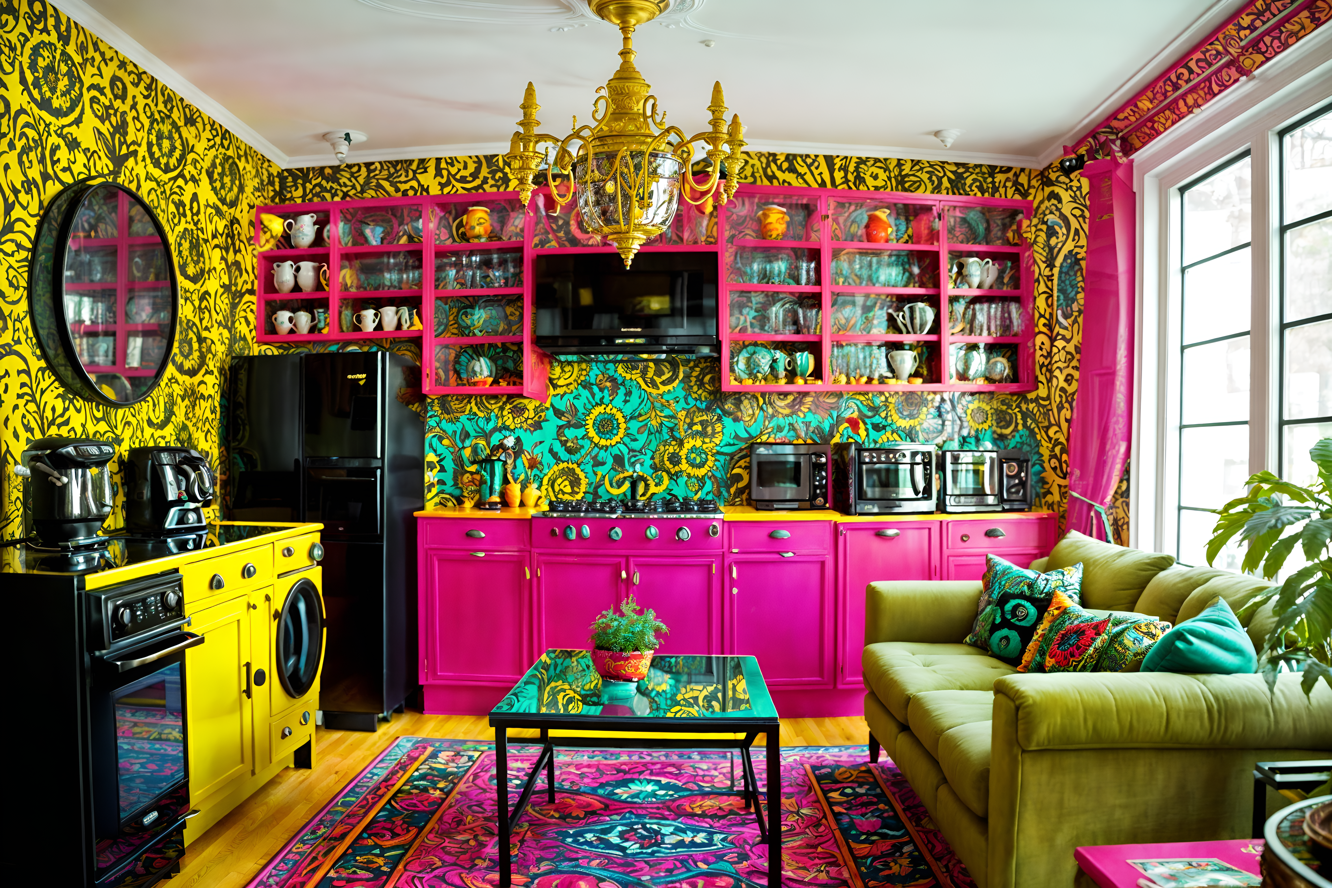 photo from pinterest of maximalist-style interior designed (kitchen living combo interior) with sink and stove and refrigerator and electric lamps and plant and bookshelves and televisions and coffee tables. . with over-the-top aesthetic and vibrant and bold creativity and bold colors and bold patterns and more is more philosophy and bold design and eye-catching. . cinematic photo, highly detailed, cinematic lighting, ultra-detailed, ultrarealistic, photorealism, 8k. trending on pinterest. maximalist interior design style. masterpiece, cinematic light, ultrarealistic+, photorealistic+, 8k, raw photo, realistic, sharp focus on eyes, (symmetrical eyes), (intact eyes), hyperrealistic, highest quality, best quality, , highly detailed, masterpiece, best quality, extremely detailed 8k wallpaper, masterpiece, best quality, ultra-detailed, best shadow, detailed background, detailed face, detailed eyes, high contrast, best illumination, detailed face, dulux, caustic, dynamic angle, detailed glow. dramatic lighting. highly detailed, insanely detailed hair, symmetrical, intricate details, professionally retouched, 8k high definition. strong bokeh. award winning photo.
