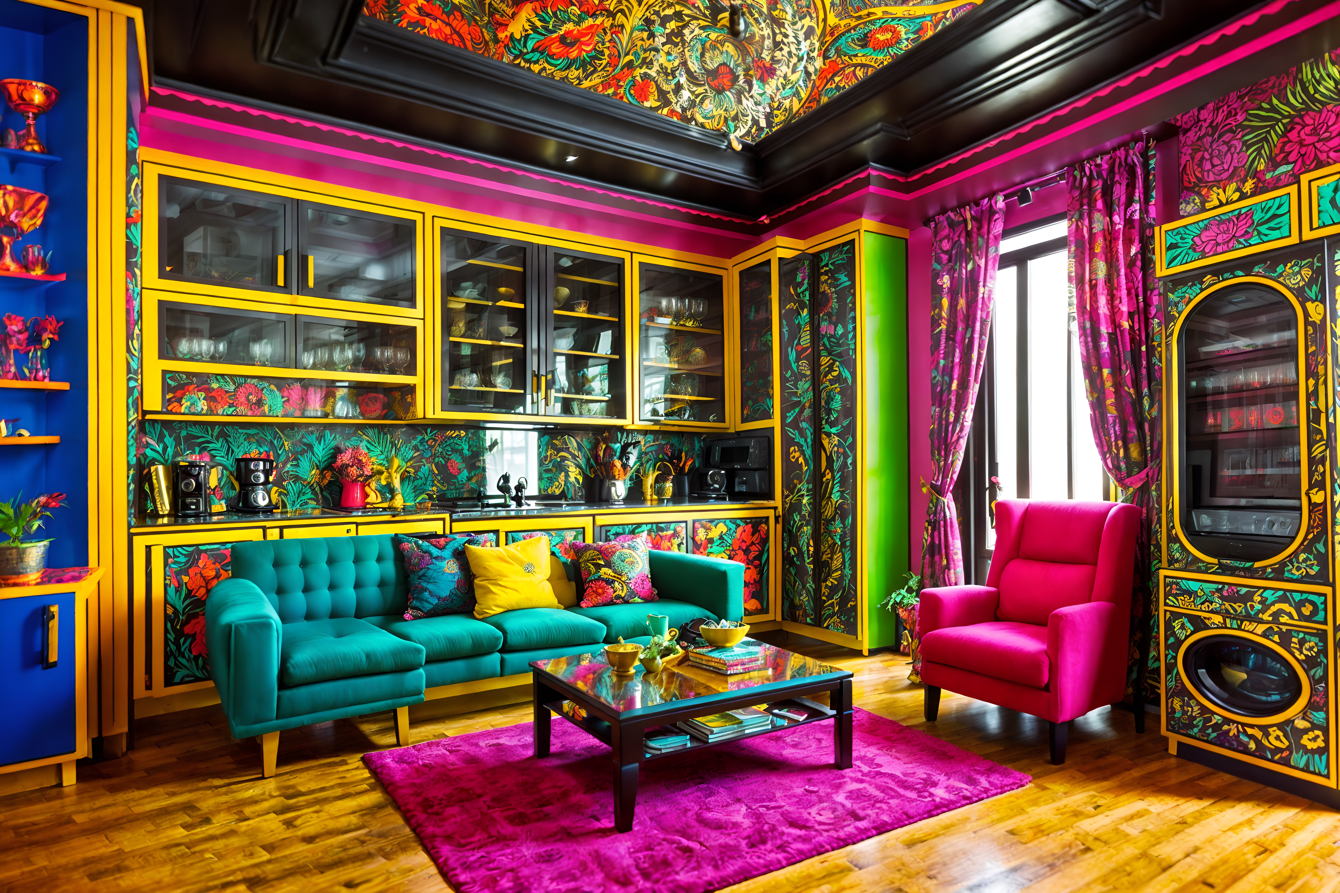 photo from pinterest of maximalist-style interior designed (kitchen living combo interior) with sink and stove and refrigerator and electric lamps and plant and bookshelves and televisions and coffee tables. . with over-the-top aesthetic and vibrant and bold creativity and bold colors and bold patterns and more is more philosophy and bold design and eye-catching. . cinematic photo, highly detailed, cinematic lighting, ultra-detailed, ultrarealistic, photorealism, 8k. trending on pinterest. maximalist interior design style. masterpiece, cinematic light, ultrarealistic+, photorealistic+, 8k, raw photo, realistic, sharp focus on eyes, (symmetrical eyes), (intact eyes), hyperrealistic, highest quality, best quality, , highly detailed, masterpiece, best quality, extremely detailed 8k wallpaper, masterpiece, best quality, ultra-detailed, best shadow, detailed background, detailed face, detailed eyes, high contrast, best illumination, detailed face, dulux, caustic, dynamic angle, detailed glow. dramatic lighting. highly detailed, insanely detailed hair, symmetrical, intricate details, professionally retouched, 8k high definition. strong bokeh. award winning photo.