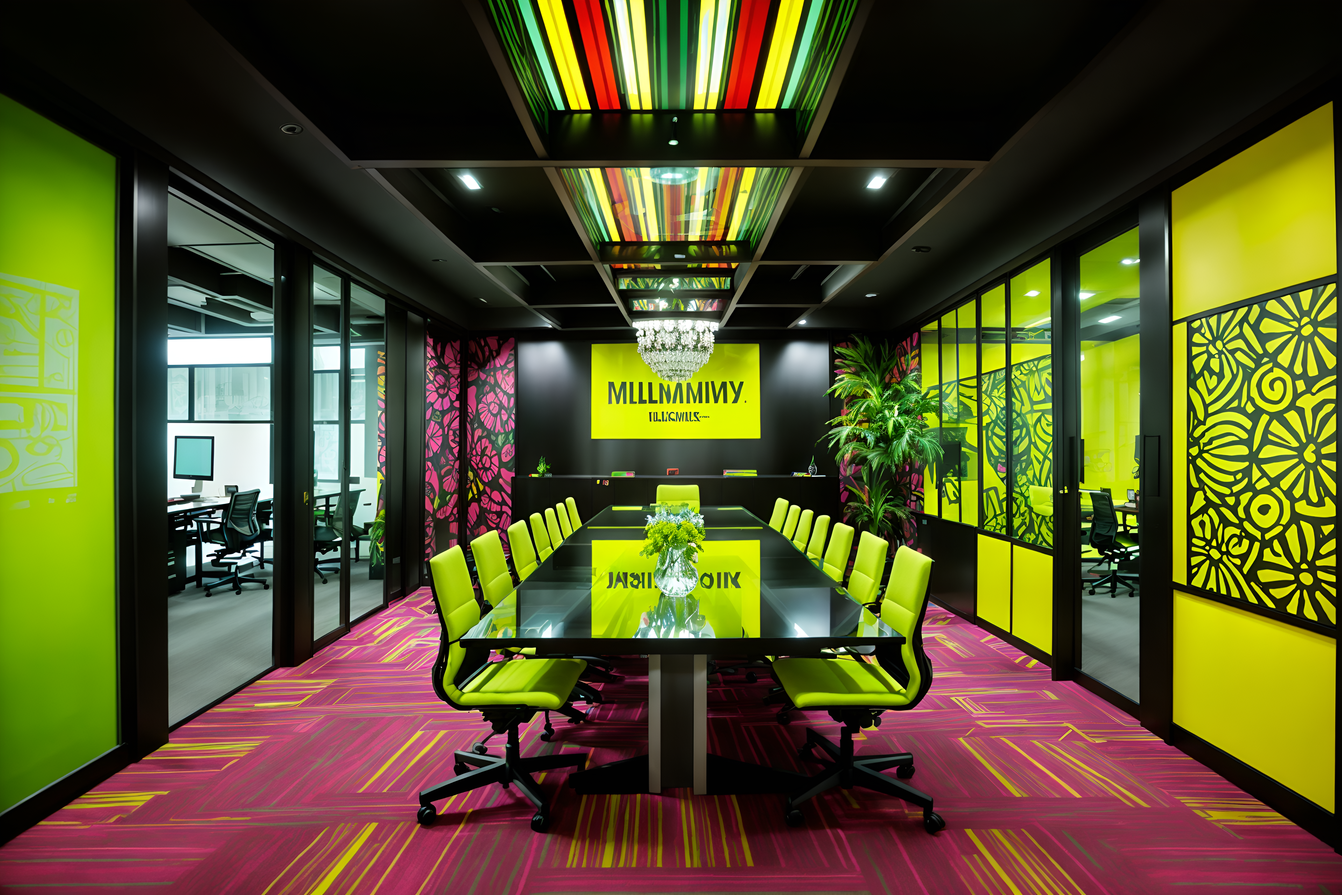 maximalist meeting roomsinterior decorate this meeting room with maximalist style. . . with glass doors and plant and boardroom table and painting or photo on wall and office chairs and cabinets and vase and glass walls. . with vibrant and bold creativity and more is more philosophy and bold colors and bold patterns and bold design and playful and eye-catching. . .