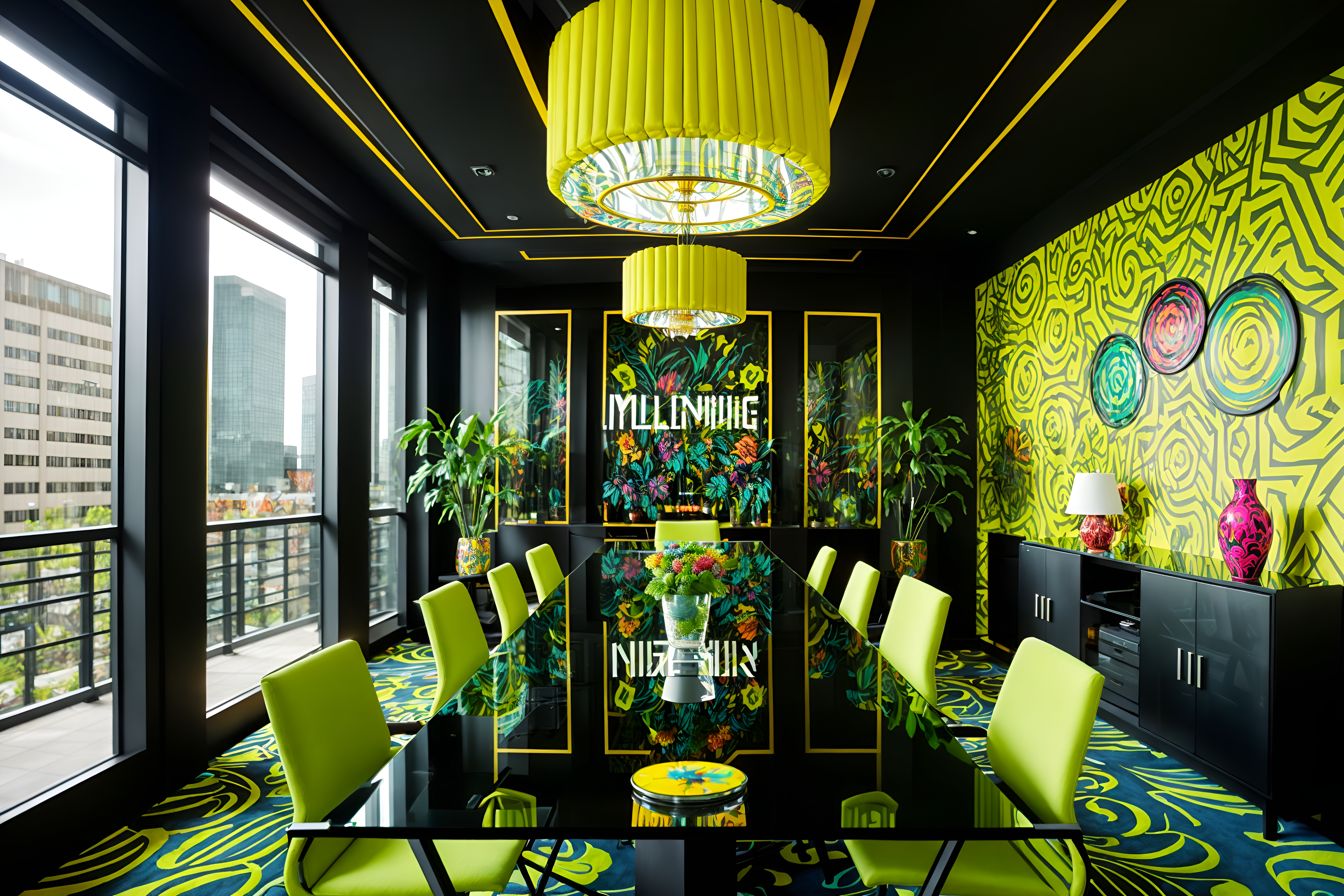 photo from pinterest of maximalist-style interior designed (meeting room interior) with glass walls and vase and cabinets and painting or photo on wall and office chairs and boardroom table and plant and glass doors. . with over-the-top aesthetic and bold patterns and more is more philosophy and vibrant and eye-catching and bold creativity and playful and bold design. . cinematic photo, highly detailed, cinematic lighting, ultra-detailed, ultrarealistic, photorealism, 8k. trending on pinterest. maximalist interior design style. masterpiece, cinematic light, ultrarealistic+, photorealistic+, 8k, raw photo, realistic, sharp focus on eyes, (symmetrical eyes), (intact eyes), hyperrealistic, highest quality, best quality, , highly detailed, masterpiece, best quality, extremely detailed 8k wallpaper, masterpiece, best quality, ultra-detailed, best shadow, detailed background, detailed face, detailed eyes, high contrast, best illumination, detailed face, dulux, caustic, dynamic angle, detailed glow. dramatic lighting. highly detailed, insanely detailed hair, symmetrical, intricate details, professionally retouched, 8k high definition. strong bokeh. award winning photo.