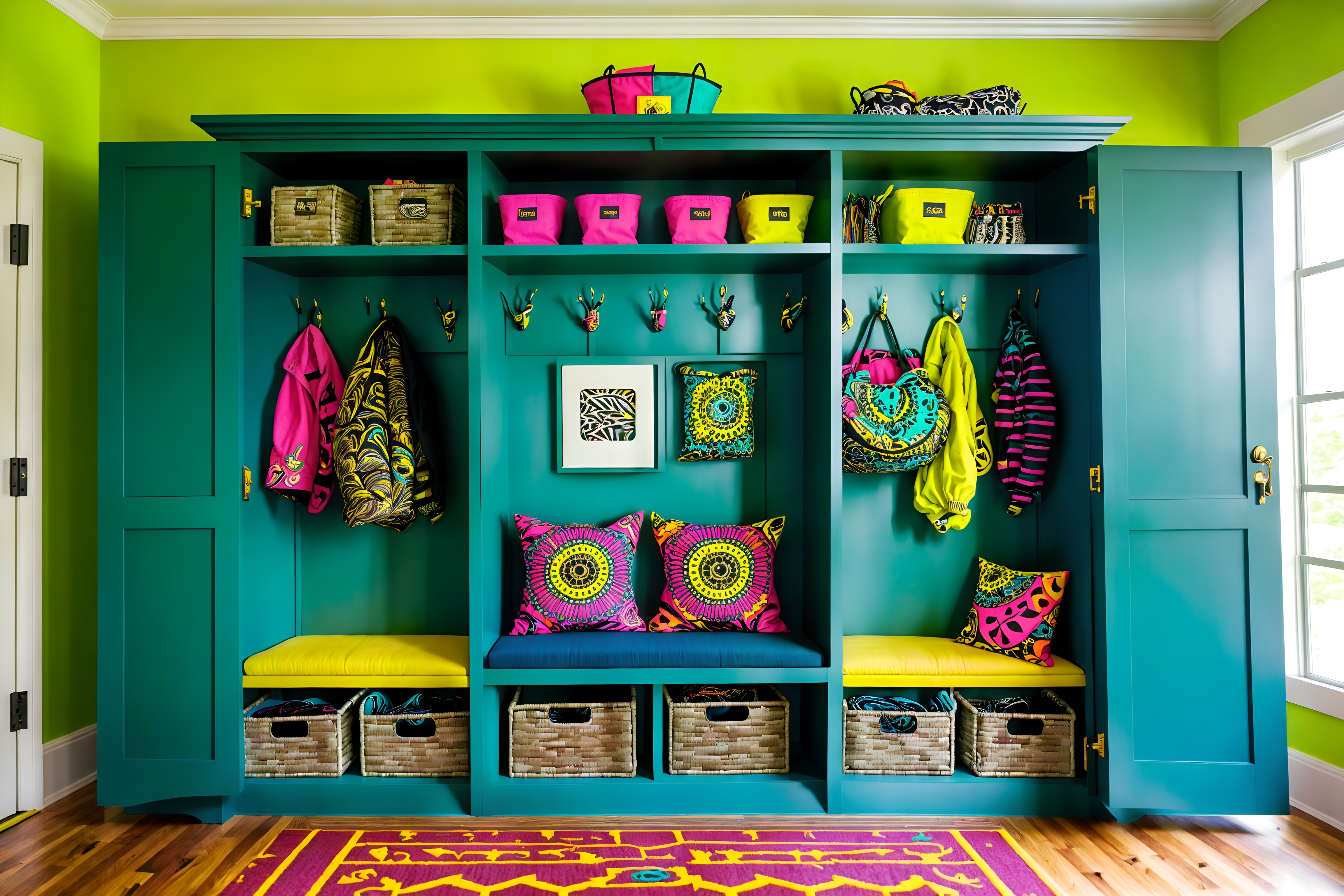 photo from pinterest of maximalist-style interior designed (mudroom interior) with storage baskets and storage drawers and cabinets and wall hooks for coats and a bench and high up storage and cubbies and shelves for shoes. . with bold patterns and bold colors and bold creativity and eye-catching and over-the-top aesthetic and vibrant and playful and bold design. . cinematic photo, highly detailed, cinematic lighting, ultra-detailed, ultrarealistic, photorealism, 8k. trending on pinterest. maximalist interior design style. masterpiece, cinematic light, ultrarealistic+, photorealistic+, 8k, raw photo, realistic, sharp focus on eyes, (symmetrical eyes), (intact eyes), hyperrealistic, highest quality, best quality, , highly detailed, masterpiece, best quality, extremely detailed 8k wallpaper, masterpiece, best quality, ultra-detailed, best shadow, detailed background, detailed face, detailed eyes, high contrast, best illumination, detailed face, dulux, caustic, dynamic angle, detailed glow. dramatic lighting. highly detailed, insanely detailed hair, symmetrical, intricate details, professionally retouched, 8k high definition. strong bokeh. award winning photo.