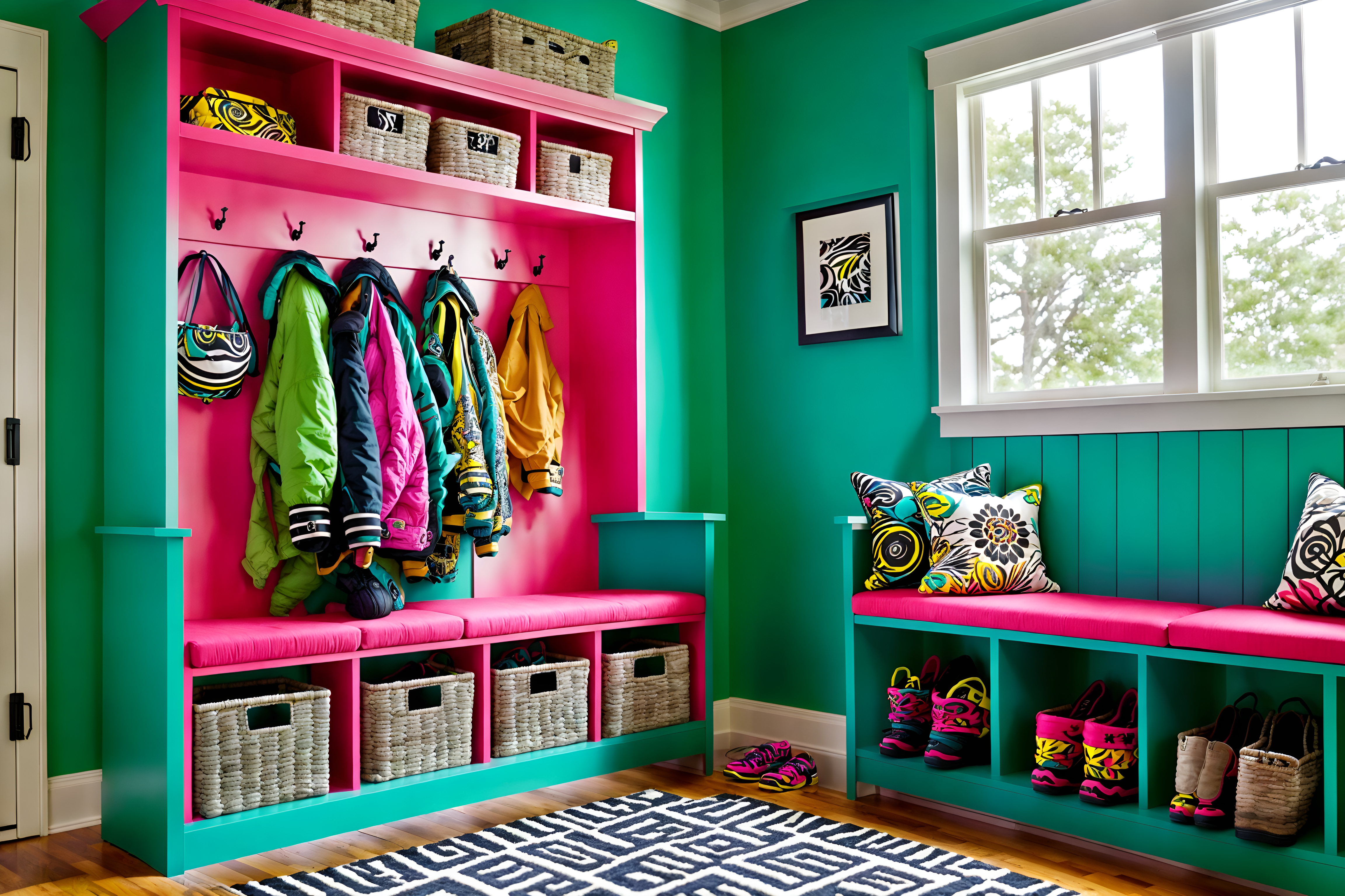 photo from pinterest of maximalist-style interior designed (mudroom interior) with storage baskets and storage drawers and cabinets and wall hooks for coats and a bench and high up storage and cubbies and shelves for shoes. . with bold patterns and bold colors and bold creativity and eye-catching and over-the-top aesthetic and vibrant and playful and bold design. . cinematic photo, highly detailed, cinematic lighting, ultra-detailed, ultrarealistic, photorealism, 8k. trending on pinterest. maximalist interior design style. masterpiece, cinematic light, ultrarealistic+, photorealistic+, 8k, raw photo, realistic, sharp focus on eyes, (symmetrical eyes), (intact eyes), hyperrealistic, highest quality, best quality, , highly detailed, masterpiece, best quality, extremely detailed 8k wallpaper, masterpiece, best quality, ultra-detailed, best shadow, detailed background, detailed face, detailed eyes, high contrast, best illumination, detailed face, dulux, caustic, dynamic angle, detailed glow. dramatic lighting. highly detailed, insanely detailed hair, symmetrical, intricate details, professionally retouched, 8k high definition. strong bokeh. award winning photo.