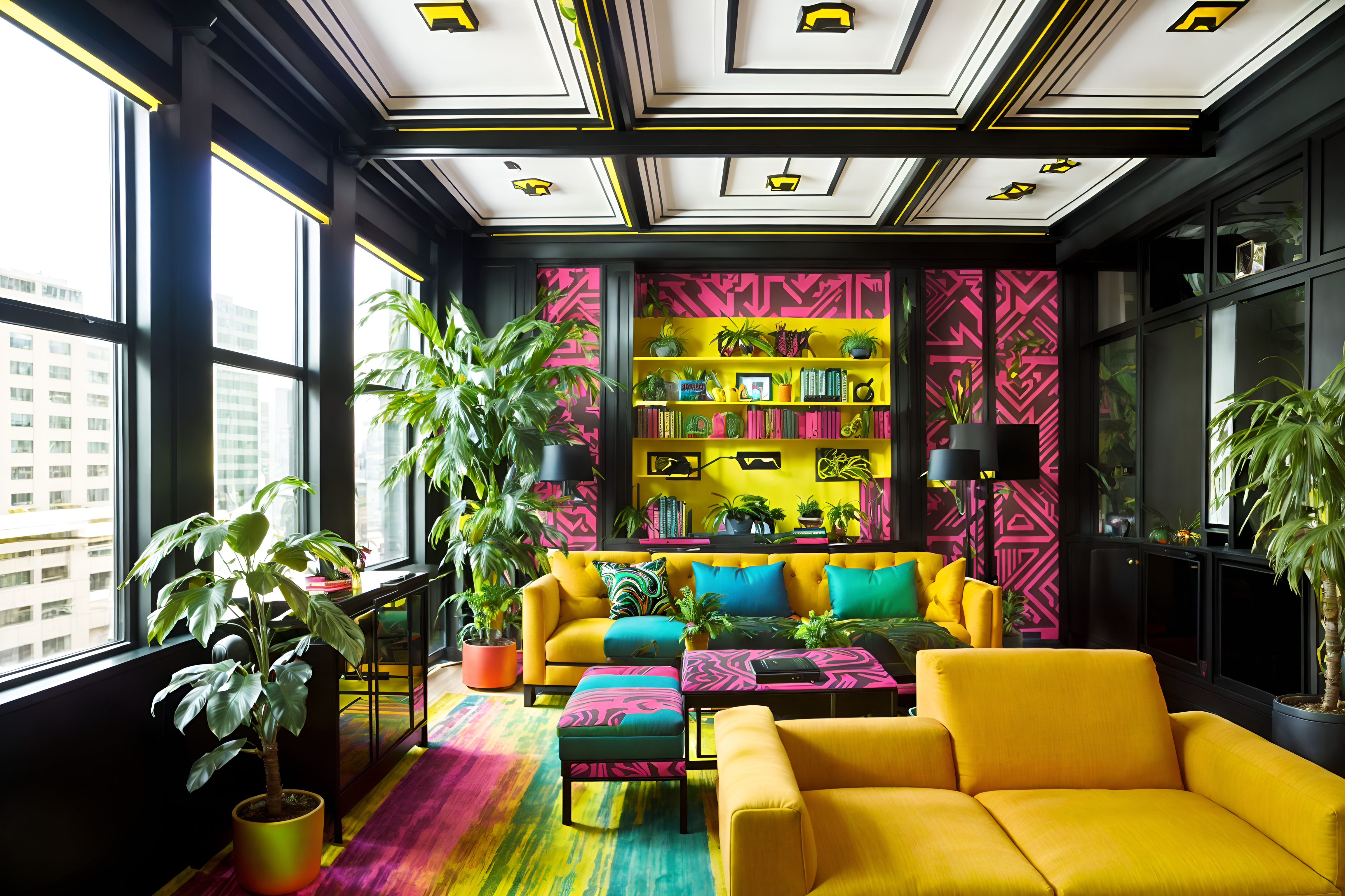 photo from pinterest of maximalist-style interior designed (office interior) with cabinets and plants and windows and computer desks and office desks and lounge chairs and desk lamps and seating area with sofa. . with vibrant and over-the-top aesthetic and more is more philosophy and eye-catching and bold creativity and bold colors and bold patterns and bold design. . cinematic photo, highly detailed, cinematic lighting, ultra-detailed, ultrarealistic, photorealism, 8k. trending on pinterest. maximalist interior design style. masterpiece, cinematic light, ultrarealistic+, photorealistic+, 8k, raw photo, realistic, sharp focus on eyes, (symmetrical eyes), (intact eyes), hyperrealistic, highest quality, best quality, , highly detailed, masterpiece, best quality, extremely detailed 8k wallpaper, masterpiece, best quality, ultra-detailed, best shadow, detailed background, detailed face, detailed eyes, high contrast, best illumination, detailed face, dulux, caustic, dynamic angle, detailed glow. dramatic lighting. highly detailed, insanely detailed hair, symmetrical, intricate details, professionally retouched, 8k high definition. strong bokeh. award winning photo.