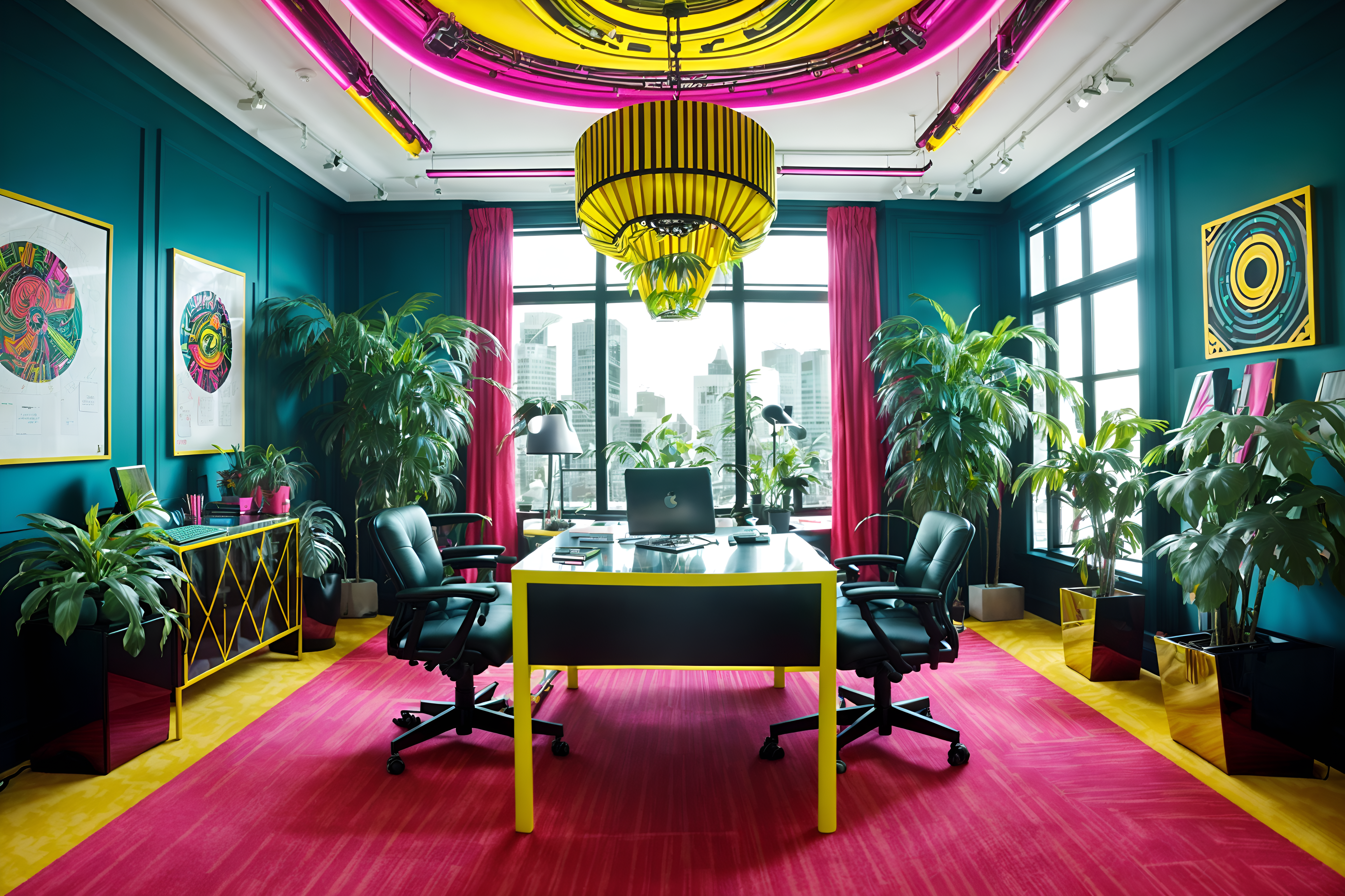 photo from pinterest of maximalist-style interior designed (office interior) with windows and desk lamps and computer desks and office desks and office chairs and lounge chairs and plants and cabinets. . with bold creativity and over-the-top aesthetic and more is more philosophy and bold design and playful and bold colors and vibrant and eye-catching. . cinematic photo, highly detailed, cinematic lighting, ultra-detailed, ultrarealistic, photorealism, 8k. trending on pinterest. maximalist interior design style. masterpiece, cinematic light, ultrarealistic+, photorealistic+, 8k, raw photo, realistic, sharp focus on eyes, (symmetrical eyes), (intact eyes), hyperrealistic, highest quality, best quality, , highly detailed, masterpiece, best quality, extremely detailed 8k wallpaper, masterpiece, best quality, ultra-detailed, best shadow, detailed background, detailed face, detailed eyes, high contrast, best illumination, detailed face, dulux, caustic, dynamic angle, detailed glow. dramatic lighting. highly detailed, insanely detailed hair, symmetrical, intricate details, professionally retouched, 8k high definition. strong bokeh. award winning photo.