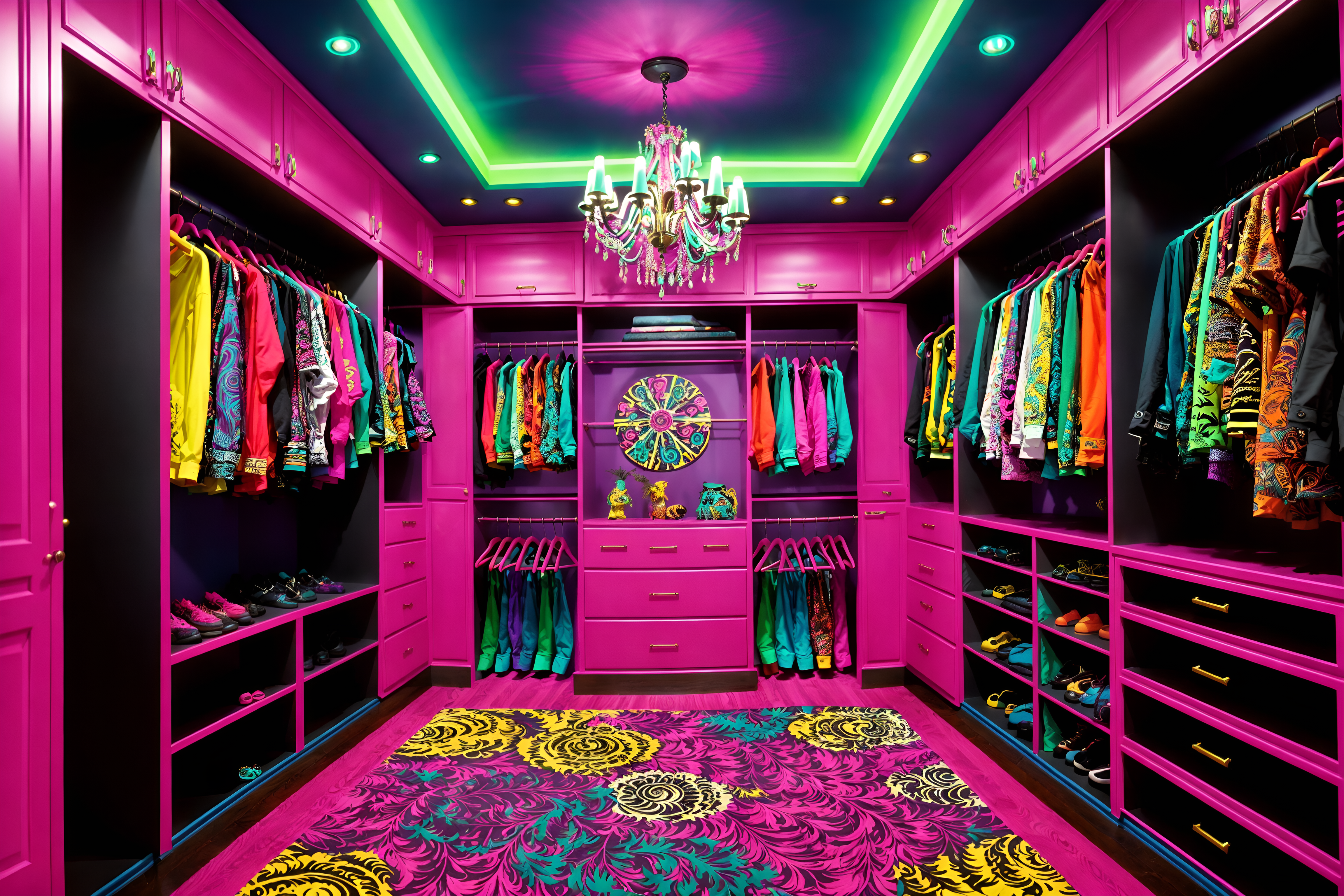 photo from pinterest of maximalist-style interior designed (walk in closet interior) . with over-the-top aesthetic and bold colors and playful and bold patterns and bold creativity and more is more philosophy and vibrant and bold design. . cinematic photo, highly detailed, cinematic lighting, ultra-detailed, ultrarealistic, photorealism, 8k. trending on pinterest. maximalist interior design style. masterpiece, cinematic light, ultrarealistic+, photorealistic+, 8k, raw photo, realistic, sharp focus on eyes, (symmetrical eyes), (intact eyes), hyperrealistic, highest quality, best quality, , highly detailed, masterpiece, best quality, extremely detailed 8k wallpaper, masterpiece, best quality, ultra-detailed, best shadow, detailed background, detailed face, detailed eyes, high contrast, best illumination, detailed face, dulux, caustic, dynamic angle, detailed glow. dramatic lighting. highly detailed, insanely detailed hair, symmetrical, intricate details, professionally retouched, 8k high definition. strong bokeh. award winning photo.