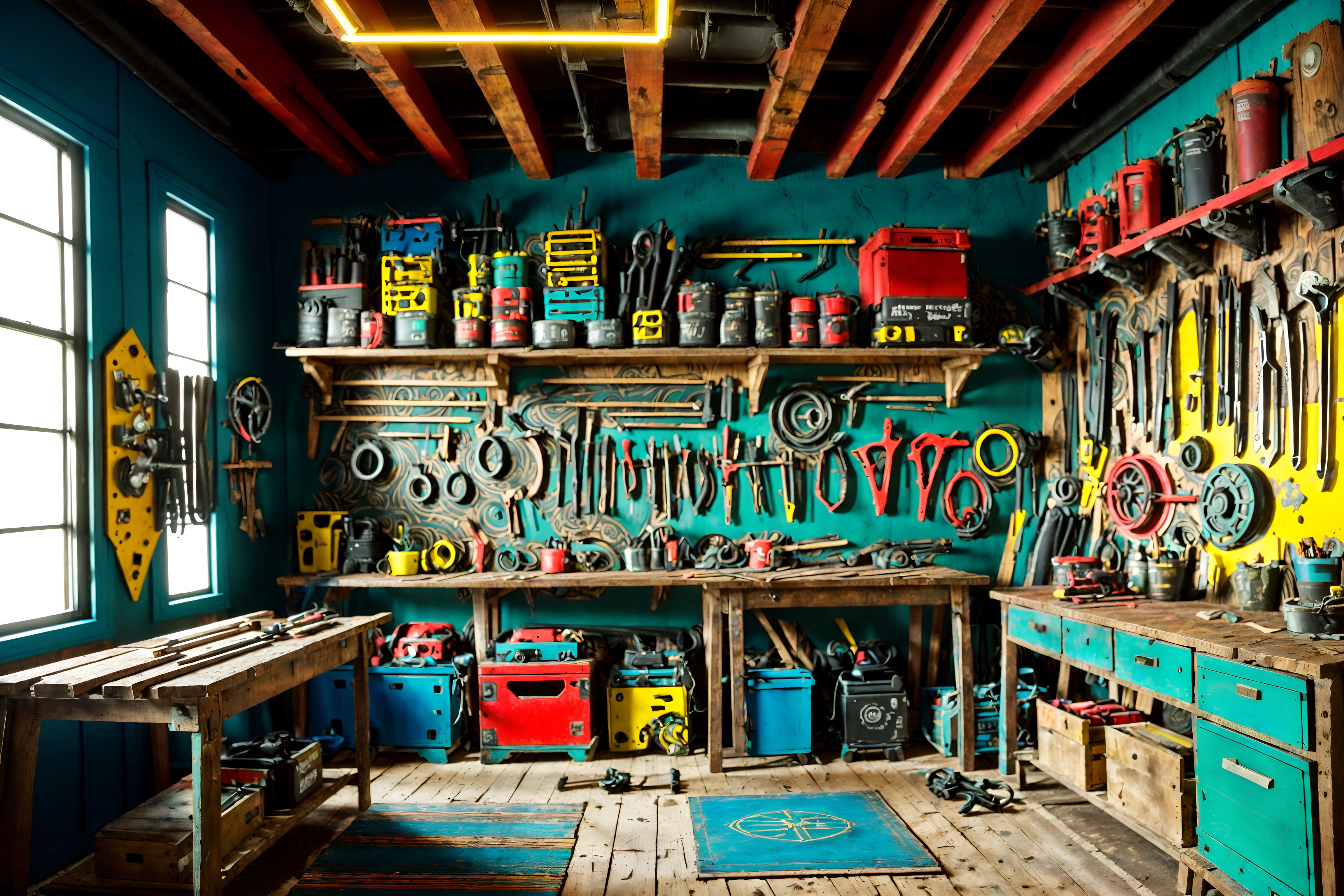photo from pinterest of maximalist-style interior designed (workshop interior) with tool wall and wooden workbench and messy and tool wall. . with bold creativity and bold colors and playful and eye-catching and bold patterns and bold design and more is more philosophy and vibrant. . cinematic photo, highly detailed, cinematic lighting, ultra-detailed, ultrarealistic, photorealism, 8k. trending on pinterest. maximalist interior design style. masterpiece, cinematic light, ultrarealistic+, photorealistic+, 8k, raw photo, realistic, sharp focus on eyes, (symmetrical eyes), (intact eyes), hyperrealistic, highest quality, best quality, , highly detailed, masterpiece, best quality, extremely detailed 8k wallpaper, masterpiece, best quality, ultra-detailed, best shadow, detailed background, detailed face, detailed eyes, high contrast, best illumination, detailed face, dulux, caustic, dynamic angle, detailed glow. dramatic lighting. highly detailed, insanely detailed hair, symmetrical, intricate details, professionally retouched, 8k high definition. strong bokeh. award winning photo.