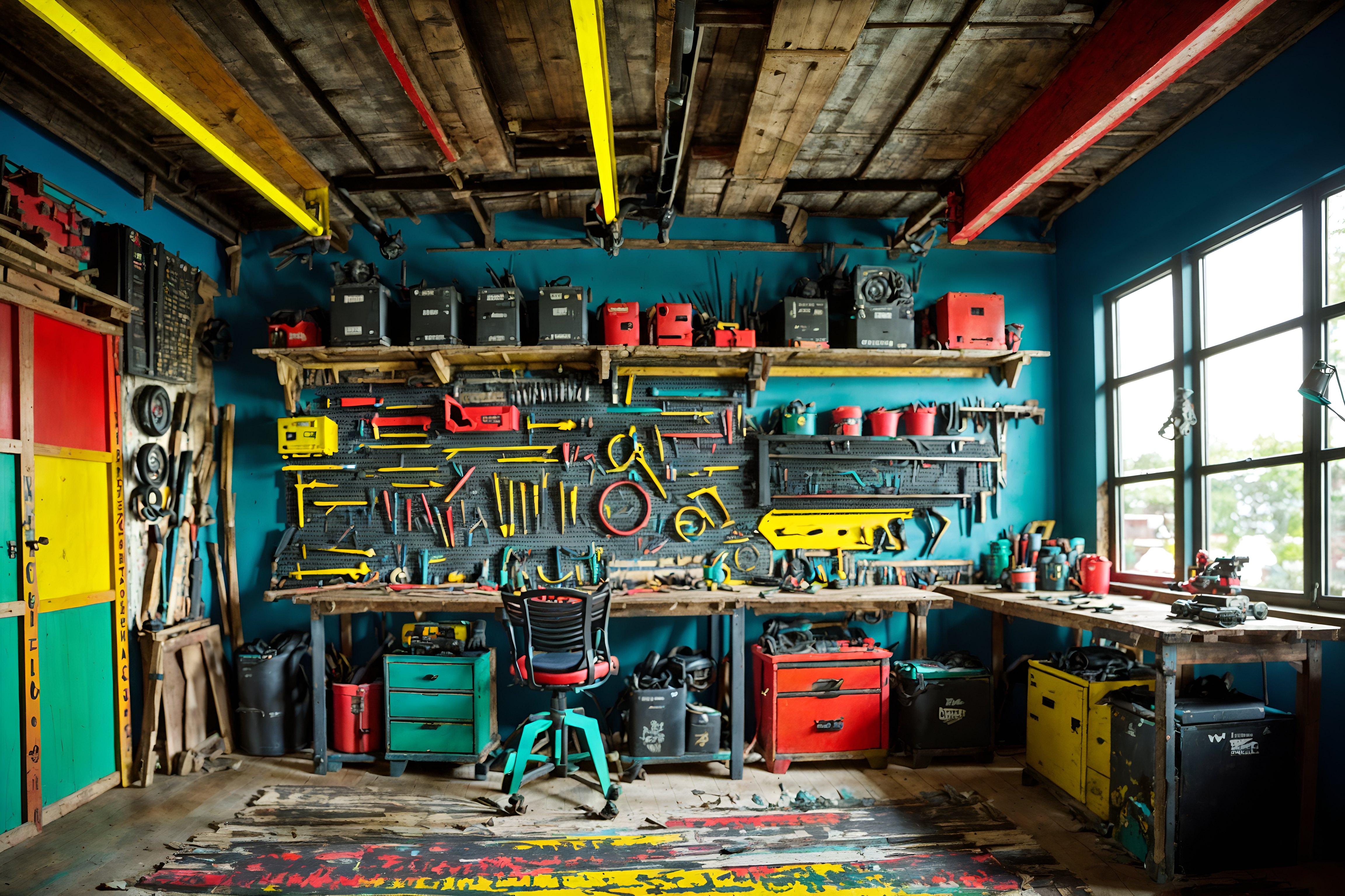 photo from pinterest of maximalist-style interior designed (workshop interior) with tool wall and wooden workbench and messy and tool wall. . with bold creativity and bold colors and playful and eye-catching and bold patterns and bold design and more is more philosophy and vibrant. . cinematic photo, highly detailed, cinematic lighting, ultra-detailed, ultrarealistic, photorealism, 8k. trending on pinterest. maximalist interior design style. masterpiece, cinematic light, ultrarealistic+, photorealistic+, 8k, raw photo, realistic, sharp focus on eyes, (symmetrical eyes), (intact eyes), hyperrealistic, highest quality, best quality, , highly detailed, masterpiece, best quality, extremely detailed 8k wallpaper, masterpiece, best quality, ultra-detailed, best shadow, detailed background, detailed face, detailed eyes, high contrast, best illumination, detailed face, dulux, caustic, dynamic angle, detailed glow. dramatic lighting. highly detailed, insanely detailed hair, symmetrical, intricate details, professionally retouched, 8k high definition. strong bokeh. award winning photo.