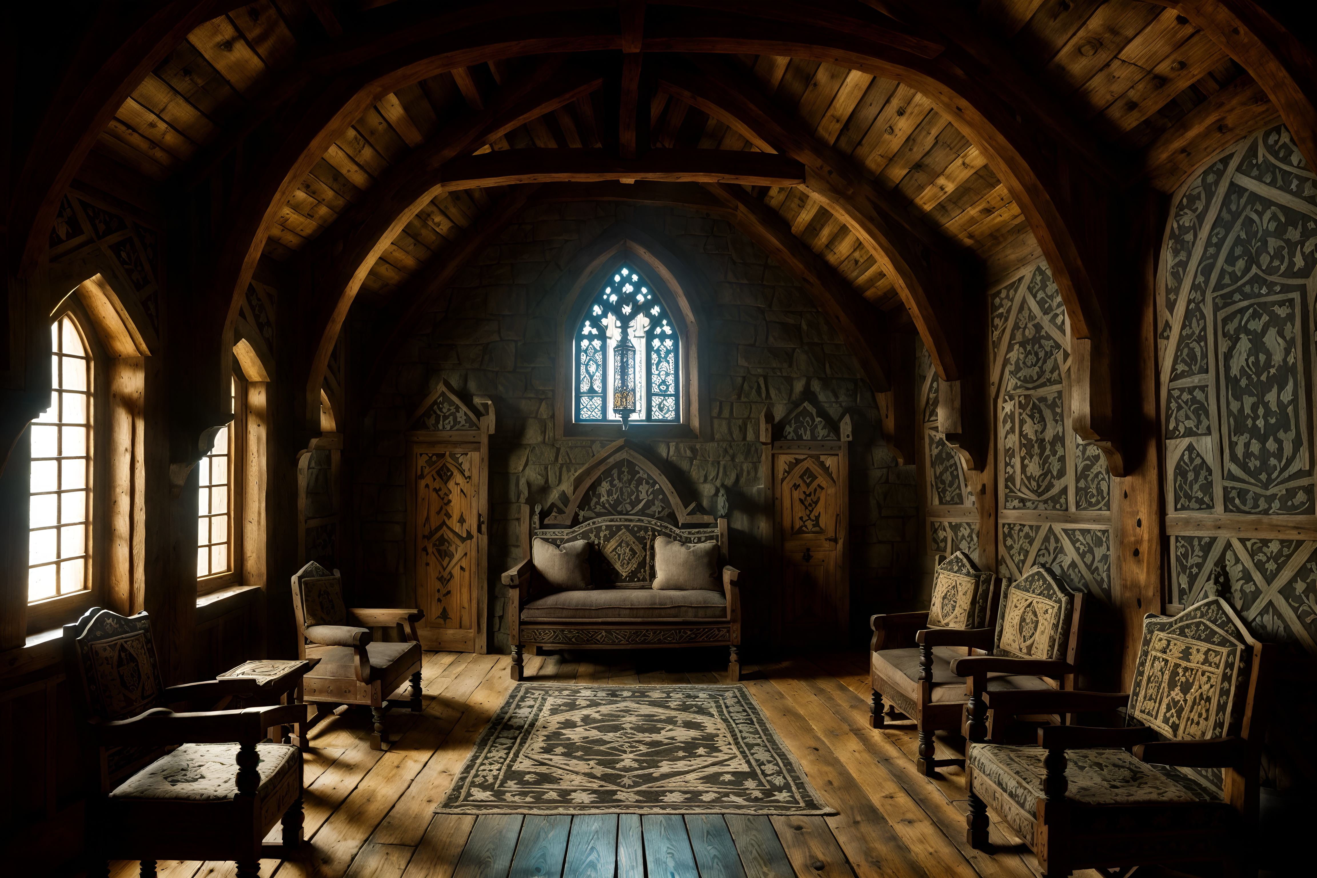 photo from pinterest of medieval-style interior designed (attic interior) . with gothic appearance and stone walls and carved wooden chairs and castle interior and medieval shields on the wall and castle interior and intricate wooden inlay designs and carvings and upholstery on chairs and sofas. . cinematic photo, highly detailed, cinematic lighting, ultra-detailed, ultrarealistic, photorealism, 8k. trending on pinterest. medieval interior design style. masterpiece, cinematic light, ultrarealistic+, photorealistic+, 8k, raw photo, realistic, sharp focus on eyes, (symmetrical eyes), (intact eyes), hyperrealistic, highest quality, best quality, , highly detailed, masterpiece, best quality, extremely detailed 8k wallpaper, masterpiece, best quality, ultra-detailed, best shadow, detailed background, detailed face, detailed eyes, high contrast, best illumination, detailed face, dulux, caustic, dynamic angle, detailed glow. dramatic lighting. highly detailed, insanely detailed hair, symmetrical, intricate details, professionally retouched, 8k high definition. strong bokeh. award winning photo.
