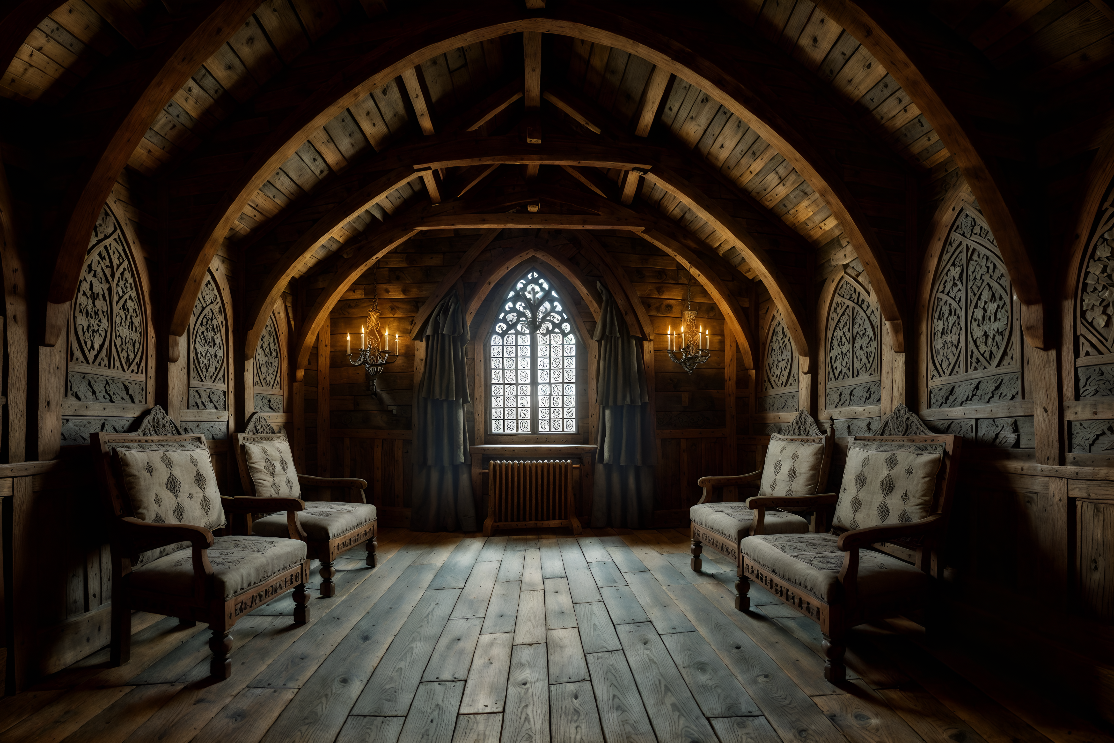 photo from pinterest of medieval-style interior designed (attic interior) . with gothic appearance and stone walls and carved wooden chairs and castle interior and medieval shields on the wall and castle interior and intricate wooden inlay designs and carvings and upholstery on chairs and sofas. . cinematic photo, highly detailed, cinematic lighting, ultra-detailed, ultrarealistic, photorealism, 8k. trending on pinterest. medieval interior design style. masterpiece, cinematic light, ultrarealistic+, photorealistic+, 8k, raw photo, realistic, sharp focus on eyes, (symmetrical eyes), (intact eyes), hyperrealistic, highest quality, best quality, , highly detailed, masterpiece, best quality, extremely detailed 8k wallpaper, masterpiece, best quality, ultra-detailed, best shadow, detailed background, detailed face, detailed eyes, high contrast, best illumination, detailed face, dulux, caustic, dynamic angle, detailed glow. dramatic lighting. highly detailed, insanely detailed hair, symmetrical, intricate details, professionally retouched, 8k high definition. strong bokeh. award winning photo.