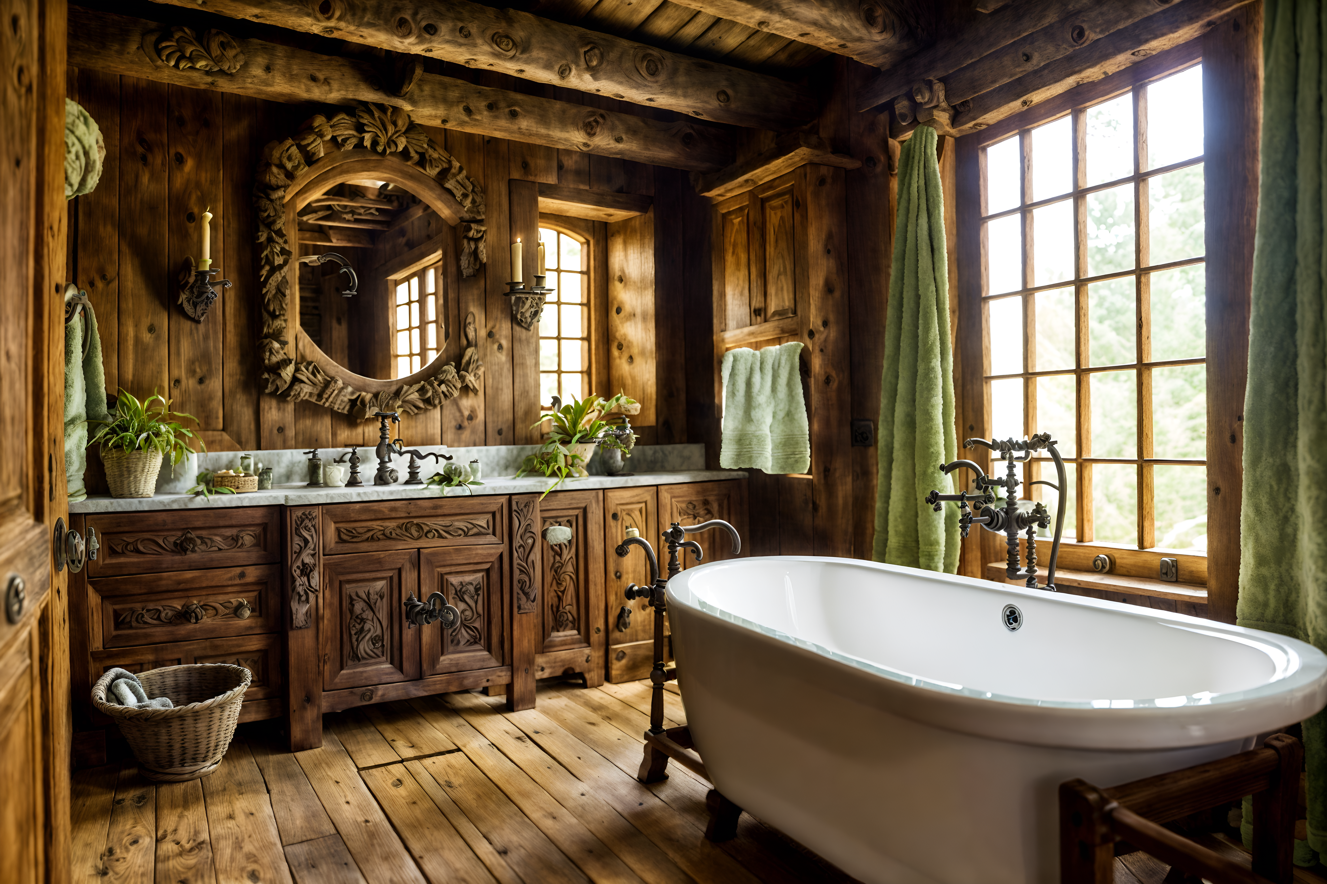 photo from pinterest of medieval-style interior designed (bathroom interior) with plant and waste basket and bath towel and bathroom cabinet and shower and bathroom sink with faucet and bath rail and mirror. . with heavy furniture pieces and timber beams and stone or wooden floor and castle interior and velvet, chenille, damask, and brocade draperies and fabrics and castle interior and carved wooden chairs and intricate wooden inlay designs and carvings. . cinematic photo, highly detailed, cinematic lighting, ultra-detailed, ultrarealistic, photorealism, 8k. trending on pinterest. medieval interior design style. masterpiece, cinematic light, ultrarealistic+, photorealistic+, 8k, raw photo, realistic, sharp focus on eyes, (symmetrical eyes), (intact eyes), hyperrealistic, highest quality, best quality, , highly detailed, masterpiece, best quality, extremely detailed 8k wallpaper, masterpiece, best quality, ultra-detailed, best shadow, detailed background, detailed face, detailed eyes, high contrast, best illumination, detailed face, dulux, caustic, dynamic angle, detailed glow. dramatic lighting. highly detailed, insanely detailed hair, symmetrical, intricate details, professionally retouched, 8k high definition. strong bokeh. award winning photo.