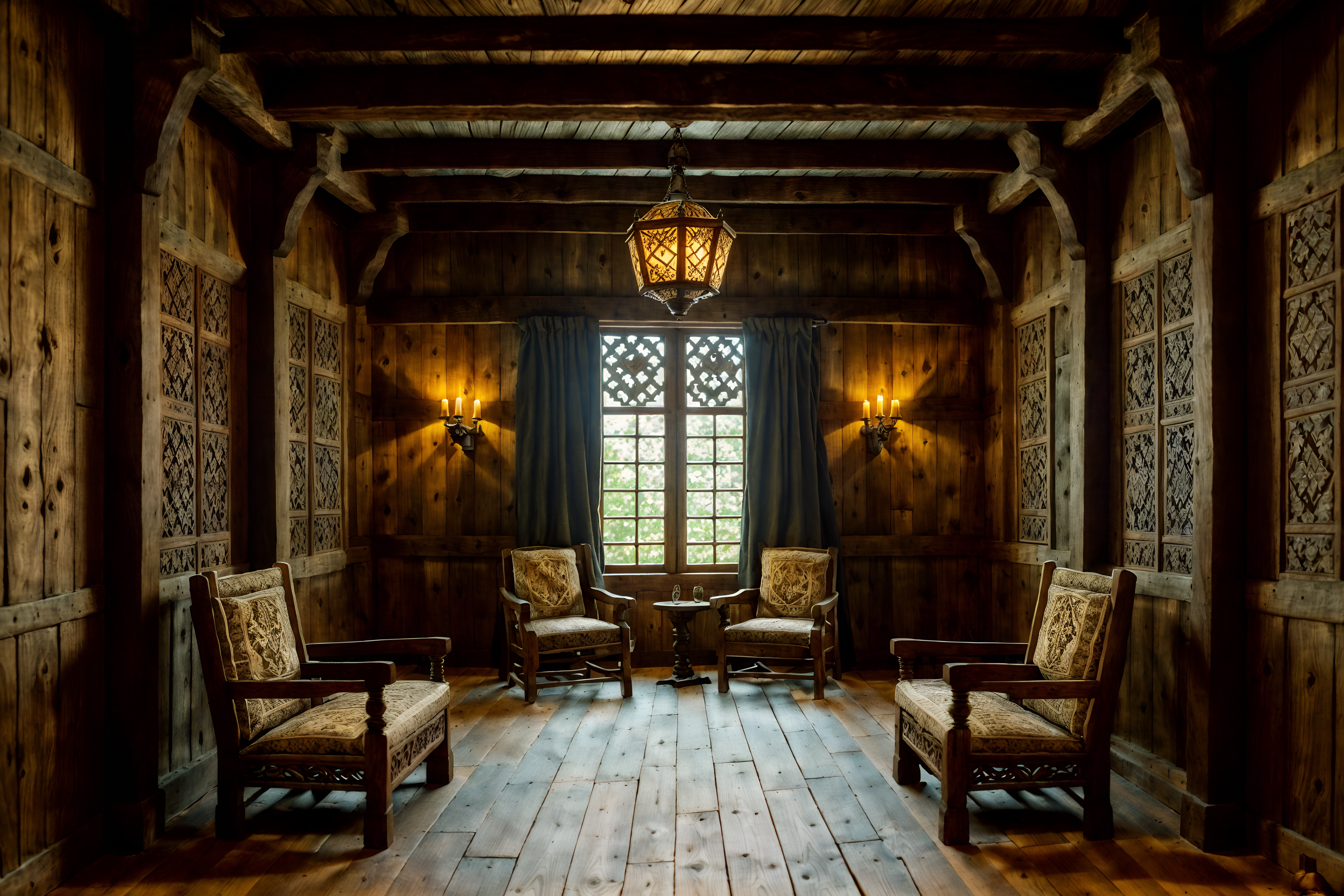 medieval interiorsinterior decorate this kitchen living combo with medieval style. . . with bookshelves and sofa and worktops and refrigerator and rug and occasional tables and plant and kitchen cabinets. . with intricate wooden inlay designs and carvings and timber walls and stone walls and carved wooden benches and castle interior and deep colors like red, gold, or blue and heavy furniture pieces and stone or wooden floor. . .interior decorate this classroom with medieval style. . . with whiteboard and teacher desk and chalkboard and erasers and books and chairs and desks and pencils. . with gothic appearance and carved wooden chairs and castle interior and velvet, chenille, damask, and brocade draperies and fabrics and stone or wooden floor and timber beams and carved wooden benches and carved wooden tables. . .interior decorate this garage gym with medieval style. . . with crosstrainer and storage racks and bench press and exercise bicycle and garage gym and dumbbell stand and squat rack and crosstrainer. . with carved wooden tables and upholstery on chairs and sofas and carved wooden chairs and castle interior and timber beams and timber walls and castle interior and stone walls. . .interior decorate this study room with medieval style. . . with writing desk and plant and lounge chair and desk lamp and cabinets and bookshelves and office chair and writing desk. . with deep colors like red, gold, or blue and heavy furniture pieces and castle interior and medieval shields on the wall and intricate wooden inlay designs and carvings and castle interior and carved wooden chairs and gothic appearance. . .interior decorate this living room with medieval style. . . with furniture and televisions and plant and bookshelves and electric lamps and sofa and rug and occasional tables. . with castle interior and carved wooden chairs and gothic appearance and carved wooden benches and timber beams and stone walls and castle interior and deep colors like red, gold, or blue. . .interior decorate this library with medieval style. . . with chairs and periodicals and computer terminals and reading tables and study lamps and card catalogs and checkout desk and bookshelves. . with carved wooden benches and timber beams and upholstery on chairs and sofas and heavy furniture pieces and medieval shields on the wall and stone walls and timber walls and velvet, chenille, damask, and brocade draperies and fabrics. . .interior decorate this dining room with medieval style. . . with light or chandelier and dining table chairs and dining table and vase and painting or photo on wall and plant and plates, cutlery and glasses on dining table and bookshelves. . with deep colors like red, gold, or blue and medieval shields on the wall and gothic appearance and carved wooden tables and timber walls and castle interior and heavy furniture pieces and carved wooden benches. . .interior decorate this garage with medieval style. . . with garage door and concrete floor and bicycles and cars and lawnmower and storage racks and garage door. . with carved wooden tables and timber beams and heavy furniture pieces and castle interior and intricate wooden inlay designs and carvings and stone or wooden floor and timber walls and deep colors like red, gold, or blue. . .interior decorate this coworking space with medieval style. . . with lounge chairs and seating area with sofa and office chairs and office desks and lounge chairs. . with heavy furniture pieces and deep colors like red, gold, or blue and timber walls and carved wooden benches and carved wooden tables and stone walls and castle interior and gothic appearance. . .