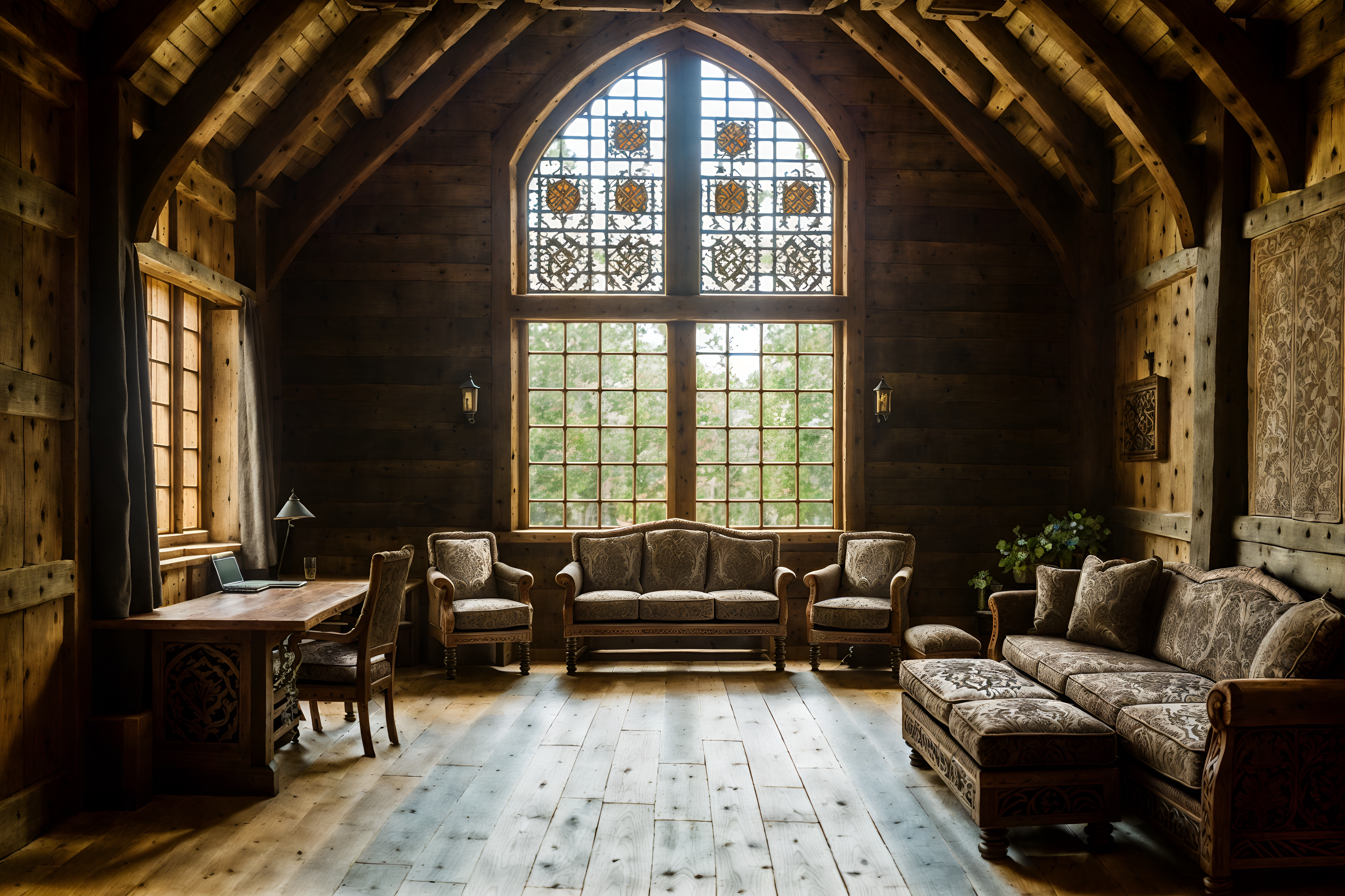 photo from pinterest of medieval-style interior designed (coworking space interior) with office desks and seating area with sofa and lounge chairs and office chairs and office desks. . with timber beams and castle interior and stone or wooden floor and upholstery on chairs and sofas and carved wooden tables and stone walls and carved wooden benches and velvet, chenille, damask, and brocade draperies and fabrics. . cinematic photo, highly detailed, cinematic lighting, ultra-detailed, ultrarealistic, photorealism, 8k. trending on pinterest. medieval interior design style. masterpiece, cinematic light, ultrarealistic+, photorealistic+, 8k, raw photo, realistic, sharp focus on eyes, (symmetrical eyes), (intact eyes), hyperrealistic, highest quality, best quality, , highly detailed, masterpiece, best quality, extremely detailed 8k wallpaper, masterpiece, best quality, ultra-detailed, best shadow, detailed background, detailed face, detailed eyes, high contrast, best illumination, detailed face, dulux, caustic, dynamic angle, detailed glow. dramatic lighting. highly detailed, insanely detailed hair, symmetrical, intricate details, professionally retouched, 8k high definition. strong bokeh. award winning photo.