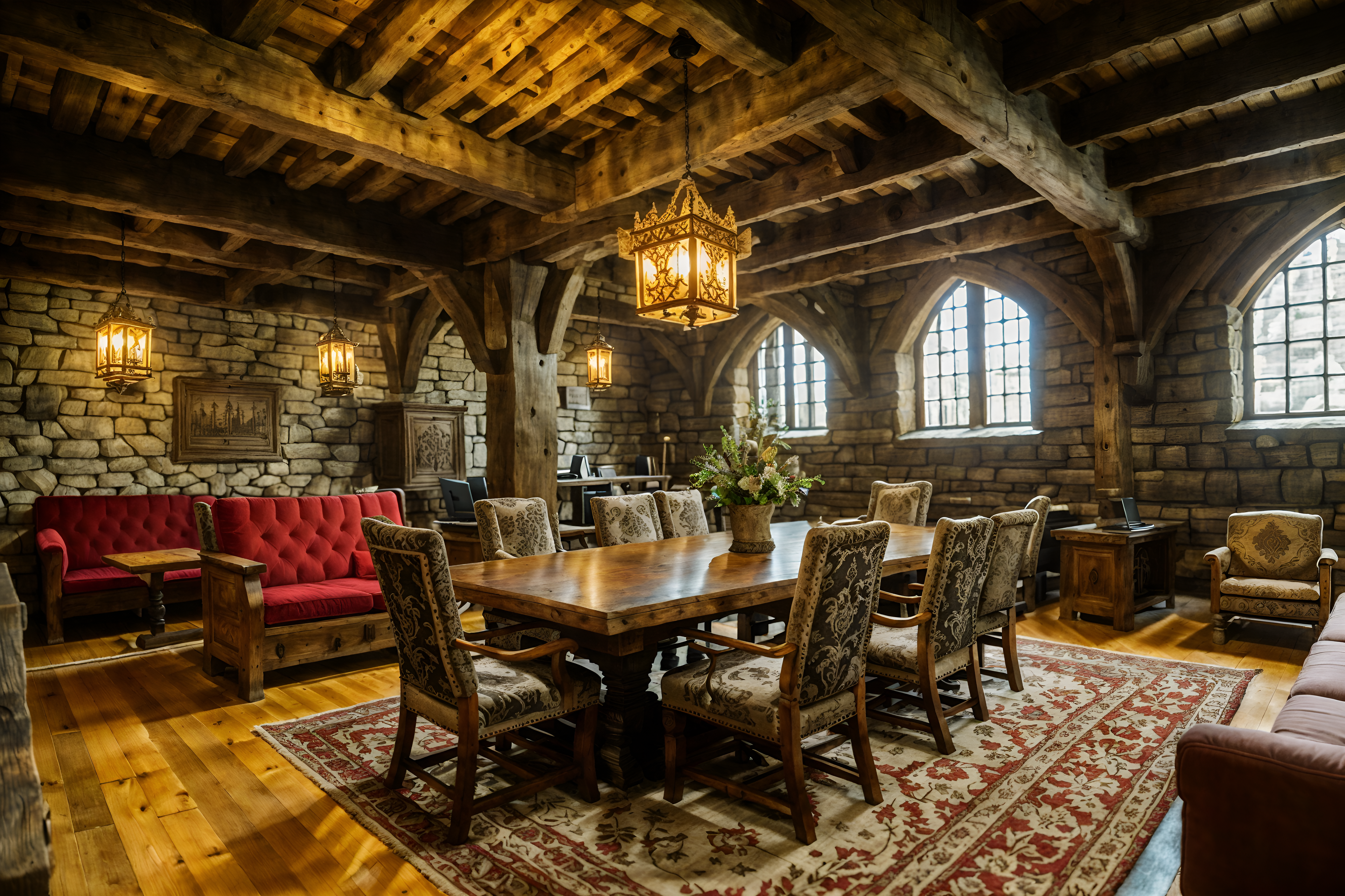 medieval interiorsinterior decorate this conference hall with medieval style. . . with whiteboard and office chairs and water glasses and projector and microphones and conference table and speaker phone and flipchart. . with gothic appearance and timber walls and medieval shields on the wall and carved wooden benches and castle interior and castle interior and carved wooden chairs and stone walls. . .interior decorate this music stage with medieval style. . . with musical instruments and stage monitors and drum kit and guitar stands and stage lights and cables and microphones and backdrop. . with gothic appearance and castle interior and deep colors like red, gold, or blue and castle interior and carved wooden tables and medieval shields on the wall and timber walls and stone walls. . .interior decorate this parliament with medieval style. . . with coat of arms and ceremonial mace and voting buttons and dispatch boxes and parliamentary seats and speaker podium and flags and hansard reporters. . with heavy furniture pieces and castle interior and deep colors like red, gold, or blue and upholstery on chairs and sofas and timber beams and medieval shields on the wall and gothic appearance and stone walls. . .interior decorate this mudroom with medieval style. . . with storage drawers and cabinets and high up storage and storage baskets and cubbies and shelves for shoes and wall hooks for coats and a bench. . with stone walls and carved wooden chairs and castle interior and upholstery on chairs and sofas and velvet, chenille, damask, and brocade draperies and fabrics and castle interior and timber beams and carved wooden benches. . .interior decorate this kitchen with medieval style. . . with refrigerator and sink and kitchen cabinets and worktops and stove and plant and refrigerator. . with timber beams and velvet, chenille, damask, and brocade draperies and fabrics and stone walls and stone or wooden floor and medieval shields on the wall and castle interior and upholstery on chairs and sofas and deep colors like red, gold, or blue. . .interior decorate this pole dance studio with medieval style. . . with dim lighting and mirrors and dance poles and yoga mats and sound system and grip aids and exercise equipment and comfortable seating. . with carved wooden benches and timber walls and stone walls and castle interior and gothic appearance and timber beams and intricate wooden inlay designs and carvings and castle interior. . .interior decorate this lecture hall with medieval style. . . with speaker system and lecture notes and chalkboard and projection screen and tiered seating and laptop and microphone and projector. . with velvet, chenille, damask, and brocade draperies and fabrics and heavy furniture pieces and timber beams and carved wooden tables and medieval shields on the wall and intricate wooden inlay designs and carvings and deep colors like red, gold, or blue and castle interior. . .interior decorate this garage with medieval style. . . with garage door and concrete floor and bicycles and cars and lawnmower and storage racks and garage door. . with carved wooden tables and timber beams and heavy furniture pieces and castle interior and intricate wooden inlay designs and carvings and stone or wooden floor and timber walls and deep colors like red, gold, or blue. . .interior decorate this movie set with medieval style. . . with cinematic lighting and movie set and movie set and professional lighting equipment and film set interior and ring light and equipment table and camera on tripod. . with gothic appearance and castle interior and castle interior and carved wooden benches and stone walls and carved wooden chairs and stone or wooden floor and timber beams. . .