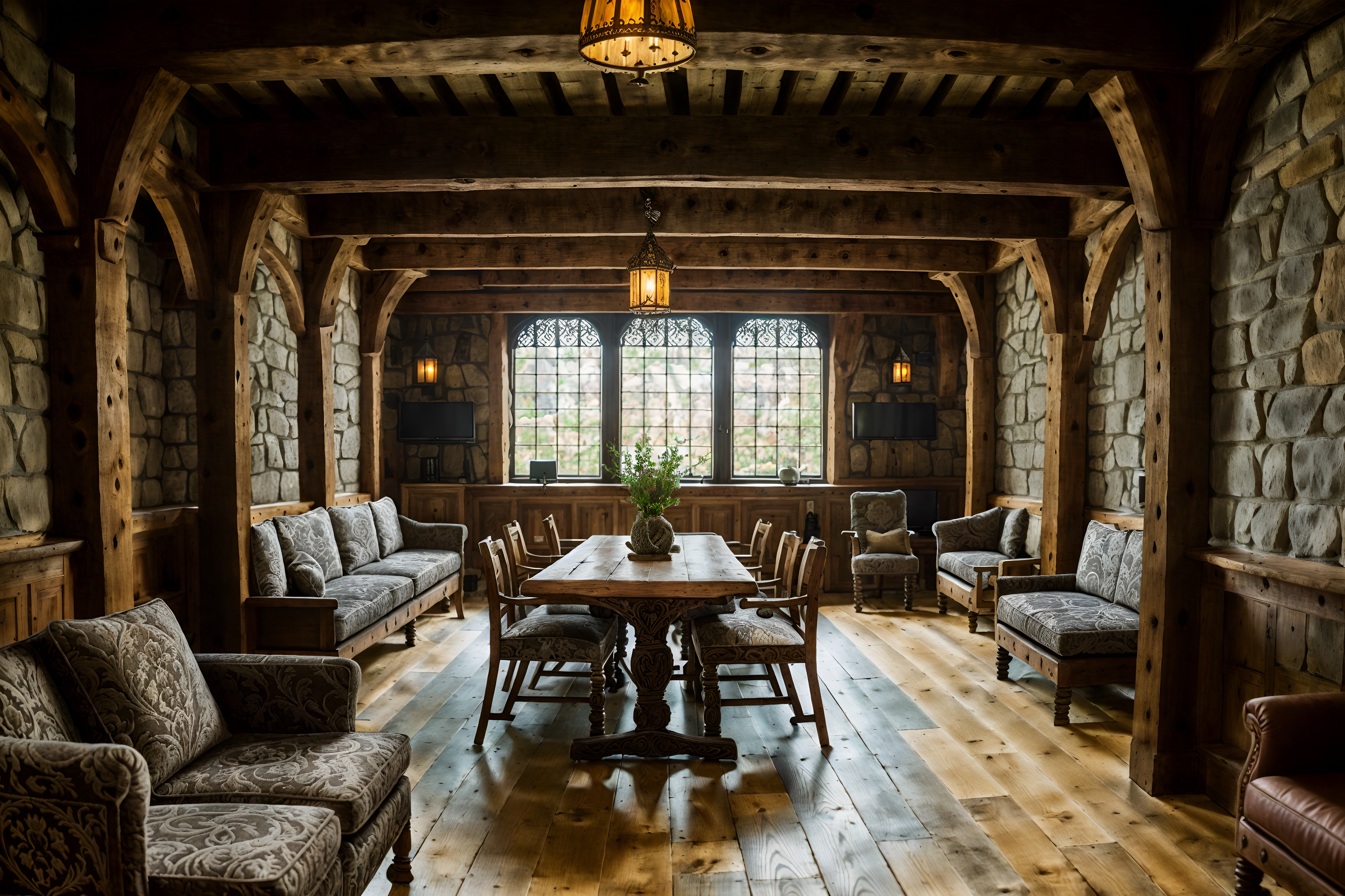 photo from pinterest of medieval-style interior designed (coworking space interior) with office desks and seating area with sofa and lounge chairs and office chairs and office desks. . with timber beams and castle interior and stone or wooden floor and upholstery on chairs and sofas and carved wooden tables and stone walls and carved wooden benches and velvet, chenille, damask, and brocade draperies and fabrics. . cinematic photo, highly detailed, cinematic lighting, ultra-detailed, ultrarealistic, photorealism, 8k. trending on pinterest. medieval interior design style. masterpiece, cinematic light, ultrarealistic+, photorealistic+, 8k, raw photo, realistic, sharp focus on eyes, (symmetrical eyes), (intact eyes), hyperrealistic, highest quality, best quality, , highly detailed, masterpiece, best quality, extremely detailed 8k wallpaper, masterpiece, best quality, ultra-detailed, best shadow, detailed background, detailed face, detailed eyes, high contrast, best illumination, detailed face, dulux, caustic, dynamic angle, detailed glow. dramatic lighting. highly detailed, insanely detailed hair, symmetrical, intricate details, professionally retouched, 8k high definition. strong bokeh. award winning photo.