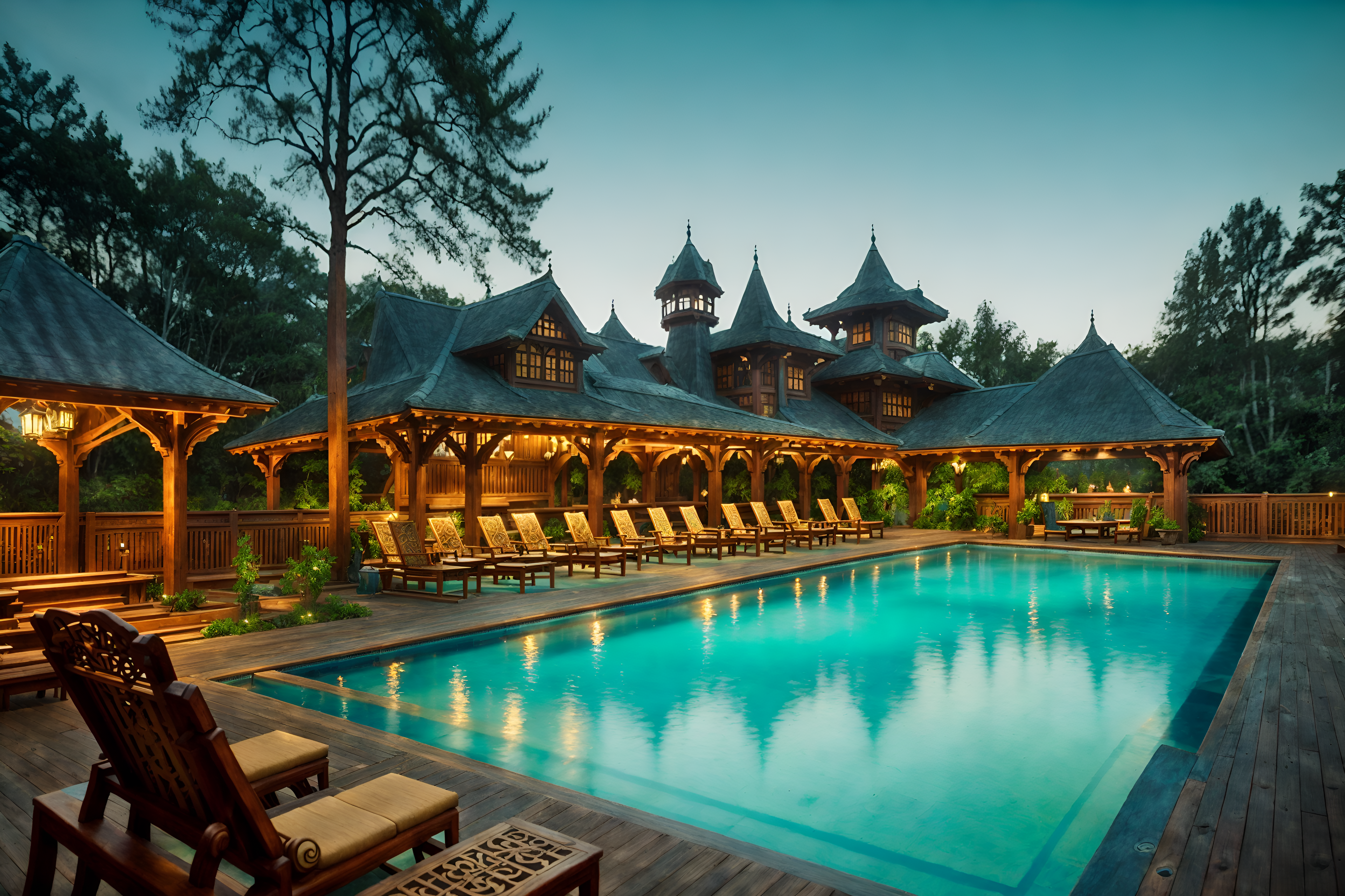 photo from pinterest of medieval-style designed (outdoor pool area ) with pool lounge chairs and pool lights and pool and pool lounge chairs. . with carved wooden benches and intricate wooden inlay designs and carvings and castle and deep colors like red, gold, or blue and timber beams and carved wooden tables and castle and carved wooden chairs. . cinematic photo, highly detailed, cinematic lighting, ultra-detailed, ultrarealistic, photorealism, 8k. trending on pinterest. medieval design style. masterpiece, cinematic light, ultrarealistic+, photorealistic+, 8k, raw photo, realistic, sharp focus on eyes, (symmetrical eyes), (intact eyes), hyperrealistic, highest quality, best quality, , highly detailed, masterpiece, best quality, extremely detailed 8k wallpaper, masterpiece, best quality, ultra-detailed, best shadow, detailed background, detailed face, detailed eyes, high contrast, best illumination, detailed face, dulux, caustic, dynamic angle, detailed glow. dramatic lighting. highly detailed, insanely detailed hair, symmetrical, intricate details, professionally retouched, 8k high definition. strong bokeh. award winning photo.