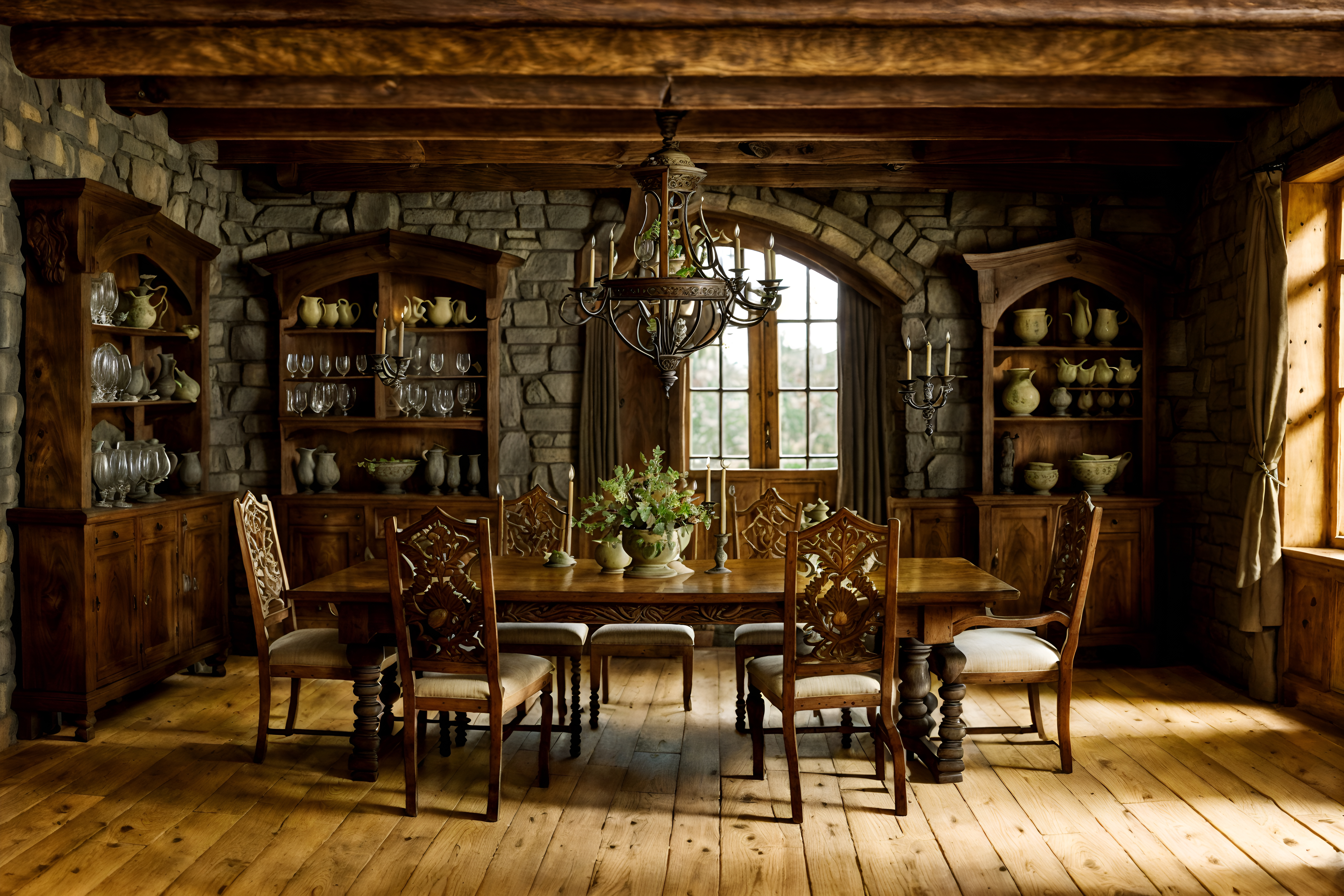 photo from pinterest of medieval-style interior designed (dining room interior) with plates, cutlery and glasses on dining table and bookshelves and plant and vase and dining table chairs and dining table and painting or photo on wall and light or chandelier. . with stone or wooden floor and castle interior and timber walls and carved wooden chairs and upholstery on chairs and sofas and castle interior and medieval shields on the wall and stone walls. . cinematic photo, highly detailed, cinematic lighting, ultra-detailed, ultrarealistic, photorealism, 8k. trending on pinterest. medieval interior design style. masterpiece, cinematic light, ultrarealistic+, photorealistic+, 8k, raw photo, realistic, sharp focus on eyes, (symmetrical eyes), (intact eyes), hyperrealistic, highest quality, best quality, , highly detailed, masterpiece, best quality, extremely detailed 8k wallpaper, masterpiece, best quality, ultra-detailed, best shadow, detailed background, detailed face, detailed eyes, high contrast, best illumination, detailed face, dulux, caustic, dynamic angle, detailed glow. dramatic lighting. highly detailed, insanely detailed hair, symmetrical, intricate details, professionally retouched, 8k high definition. strong bokeh. award winning photo.
