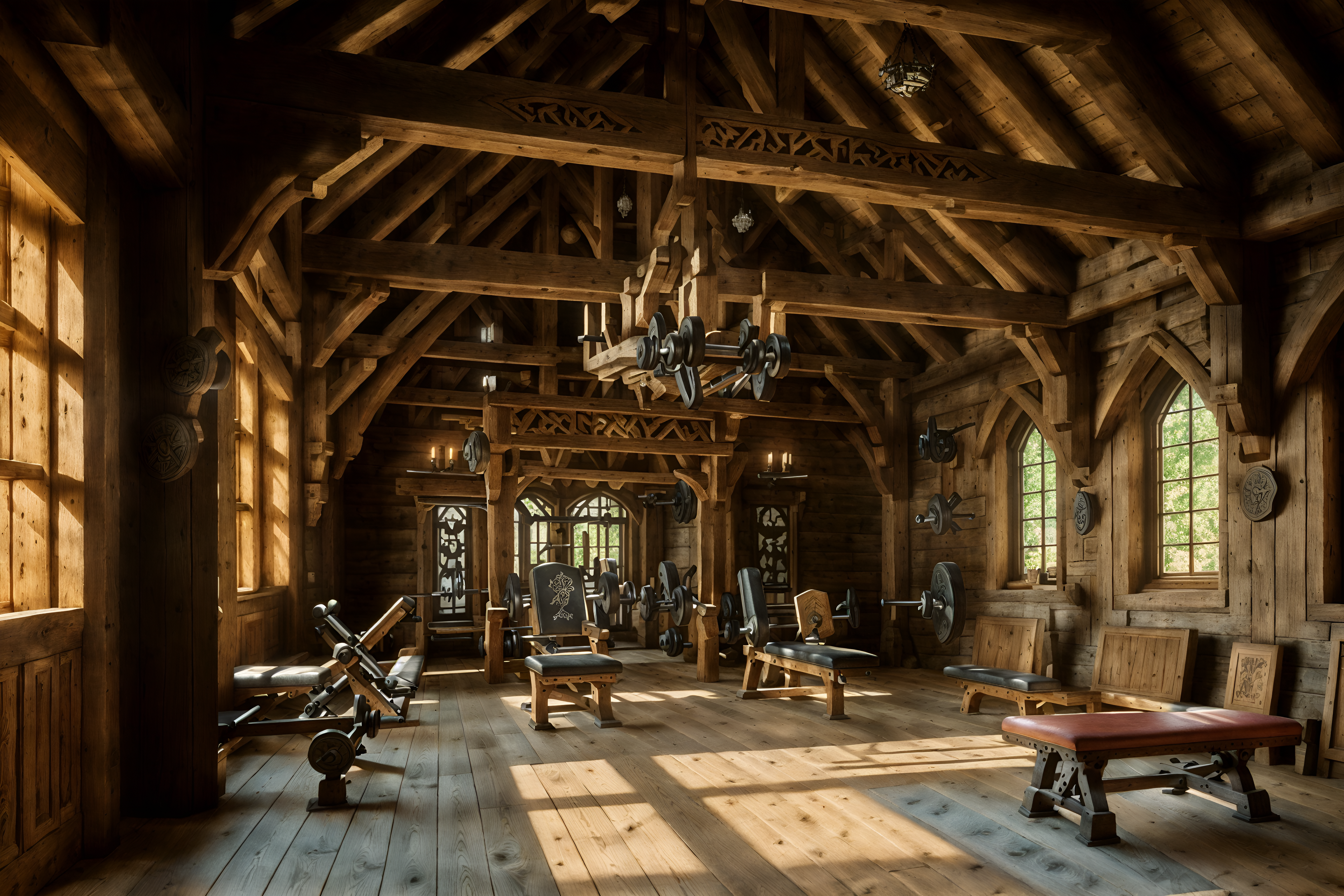 photo from pinterest of medieval-style interior designed (fitness gym interior) with dumbbell stand and crosstrainer and bench press and exercise bicycle and squat rack and dumbbell stand. . with timber beams and castle interior and carved wooden chairs and castle interior and stone or wooden floor and timber walls and gothic appearance and carved wooden benches. . cinematic photo, highly detailed, cinematic lighting, ultra-detailed, ultrarealistic, photorealism, 8k. trending on pinterest. medieval interior design style. masterpiece, cinematic light, ultrarealistic+, photorealistic+, 8k, raw photo, realistic, sharp focus on eyes, (symmetrical eyes), (intact eyes), hyperrealistic, highest quality, best quality, , highly detailed, masterpiece, best quality, extremely detailed 8k wallpaper, masterpiece, best quality, ultra-detailed, best shadow, detailed background, detailed face, detailed eyes, high contrast, best illumination, detailed face, dulux, caustic, dynamic angle, detailed glow. dramatic lighting. highly detailed, insanely detailed hair, symmetrical, intricate details, professionally retouched, 8k high definition. strong bokeh. award winning photo.