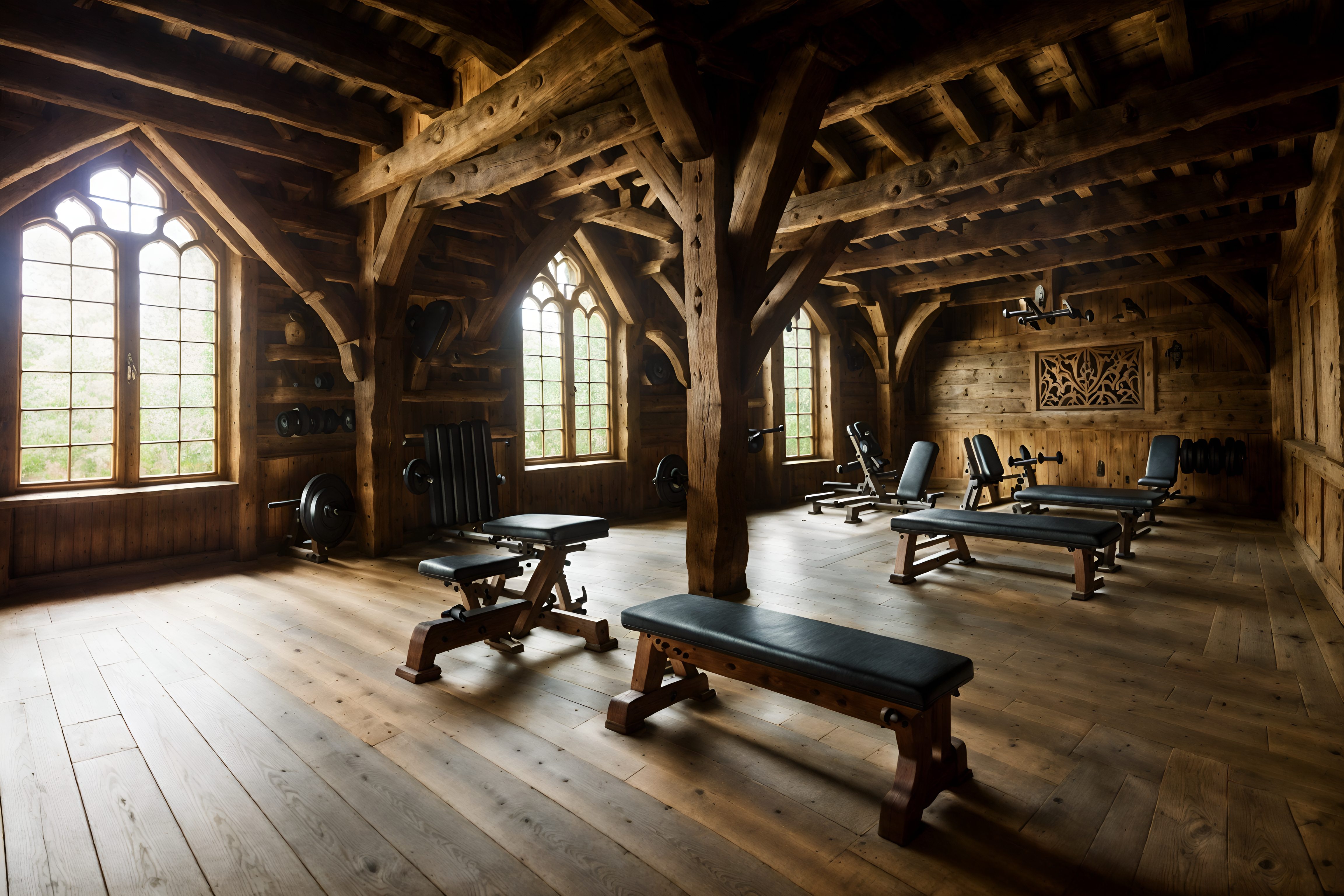 photo from pinterest of medieval-style interior designed (fitness gym interior) with dumbbell stand and crosstrainer and bench press and exercise bicycle and squat rack and dumbbell stand. . with timber beams and castle interior and carved wooden chairs and castle interior and stone or wooden floor and timber walls and gothic appearance and carved wooden benches. . cinematic photo, highly detailed, cinematic lighting, ultra-detailed, ultrarealistic, photorealism, 8k. trending on pinterest. medieval interior design style. masterpiece, cinematic light, ultrarealistic+, photorealistic+, 8k, raw photo, realistic, sharp focus on eyes, (symmetrical eyes), (intact eyes), hyperrealistic, highest quality, best quality, , highly detailed, masterpiece, best quality, extremely detailed 8k wallpaper, masterpiece, best quality, ultra-detailed, best shadow, detailed background, detailed face, detailed eyes, high contrast, best illumination, detailed face, dulux, caustic, dynamic angle, detailed glow. dramatic lighting. highly detailed, insanely detailed hair, symmetrical, intricate details, professionally retouched, 8k high definition. strong bokeh. award winning photo.