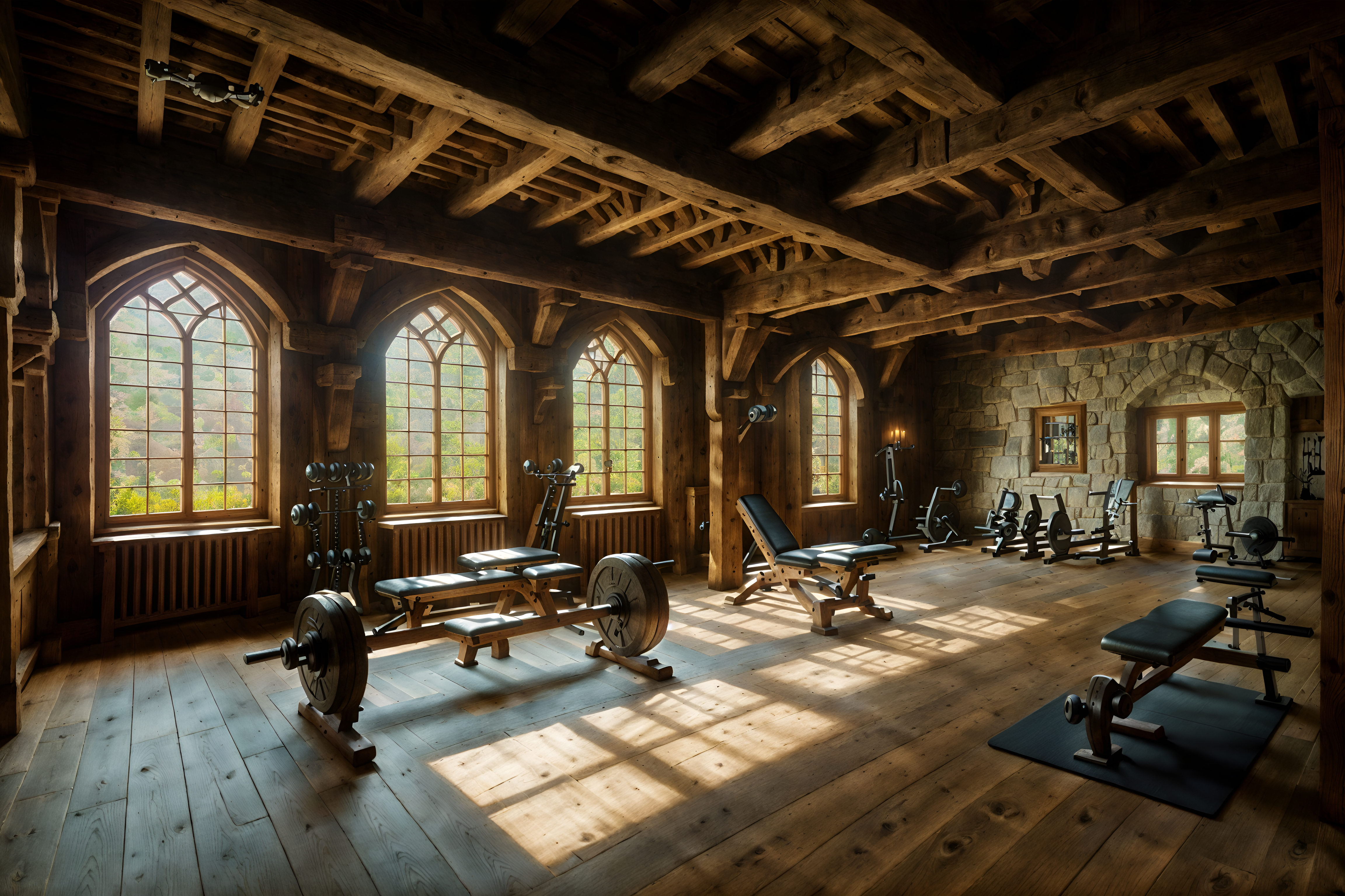 photo from pinterest of medieval-style interior designed (fitness gym interior) with dumbbell stand and crosstrainer and bench press and exercise bicycle and squat rack and dumbbell stand. . with timber beams and castle interior and carved wooden chairs and castle interior and stone or wooden floor and timber walls and gothic appearance and carved wooden benches. . cinematic photo, highly detailed, cinematic lighting, ultra-detailed, ultrarealistic, photorealism, 8k. trending on pinterest. medieval interior design style. masterpiece, cinematic light, ultrarealistic+, photorealistic+, 8k, raw photo, realistic, sharp focus on eyes, (symmetrical eyes), (intact eyes), hyperrealistic, highest quality, best quality, , highly detailed, masterpiece, best quality, extremely detailed 8k wallpaper, masterpiece, best quality, ultra-detailed, best shadow, detailed background, detailed face, detailed eyes, high contrast, best illumination, detailed face, dulux, caustic, dynamic angle, detailed glow. dramatic lighting. highly detailed, insanely detailed hair, symmetrical, intricate details, professionally retouched, 8k high definition. strong bokeh. award winning photo.