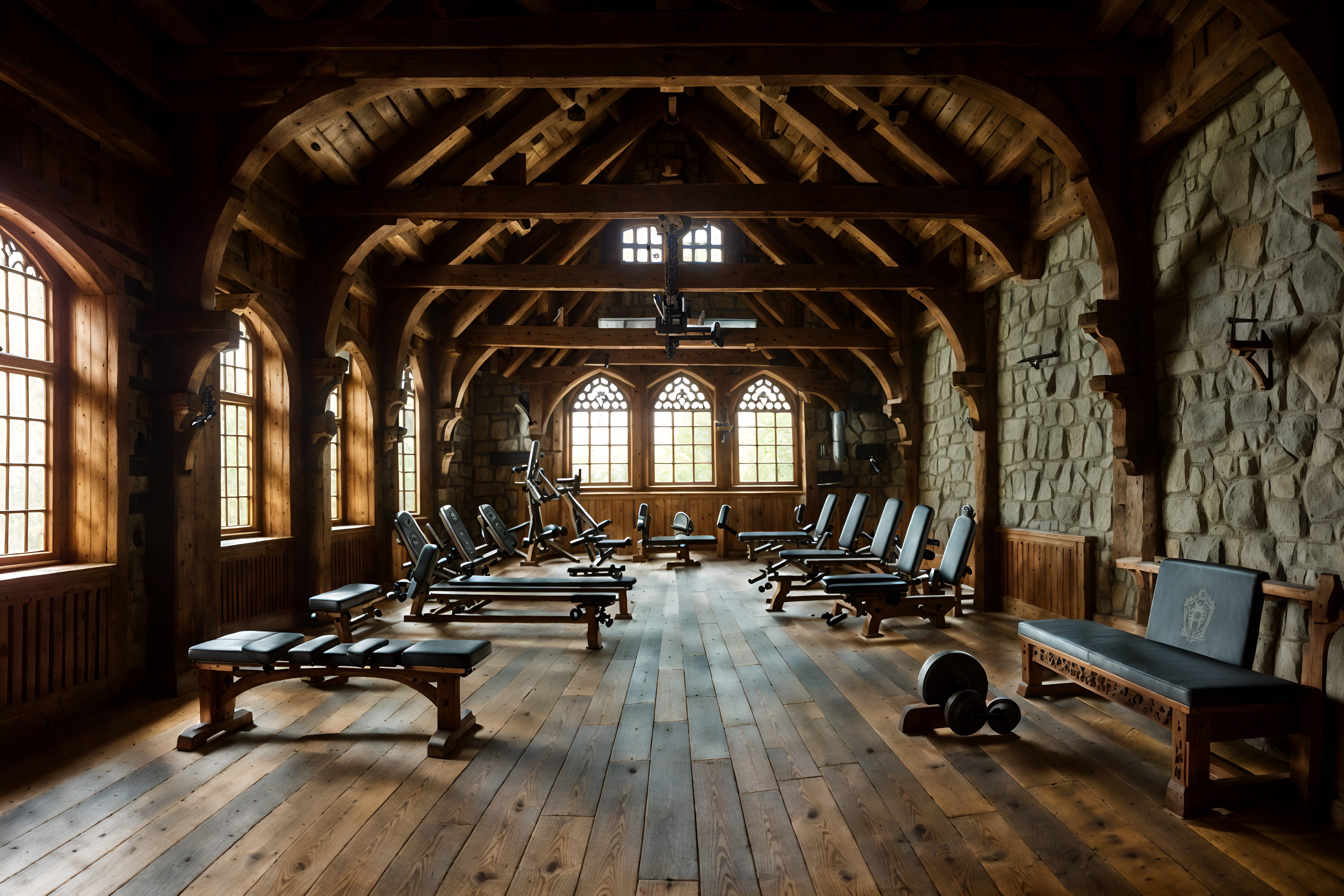 photo from pinterest of medieval-style interior designed (fitness gym interior) with dumbbell stand and crosstrainer and bench press and exercise bicycle and squat rack and dumbbell stand. . with timber beams and castle interior and carved wooden chairs and castle interior and stone or wooden floor and timber walls and gothic appearance and carved wooden benches. . cinematic photo, highly detailed, cinematic lighting, ultra-detailed, ultrarealistic, photorealism, 8k. trending on pinterest. medieval interior design style. masterpiece, cinematic light, ultrarealistic+, photorealistic+, 8k, raw photo, realistic, sharp focus on eyes, (symmetrical eyes), (intact eyes), hyperrealistic, highest quality, best quality, , highly detailed, masterpiece, best quality, extremely detailed 8k wallpaper, masterpiece, best quality, ultra-detailed, best shadow, detailed background, detailed face, detailed eyes, high contrast, best illumination, detailed face, dulux, caustic, dynamic angle, detailed glow. dramatic lighting. highly detailed, insanely detailed hair, symmetrical, intricate details, professionally retouched, 8k high definition. strong bokeh. award winning photo.