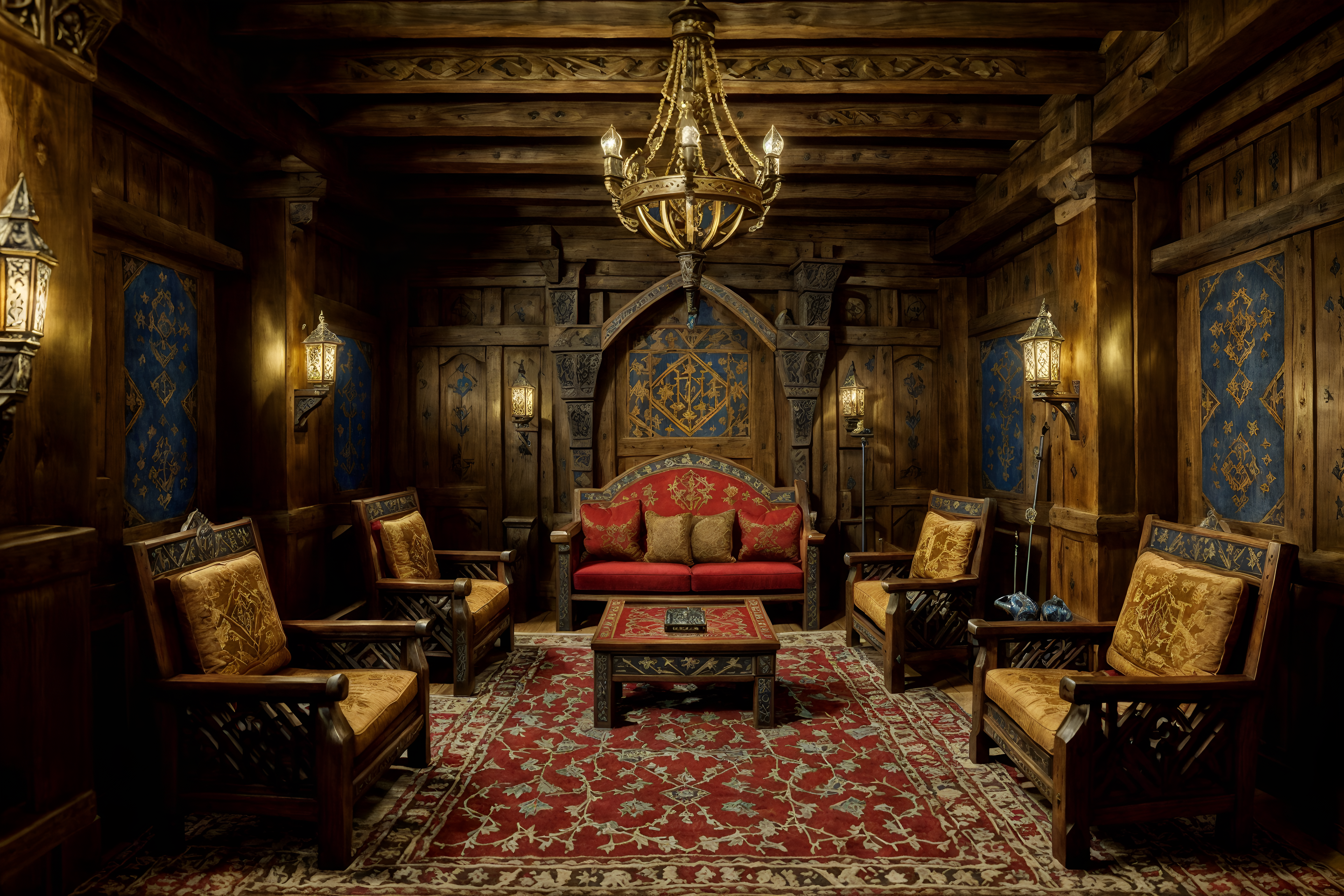 medieval gaming roomsinterior decorate this gaming room with medieval style. . . . with carved wooden chairs and deep colors like red, gold, or blue and gothic appearance and castle interior and stone or wooden floor and upholstery on chairs and sofas and carved wooden benches and castle interior. . .