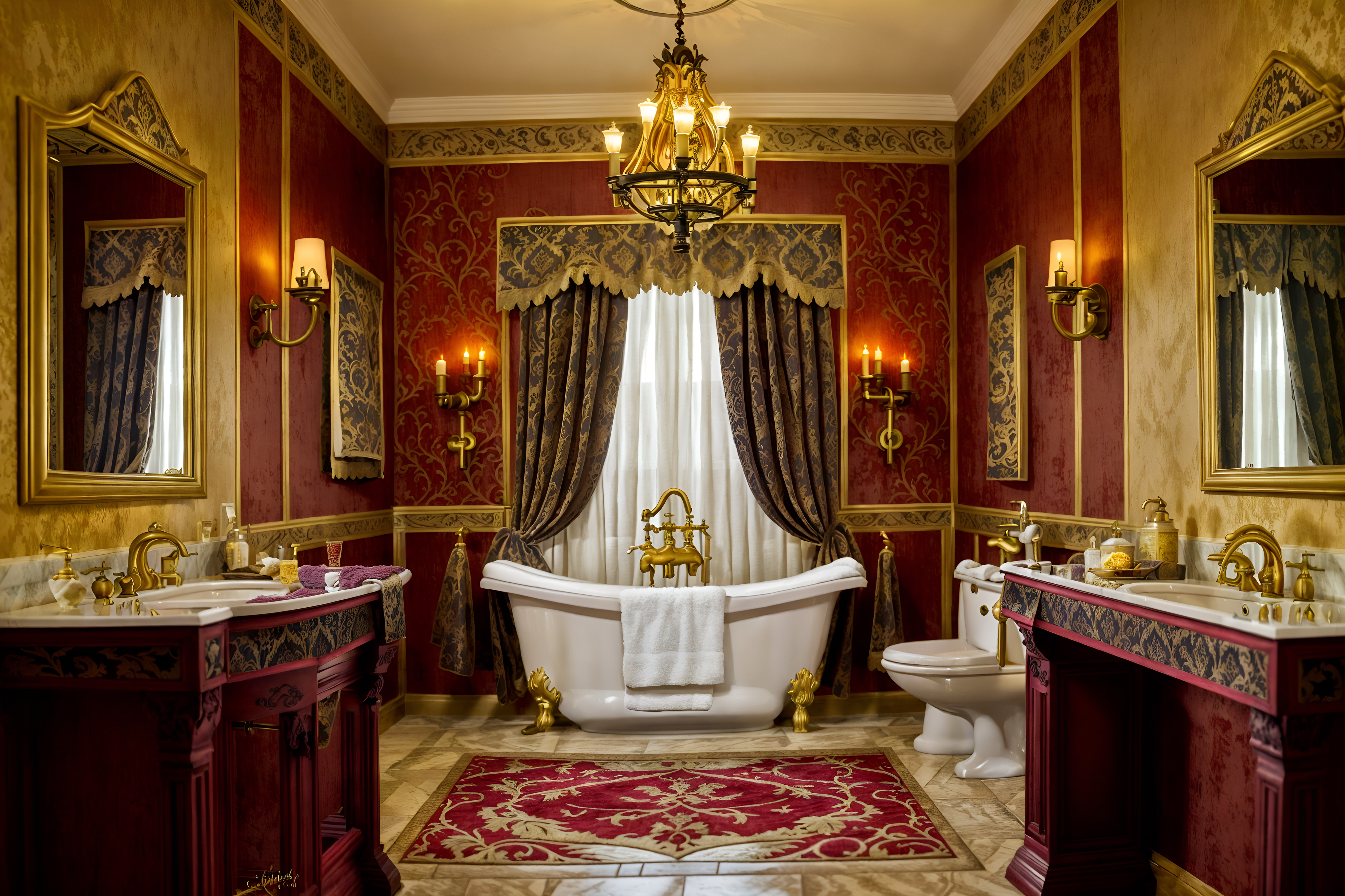 photo from pinterest of medieval-style interior designed (hotel bathroom interior) with bath towel and bathroom cabinet and toilet seat and bathroom sink with faucet and plant and bath rail and mirror and waste basket. . with deep colors like red, gold, or blue and stone walls and velvet, chenille, damask, and brocade draperies and fabrics and gothic appearance and upholstery on chairs and sofas and timber walls and stone or wooden floor and heavy furniture pieces. . cinematic photo, highly detailed, cinematic lighting, ultra-detailed, ultrarealistic, photorealism, 8k. trending on pinterest. medieval interior design style. masterpiece, cinematic light, ultrarealistic+, photorealistic+, 8k, raw photo, realistic, sharp focus on eyes, (symmetrical eyes), (intact eyes), hyperrealistic, highest quality, best quality, , highly detailed, masterpiece, best quality, extremely detailed 8k wallpaper, masterpiece, best quality, ultra-detailed, best shadow, detailed background, detailed face, detailed eyes, high contrast, best illumination, detailed face, dulux, caustic, dynamic angle, detailed glow. dramatic lighting. highly detailed, insanely detailed hair, symmetrical, intricate details, professionally retouched, 8k high definition. strong bokeh. award winning photo.