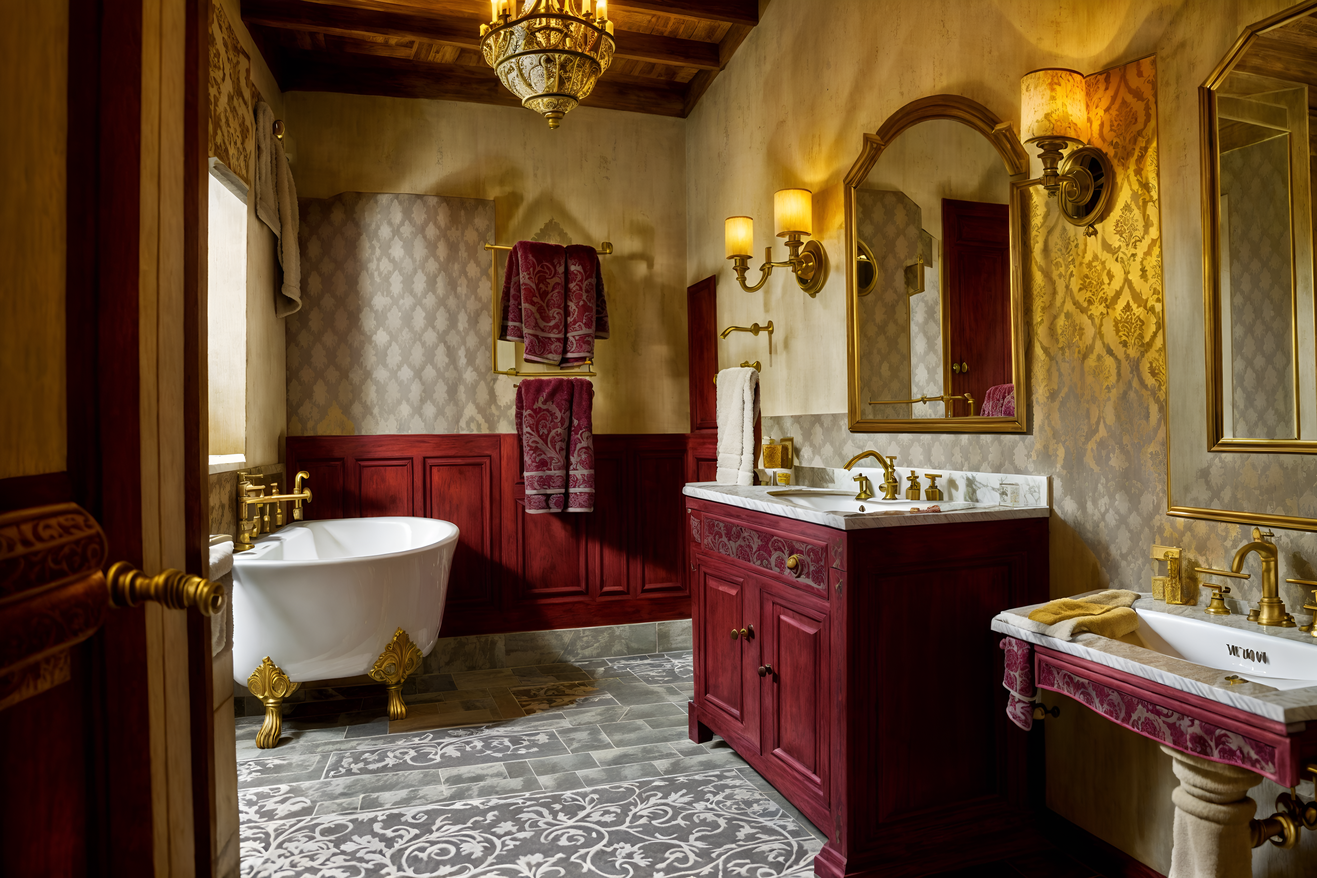 photo from pinterest of medieval-style interior designed (hotel bathroom interior) with bath towel and bathroom cabinet and toilet seat and bathroom sink with faucet and plant and bath rail and mirror and waste basket. . with deep colors like red, gold, or blue and stone walls and velvet, chenille, damask, and brocade draperies and fabrics and gothic appearance and upholstery on chairs and sofas and timber walls and stone or wooden floor and heavy furniture pieces. . cinematic photo, highly detailed, cinematic lighting, ultra-detailed, ultrarealistic, photorealism, 8k. trending on pinterest. medieval interior design style. masterpiece, cinematic light, ultrarealistic+, photorealistic+, 8k, raw photo, realistic, sharp focus on eyes, (symmetrical eyes), (intact eyes), hyperrealistic, highest quality, best quality, , highly detailed, masterpiece, best quality, extremely detailed 8k wallpaper, masterpiece, best quality, ultra-detailed, best shadow, detailed background, detailed face, detailed eyes, high contrast, best illumination, detailed face, dulux, caustic, dynamic angle, detailed glow. dramatic lighting. highly detailed, insanely detailed hair, symmetrical, intricate details, professionally retouched, 8k high definition. strong bokeh. award winning photo.