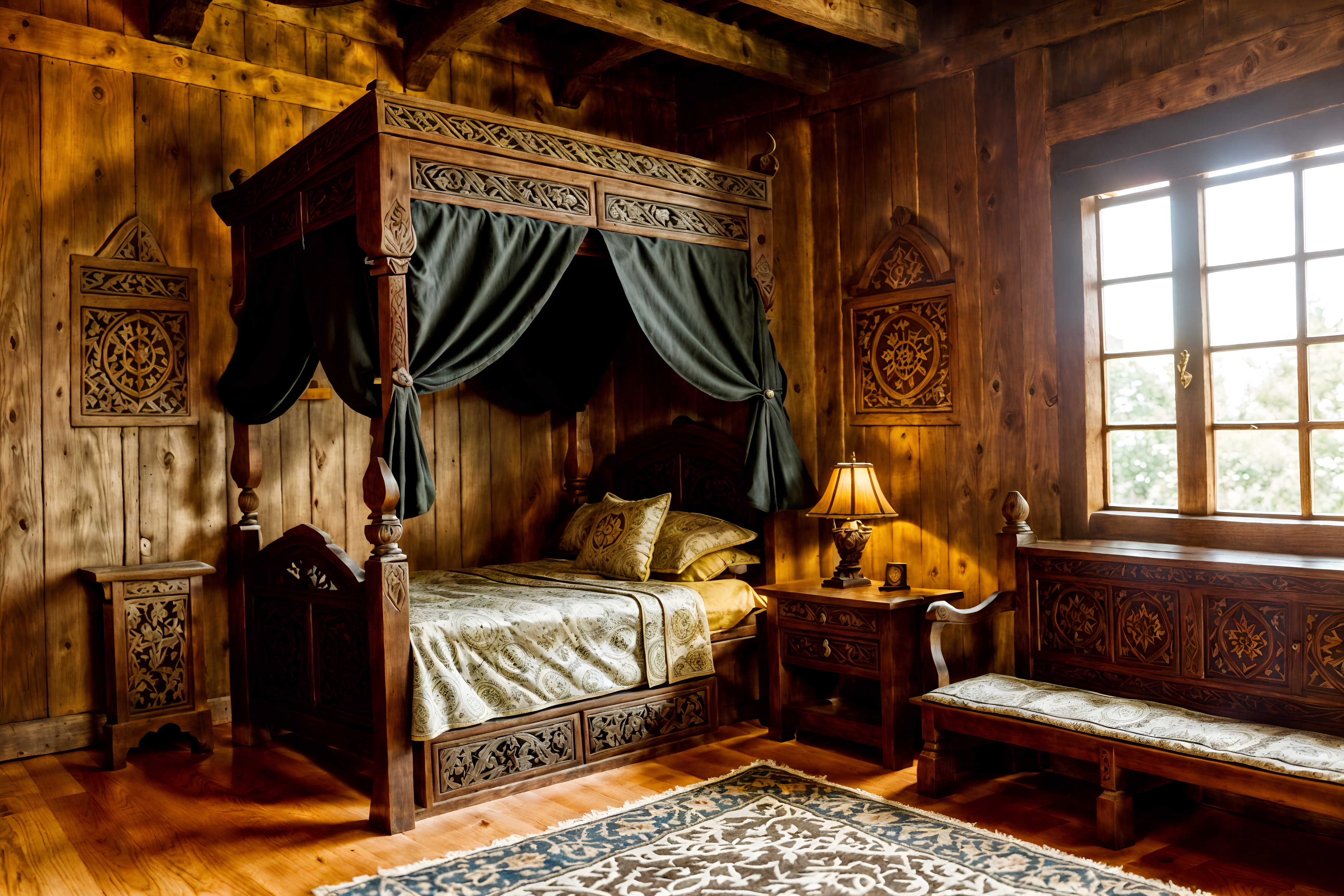 photo from pinterest of medieval-style interior designed (kids room interior) with storage bench or ottoman and dresser closet and bed and bedside table or night stand and headboard and plant and night light and mirror. . with castle interior and carved wooden tables and carved wooden benches and medieval shields on the wall and stone or wooden floor and stone walls and intricate wooden inlay designs and carvings and timber beams. . cinematic photo, highly detailed, cinematic lighting, ultra-detailed, ultrarealistic, photorealism, 8k. trending on pinterest. medieval interior design style. masterpiece, cinematic light, ultrarealistic+, photorealistic+, 8k, raw photo, realistic, sharp focus on eyes, (symmetrical eyes), (intact eyes), hyperrealistic, highest quality, best quality, , highly detailed, masterpiece, best quality, extremely detailed 8k wallpaper, masterpiece, best quality, ultra-detailed, best shadow, detailed background, detailed face, detailed eyes, high contrast, best illumination, detailed face, dulux, caustic, dynamic angle, detailed glow. dramatic lighting. highly detailed, insanely detailed hair, symmetrical, intricate details, professionally retouched, 8k high definition. strong bokeh. award winning photo.