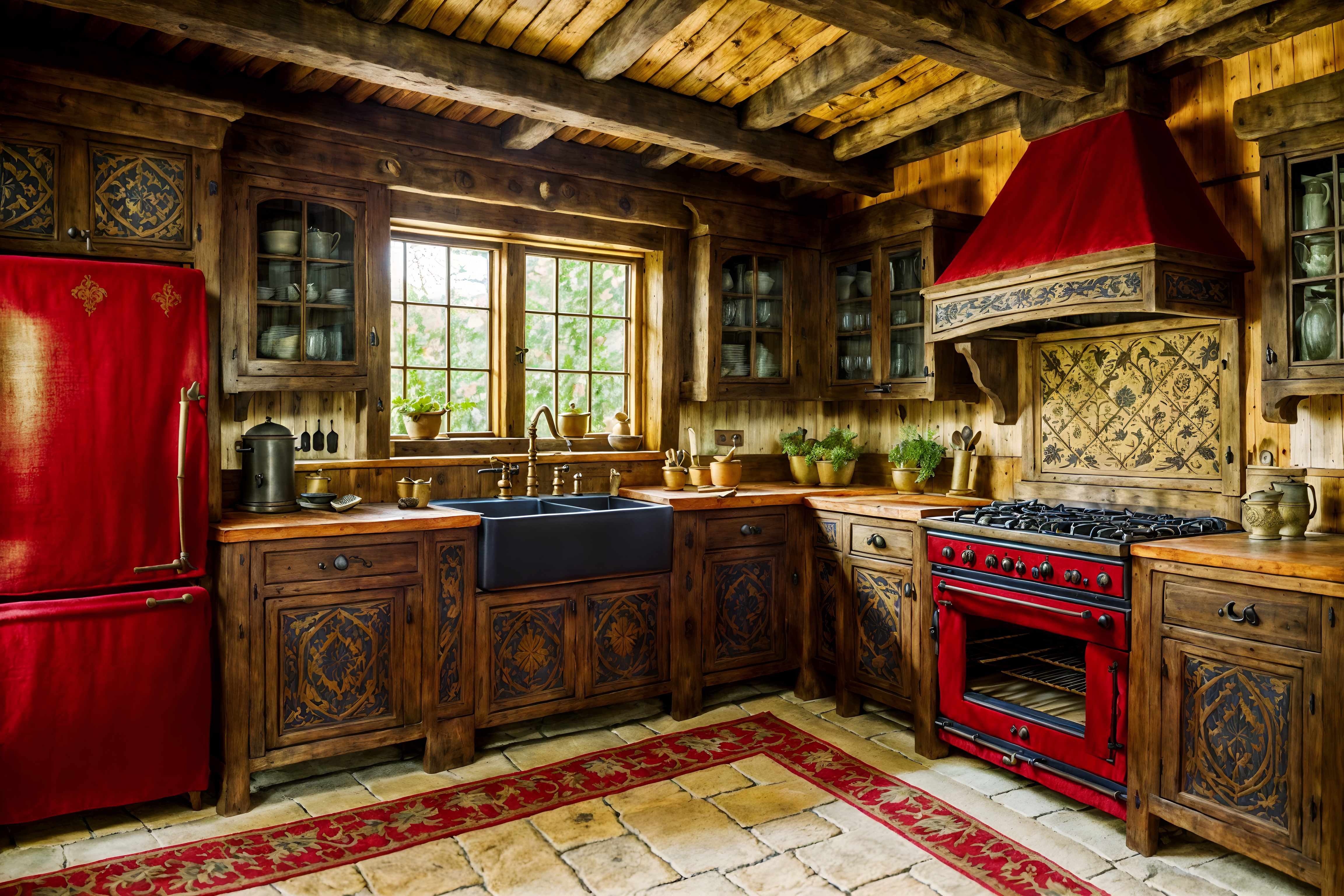 photo from pinterest of medieval-style interior designed (kitchen interior) with sink and stove and worktops and plant and kitchen cabinets and refrigerator and sink. . with deep colors like red, gold, or blue and timber beams and upholstery on chairs and sofas and carved wooden chairs and carved wooden benches and velvet, chenille, damask, and brocade draperies and fabrics and intricate wooden inlay designs and carvings and gothic appearance. . cinematic photo, highly detailed, cinematic lighting, ultra-detailed, ultrarealistic, photorealism, 8k. trending on pinterest. medieval interior design style. masterpiece, cinematic light, ultrarealistic+, photorealistic+, 8k, raw photo, realistic, sharp focus on eyes, (symmetrical eyes), (intact eyes), hyperrealistic, highest quality, best quality, , highly detailed, masterpiece, best quality, extremely detailed 8k wallpaper, masterpiece, best quality, ultra-detailed, best shadow, detailed background, detailed face, detailed eyes, high contrast, best illumination, detailed face, dulux, caustic, dynamic angle, detailed glow. dramatic lighting. highly detailed, insanely detailed hair, symmetrical, intricate details, professionally retouched, 8k high definition. strong bokeh. award winning photo.
