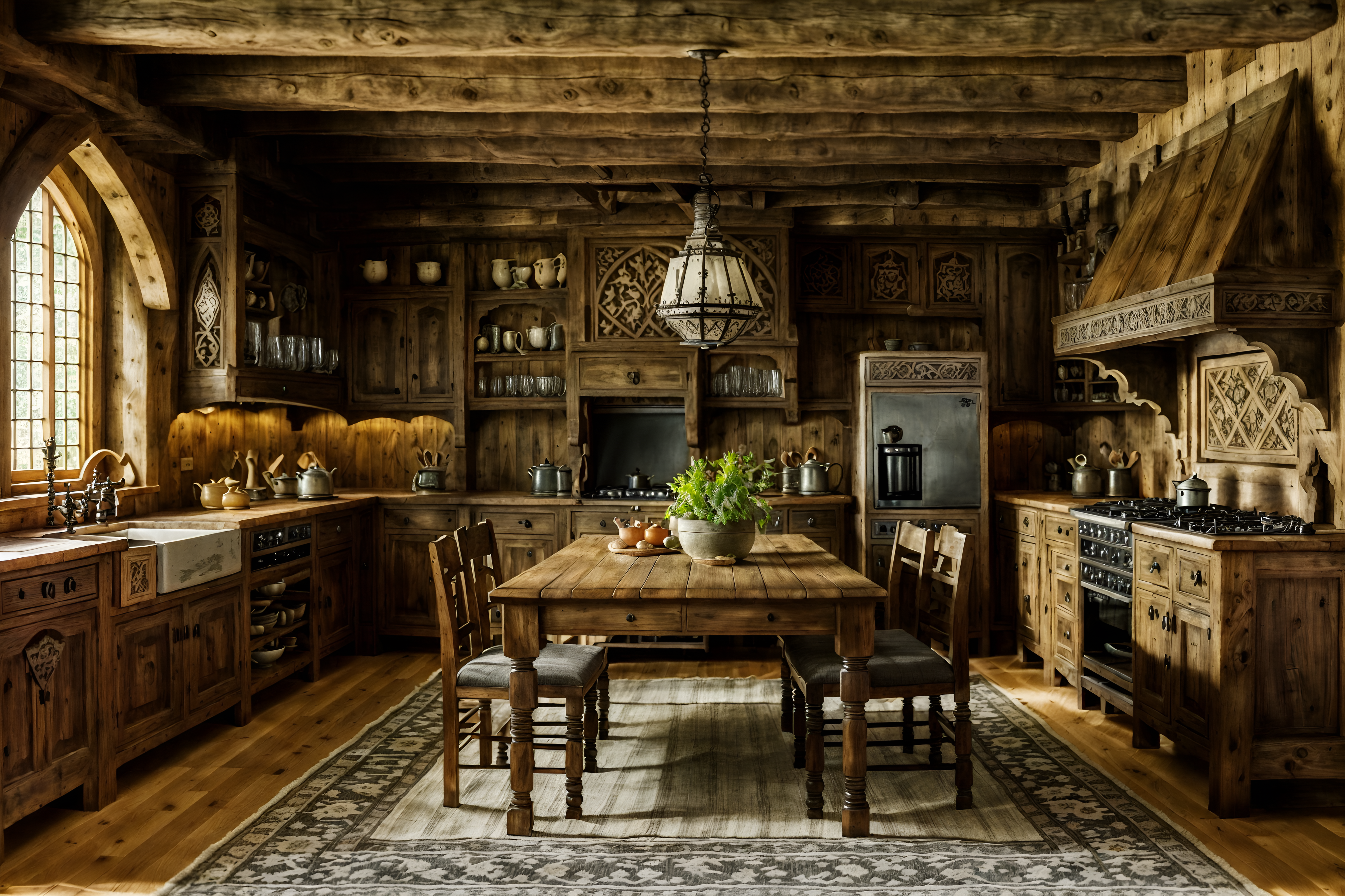 photo from pinterest of medieval-style interior designed (kitchen living combo interior) with furniture and plant and kitchen cabinets and worktops and rug and chairs and stove and refrigerator. . with timber walls and gothic appearance and carved wooden tables and castle interior and medieval shields on the wall and upholstery on chairs and sofas and timber beams and castle interior. . cinematic photo, highly detailed, cinematic lighting, ultra-detailed, ultrarealistic, photorealism, 8k. trending on pinterest. medieval interior design style. masterpiece, cinematic light, ultrarealistic+, photorealistic+, 8k, raw photo, realistic, sharp focus on eyes, (symmetrical eyes), (intact eyes), hyperrealistic, highest quality, best quality, , highly detailed, masterpiece, best quality, extremely detailed 8k wallpaper, masterpiece, best quality, ultra-detailed, best shadow, detailed background, detailed face, detailed eyes, high contrast, best illumination, detailed face, dulux, caustic, dynamic angle, detailed glow. dramatic lighting. highly detailed, insanely detailed hair, symmetrical, intricate details, professionally retouched, 8k high definition. strong bokeh. award winning photo.