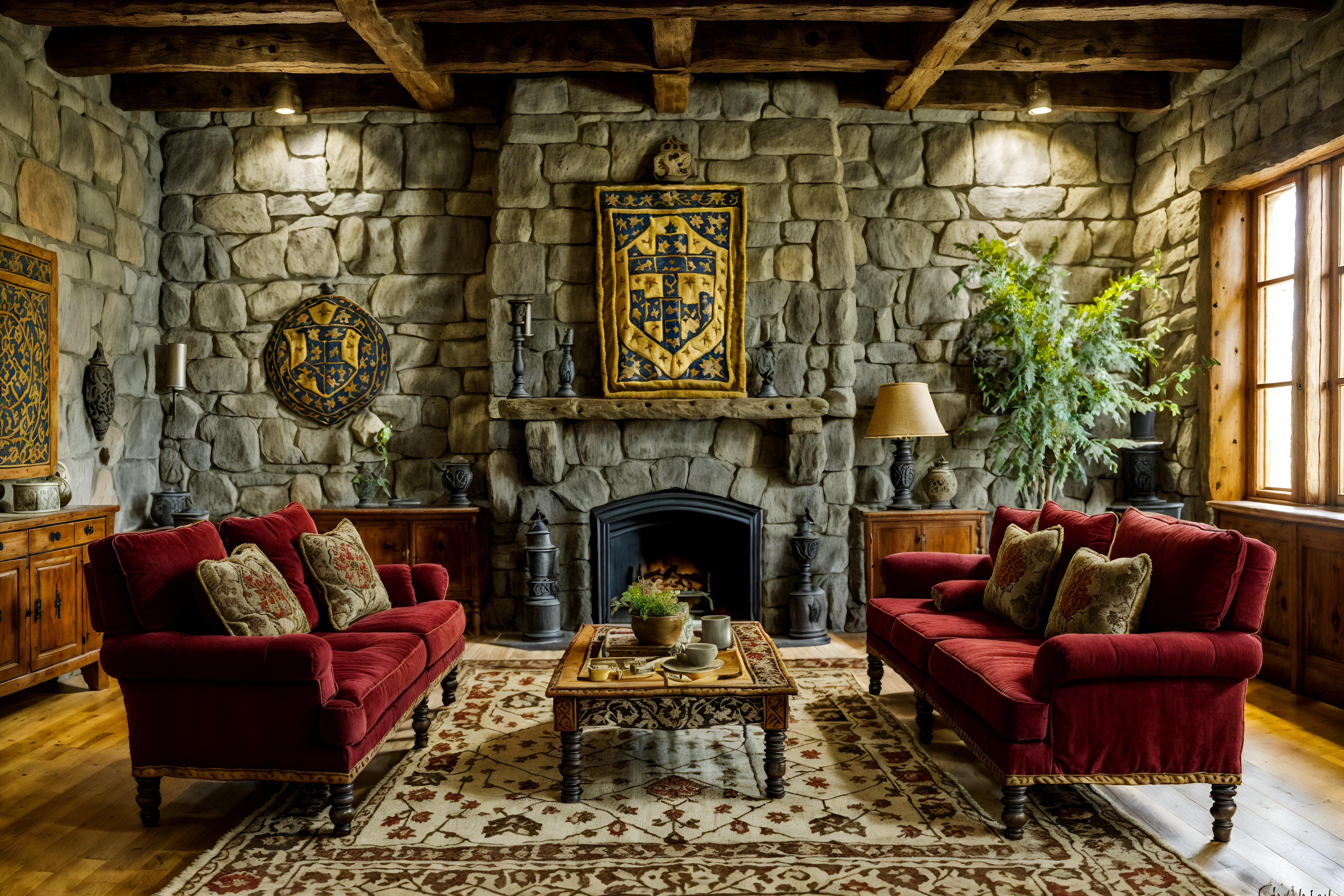 photo from pinterest of medieval-style interior designed (living room interior) with chairs and coffee tables and plant and televisions and rug and sofa and occasional tables and furniture. . with stone walls and upholstery on chairs and sofas and carved wooden chairs and castle interior and medieval shields on the wall and castle interior and velvet, chenille, damask, and brocade draperies and fabrics and deep colors like red, gold, or blue. . cinematic photo, highly detailed, cinematic lighting, ultra-detailed, ultrarealistic, photorealism, 8k. trending on pinterest. medieval interior design style. masterpiece, cinematic light, ultrarealistic+, photorealistic+, 8k, raw photo, realistic, sharp focus on eyes, (symmetrical eyes), (intact eyes), hyperrealistic, highest quality, best quality, , highly detailed, masterpiece, best quality, extremely detailed 8k wallpaper, masterpiece, best quality, ultra-detailed, best shadow, detailed background, detailed face, detailed eyes, high contrast, best illumination, detailed face, dulux, caustic, dynamic angle, detailed glow. dramatic lighting. highly detailed, insanely detailed hair, symmetrical, intricate details, professionally retouched, 8k high definition. strong bokeh. award winning photo.
