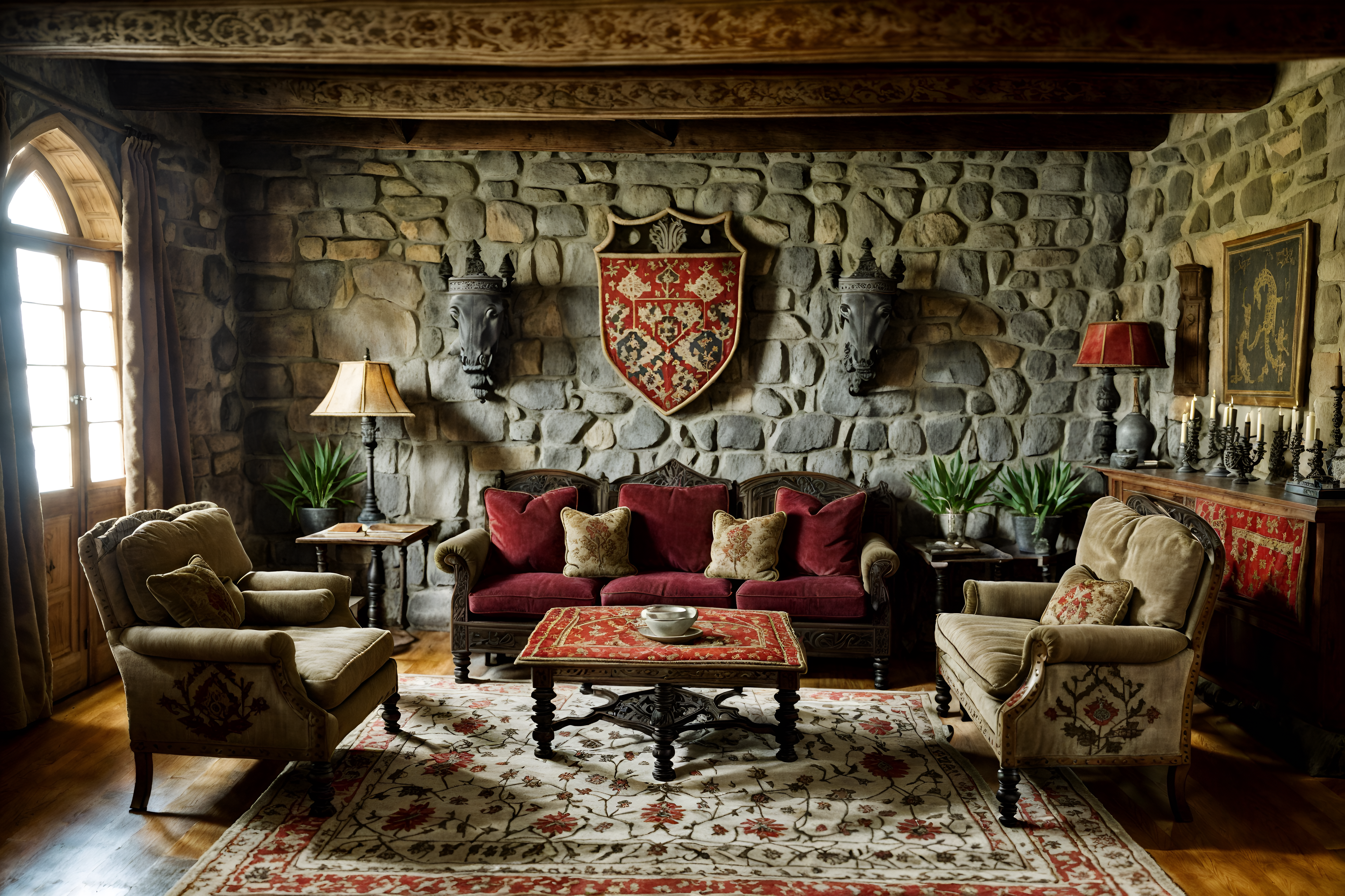 photo from pinterest of medieval-style interior designed (living room interior) with chairs and coffee tables and plant and televisions and rug and sofa and occasional tables and furniture. . with stone walls and upholstery on chairs and sofas and carved wooden chairs and castle interior and medieval shields on the wall and castle interior and velvet, chenille, damask, and brocade draperies and fabrics and deep colors like red, gold, or blue. . cinematic photo, highly detailed, cinematic lighting, ultra-detailed, ultrarealistic, photorealism, 8k. trending on pinterest. medieval interior design style. masterpiece, cinematic light, ultrarealistic+, photorealistic+, 8k, raw photo, realistic, sharp focus on eyes, (symmetrical eyes), (intact eyes), hyperrealistic, highest quality, best quality, , highly detailed, masterpiece, best quality, extremely detailed 8k wallpaper, masterpiece, best quality, ultra-detailed, best shadow, detailed background, detailed face, detailed eyes, high contrast, best illumination, detailed face, dulux, caustic, dynamic angle, detailed glow. dramatic lighting. highly detailed, insanely detailed hair, symmetrical, intricate details, professionally retouched, 8k high definition. strong bokeh. award winning photo.