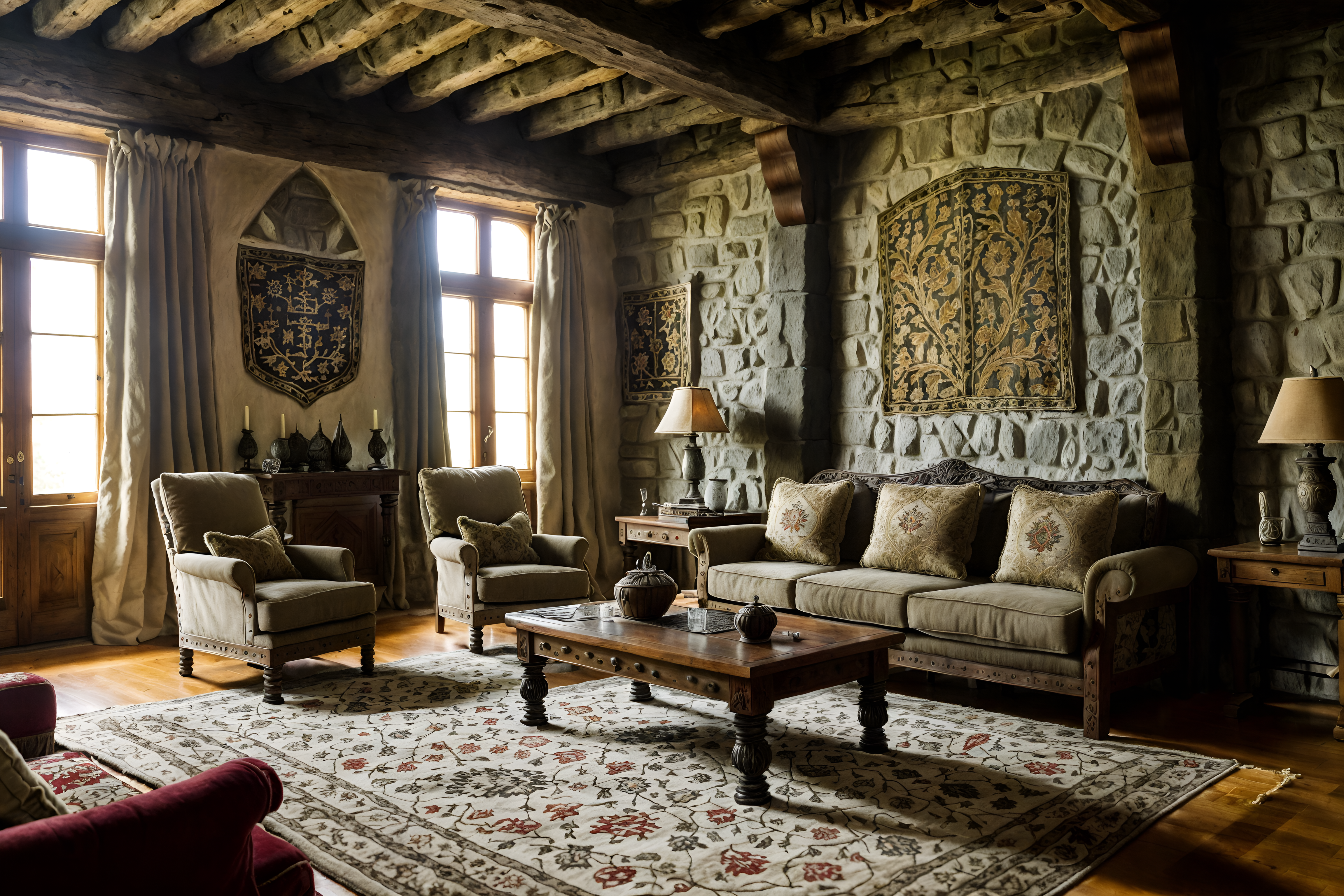 photo from pinterest of medieval-style interior designed (living room interior) with chairs and coffee tables and plant and televisions and rug and sofa and occasional tables and furniture. . with stone walls and upholstery on chairs and sofas and carved wooden chairs and castle interior and medieval shields on the wall and castle interior and velvet, chenille, damask, and brocade draperies and fabrics and deep colors like red, gold, or blue. . cinematic photo, highly detailed, cinematic lighting, ultra-detailed, ultrarealistic, photorealism, 8k. trending on pinterest. medieval interior design style. masterpiece, cinematic light, ultrarealistic+, photorealistic+, 8k, raw photo, realistic, sharp focus on eyes, (symmetrical eyes), (intact eyes), hyperrealistic, highest quality, best quality, , highly detailed, masterpiece, best quality, extremely detailed 8k wallpaper, masterpiece, best quality, ultra-detailed, best shadow, detailed background, detailed face, detailed eyes, high contrast, best illumination, detailed face, dulux, caustic, dynamic angle, detailed glow. dramatic lighting. highly detailed, insanely detailed hair, symmetrical, intricate details, professionally retouched, 8k high definition. strong bokeh. award winning photo.