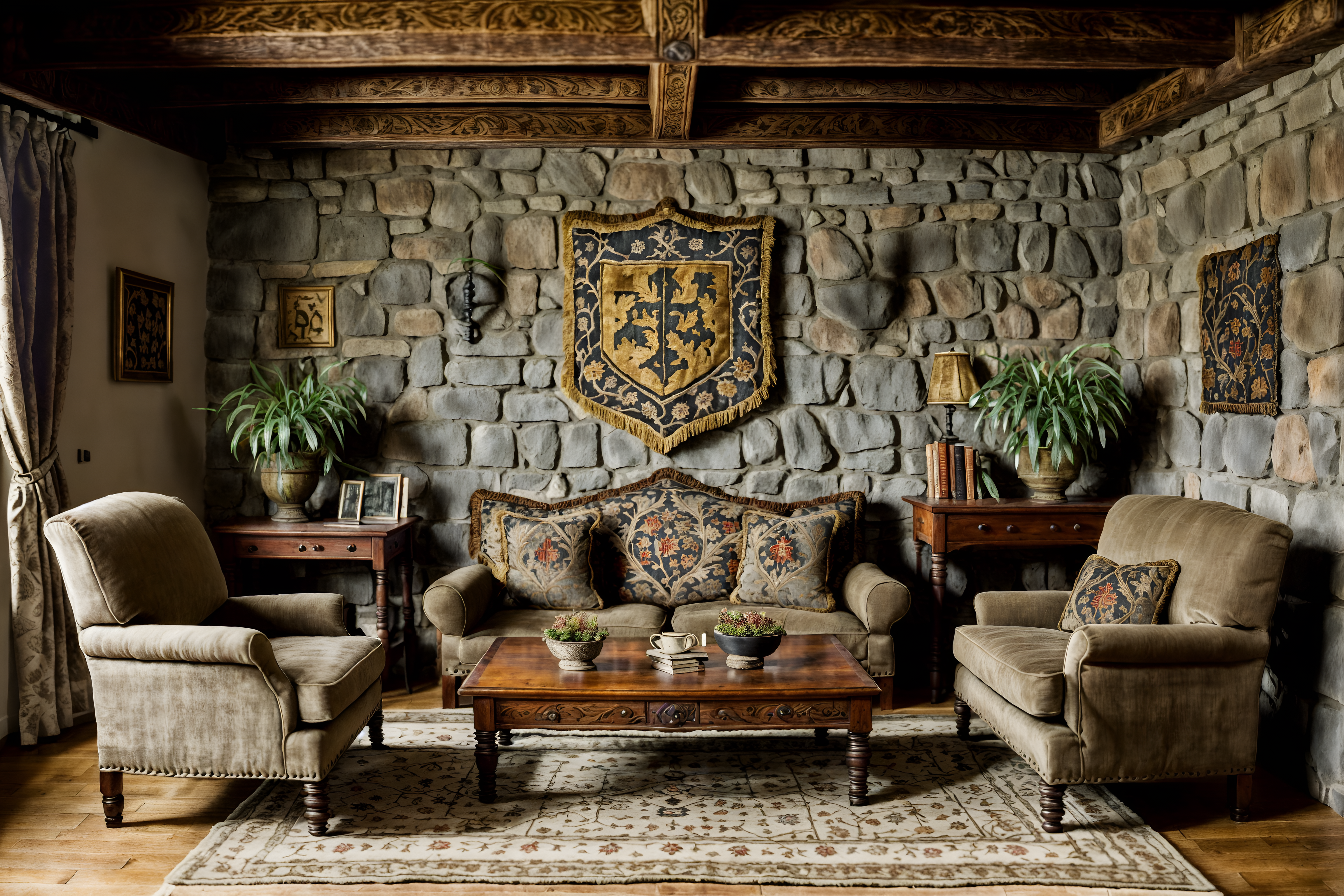 photo from pinterest of medieval-style interior designed (living room interior) with chairs and coffee tables and plant and televisions and rug and sofa and occasional tables and furniture. . with stone walls and upholstery on chairs and sofas and carved wooden chairs and castle interior and medieval shields on the wall and castle interior and velvet, chenille, damask, and brocade draperies and fabrics and deep colors like red, gold, or blue. . cinematic photo, highly detailed, cinematic lighting, ultra-detailed, ultrarealistic, photorealism, 8k. trending on pinterest. medieval interior design style. masterpiece, cinematic light, ultrarealistic+, photorealistic+, 8k, raw photo, realistic, sharp focus on eyes, (symmetrical eyes), (intact eyes), hyperrealistic, highest quality, best quality, , highly detailed, masterpiece, best quality, extremely detailed 8k wallpaper, masterpiece, best quality, ultra-detailed, best shadow, detailed background, detailed face, detailed eyes, high contrast, best illumination, detailed face, dulux, caustic, dynamic angle, detailed glow. dramatic lighting. highly detailed, insanely detailed hair, symmetrical, intricate details, professionally retouched, 8k high definition. strong bokeh. award winning photo.