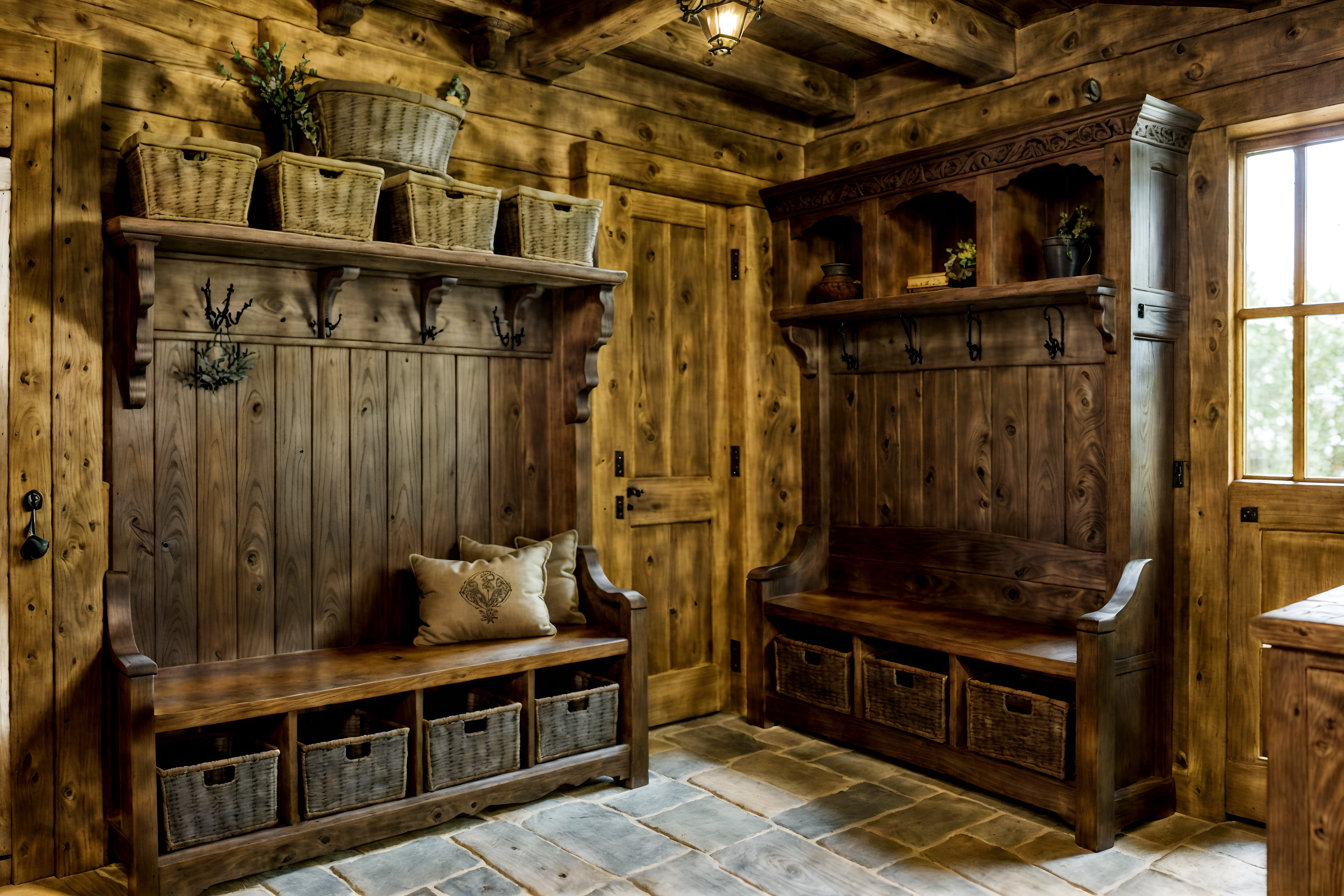 photo from pinterest of medieval-style interior designed (mudroom interior) with a bench and high up storage and storage baskets and cubbies and storage drawers and wall hooks for coats and cabinets and shelves for shoes. . with stone or wooden floor and castle interior and timber beams and gothic appearance and timber walls and upholstery on chairs and sofas and carved wooden tables and carved wooden chairs. . cinematic photo, highly detailed, cinematic lighting, ultra-detailed, ultrarealistic, photorealism, 8k. trending on pinterest. medieval interior design style. masterpiece, cinematic light, ultrarealistic+, photorealistic+, 8k, raw photo, realistic, sharp focus on eyes, (symmetrical eyes), (intact eyes), hyperrealistic, highest quality, best quality, , highly detailed, masterpiece, best quality, extremely detailed 8k wallpaper, masterpiece, best quality, ultra-detailed, best shadow, detailed background, detailed face, detailed eyes, high contrast, best illumination, detailed face, dulux, caustic, dynamic angle, detailed glow. dramatic lighting. highly detailed, insanely detailed hair, symmetrical, intricate details, professionally retouched, 8k high definition. strong bokeh. award winning photo.