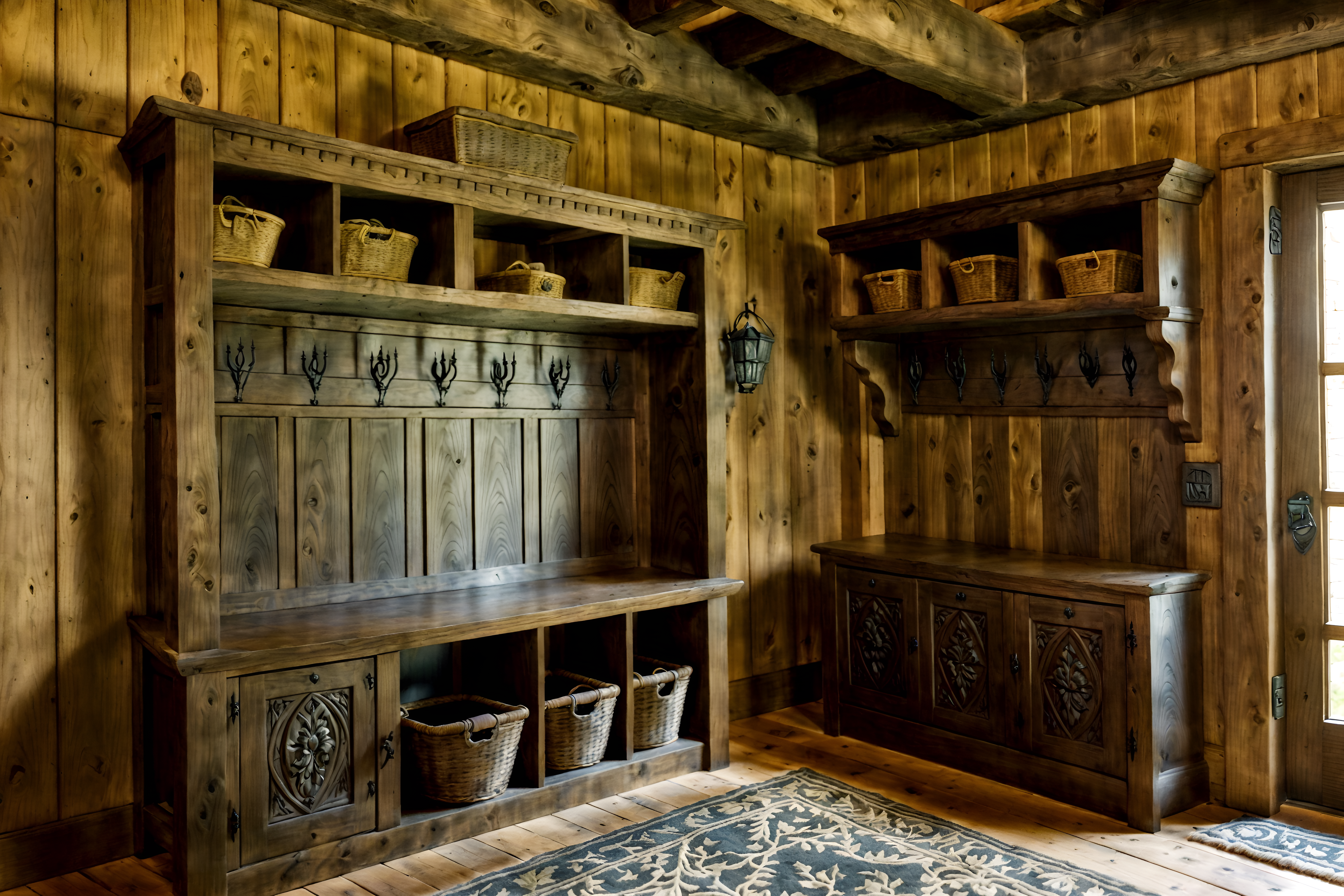 photo from pinterest of medieval-style interior designed (mudroom interior) with a bench and high up storage and storage baskets and cubbies and storage drawers and wall hooks for coats and cabinets and shelves for shoes. . with stone or wooden floor and castle interior and timber beams and gothic appearance and timber walls and upholstery on chairs and sofas and carved wooden tables and carved wooden chairs. . cinematic photo, highly detailed, cinematic lighting, ultra-detailed, ultrarealistic, photorealism, 8k. trending on pinterest. medieval interior design style. masterpiece, cinematic light, ultrarealistic+, photorealistic+, 8k, raw photo, realistic, sharp focus on eyes, (symmetrical eyes), (intact eyes), hyperrealistic, highest quality, best quality, , highly detailed, masterpiece, best quality, extremely detailed 8k wallpaper, masterpiece, best quality, ultra-detailed, best shadow, detailed background, detailed face, detailed eyes, high contrast, best illumination, detailed face, dulux, caustic, dynamic angle, detailed glow. dramatic lighting. highly detailed, insanely detailed hair, symmetrical, intricate details, professionally retouched, 8k high definition. strong bokeh. award winning photo.