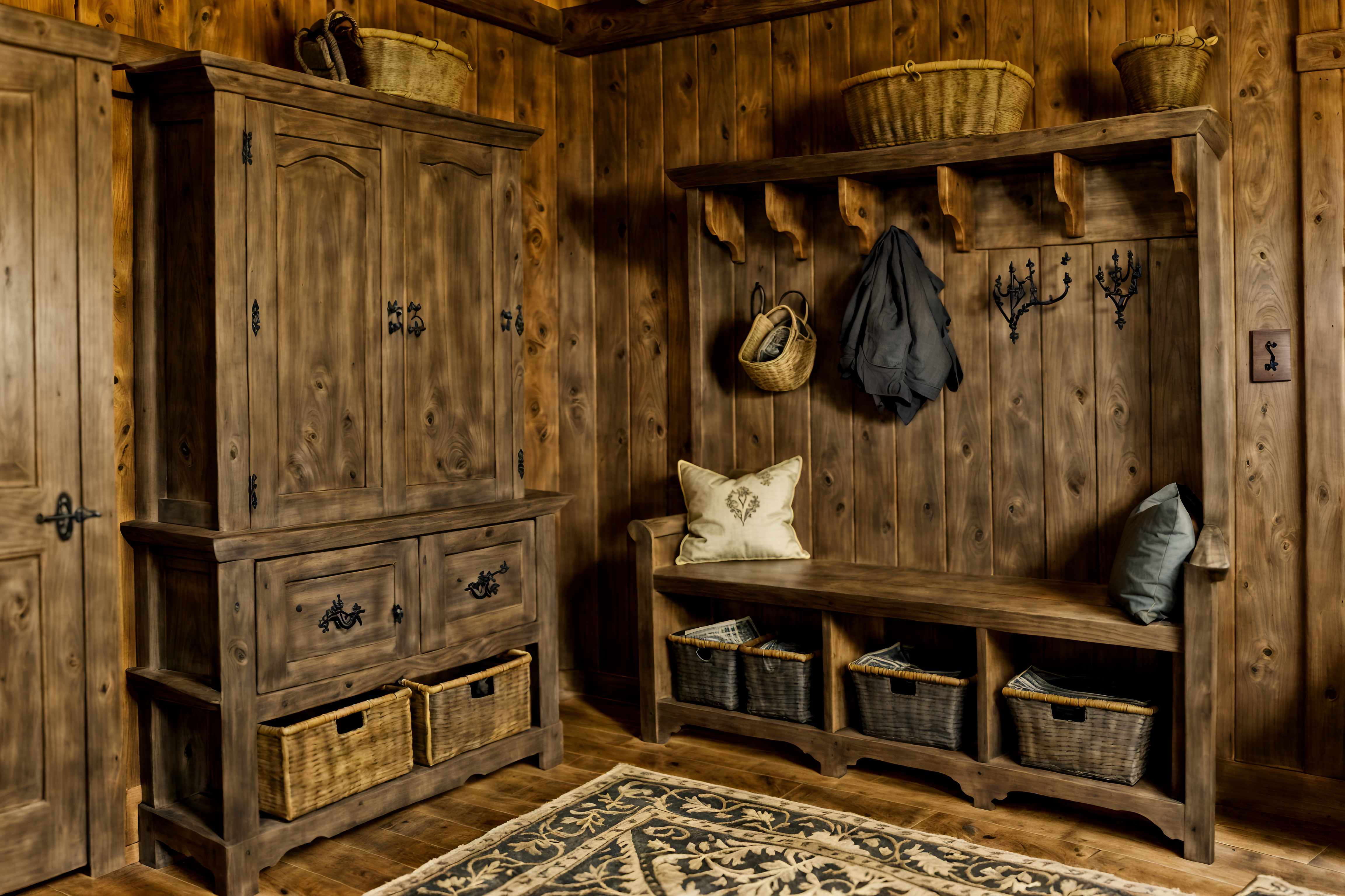 photo from pinterest of medieval-style interior designed (mudroom interior) with a bench and high up storage and storage baskets and cubbies and storage drawers and wall hooks for coats and cabinets and shelves for shoes. . with stone or wooden floor and castle interior and timber beams and gothic appearance and timber walls and upholstery on chairs and sofas and carved wooden tables and carved wooden chairs. . cinematic photo, highly detailed, cinematic lighting, ultra-detailed, ultrarealistic, photorealism, 8k. trending on pinterest. medieval interior design style. masterpiece, cinematic light, ultrarealistic+, photorealistic+, 8k, raw photo, realistic, sharp focus on eyes, (symmetrical eyes), (intact eyes), hyperrealistic, highest quality, best quality, , highly detailed, masterpiece, best quality, extremely detailed 8k wallpaper, masterpiece, best quality, ultra-detailed, best shadow, detailed background, detailed face, detailed eyes, high contrast, best illumination, detailed face, dulux, caustic, dynamic angle, detailed glow. dramatic lighting. highly detailed, insanely detailed hair, symmetrical, intricate details, professionally retouched, 8k high definition. strong bokeh. award winning photo.