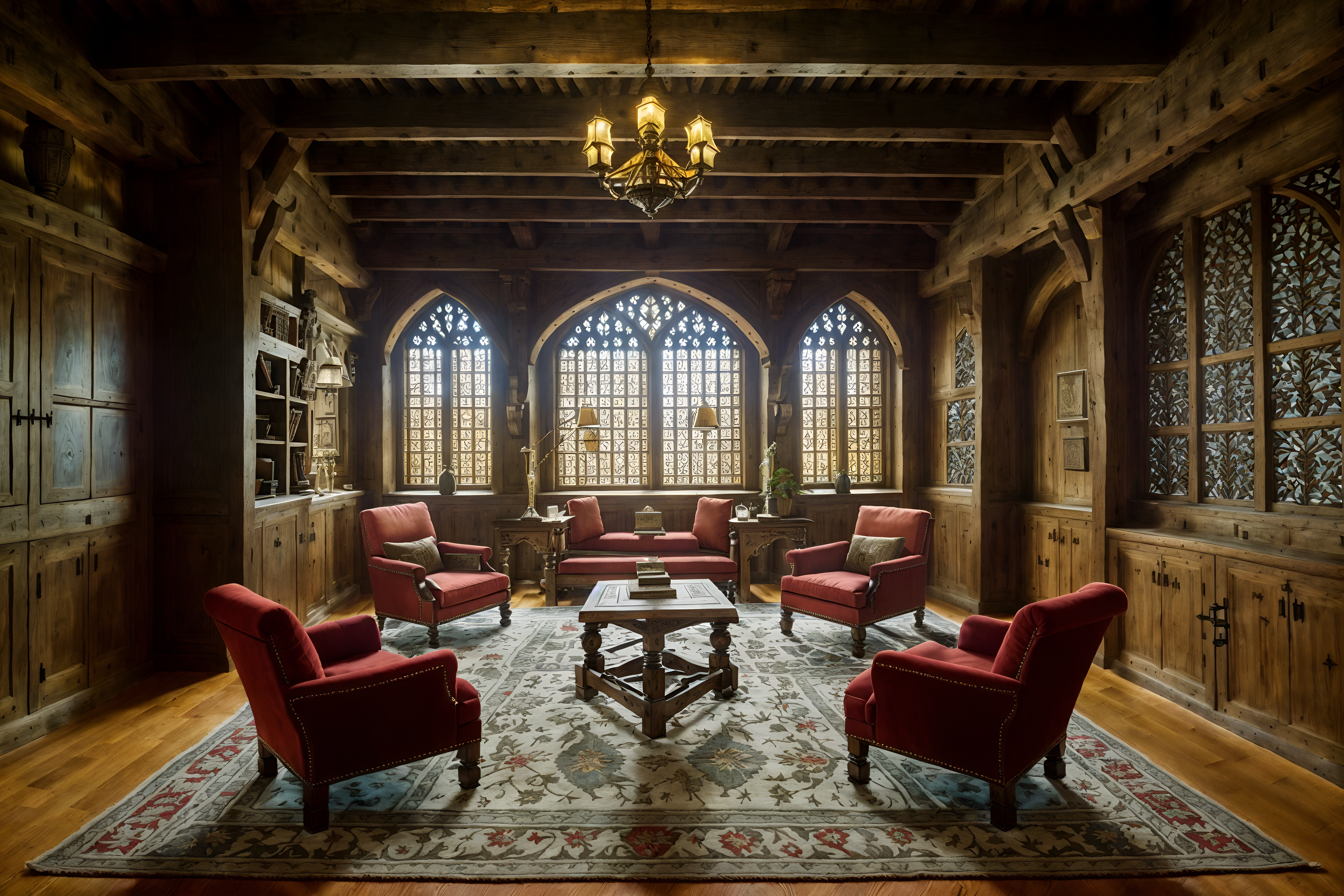 medieval interiorsinterior decorate this gaming room with medieval style. . . . with carved wooden chairs and deep colors like red, gold, or blue and gothic appearance and castle interior and stone or wooden floor and upholstery on chairs and sofas and carved wooden benches and castle interior. . .interior decorate this attic with medieval style. . . with exposed beams and old books and old furniture and storage shelves and antique items and dust sheets and vintage trunk and skylights. . with carved wooden benches and carved wooden tables and gothic appearance and velvet, chenille, damask, and brocade draperies and fabrics and carved wooden chairs and stone walls and timber beams and upholstery on chairs and sofas. . .interior decorate this cafeteria with medieval style. . . with utensils and trays and menu boards and dining tables and beverage station and food service counter and benches and trash bins. . with intricate wooden inlay designs and carvings and carved wooden chairs and timber walls and carved wooden benches and stone walls and velvet, chenille, damask, and brocade draperies and fabrics and carved wooden tables and castle interior. . .interior decorate this music stage with medieval style. . . with musical instruments and stage monitors and drum kit and guitar stands and stage lights and cables and microphones and backdrop. . with gothic appearance and castle interior and deep colors like red, gold, or blue and castle interior and carved wooden tables and medieval shields on the wall and timber walls and stone walls. . .interior decorate this press room with medieval style. . . with lighting equipment and chairs and microphones and recording equipment and tripods and press badges and notebooks and cameras. . with gothic appearance and castle interior and medieval shields on the wall and carved wooden benches and stone walls and carved wooden chairs and timber walls and velvet, chenille, damask, and brocade draperies and fabrics. . .interior decorate this conference hall with medieval style. . . with whiteboard and office chairs and water glasses and projector and microphones and conference table and speaker phone and flipchart. . with gothic appearance and timber walls and medieval shields on the wall and carved wooden benches and castle interior and castle interior and carved wooden chairs and stone walls. . .interior decorate this pole dance studio with medieval style. . . with dim lighting and mirrors and dance poles and yoga mats and sound system and grip aids and exercise equipment and comfortable seating. . with carved wooden benches and timber walls and stone walls and castle interior and gothic appearance and timber beams and intricate wooden inlay designs and carvings and castle interior. . .interior decorate this garage with medieval style. . . with garage door and concrete floor and bicycles and cars and lawnmower and storage racks and garage door. . with carved wooden tables and timber beams and heavy furniture pieces and castle interior and intricate wooden inlay designs and carvings and stone or wooden floor and timber walls and deep colors like red, gold, or blue. . .interior decorate this outdoor garage with medieval style. . . with canopy and carport roof and cars and roof solar panels and storage racks and carport and canopy. . with stone walls and medieval shields on the wall and carved wooden tables and timber beams and castle and deep colors like red, gold, or blue and heavy furniture pieces and stone or wooden floor. . .