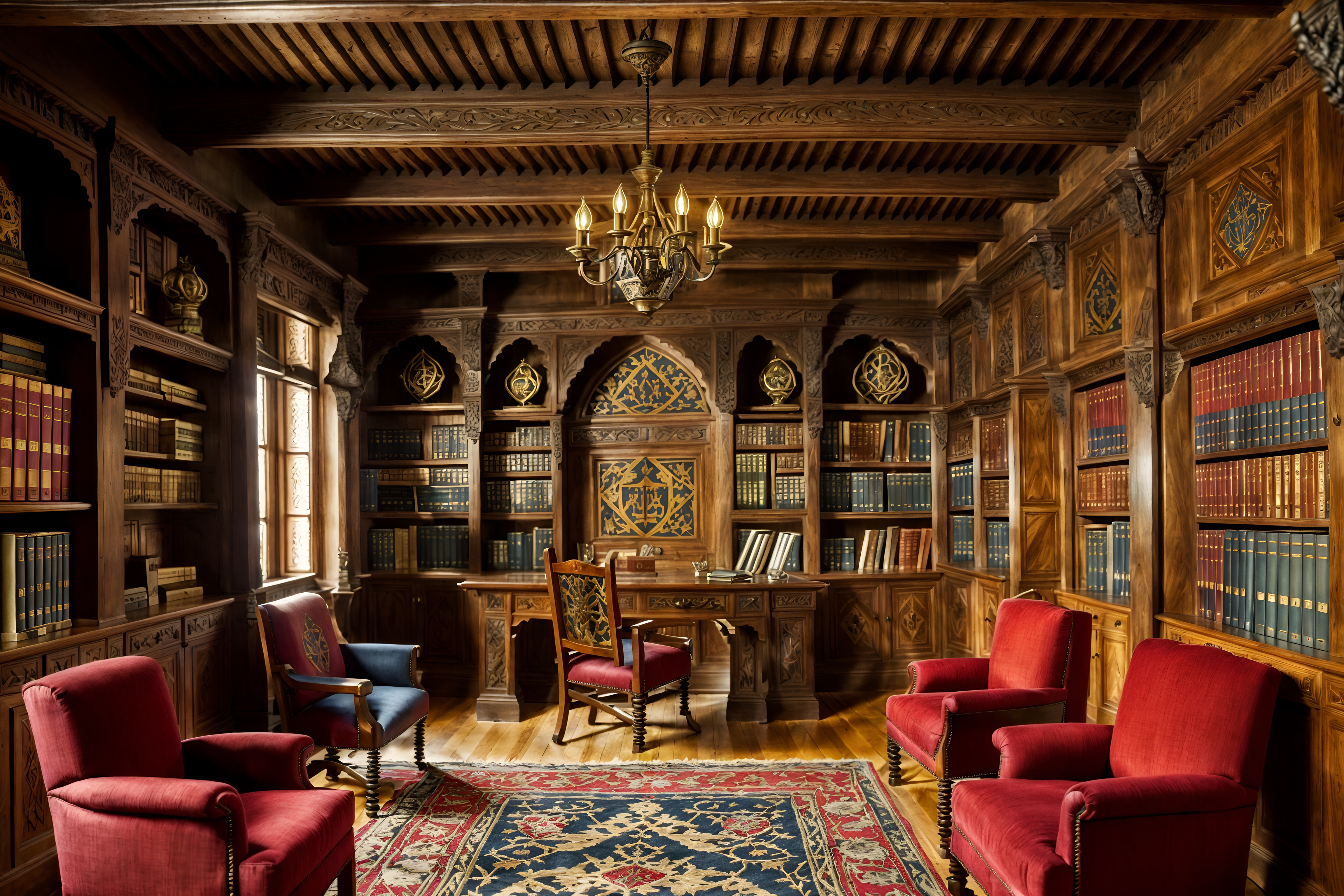 photo from pinterest of medieval-style interior designed (study room interior) with cabinets and desk lamp and office chair and bookshelves and lounge chair and plant and writing desk and cabinets. . with deep colors like red, gold, or blue and castle interior and medieval shields on the wall and carved wooden benches and heavy furniture pieces and timber walls and intricate wooden inlay designs and carvings and upholstery on chairs and sofas. . cinematic photo, highly detailed, cinematic lighting, ultra-detailed, ultrarealistic, photorealism, 8k. trending on pinterest. medieval interior design style. masterpiece, cinematic light, ultrarealistic+, photorealistic+, 8k, raw photo, realistic, sharp focus on eyes, (symmetrical eyes), (intact eyes), hyperrealistic, highest quality, best quality, , highly detailed, masterpiece, best quality, extremely detailed 8k wallpaper, masterpiece, best quality, ultra-detailed, best shadow, detailed background, detailed face, detailed eyes, high contrast, best illumination, detailed face, dulux, caustic, dynamic angle, detailed glow. dramatic lighting. highly detailed, insanely detailed hair, symmetrical, intricate details, professionally retouched, 8k high definition. strong bokeh. award winning photo.