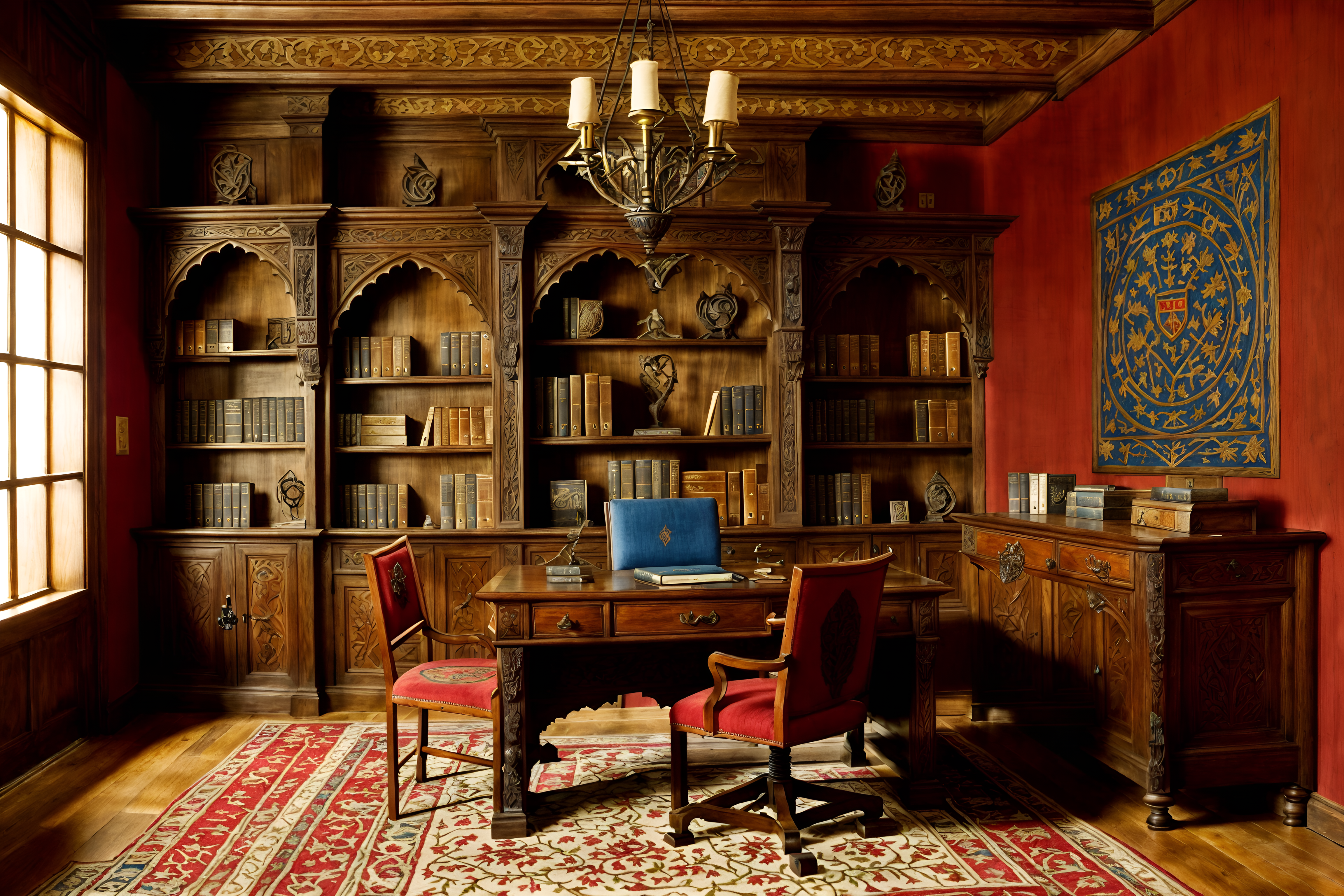 photo from pinterest of medieval-style interior designed (study room interior) with cabinets and desk lamp and office chair and bookshelves and lounge chair and plant and writing desk and cabinets. . with deep colors like red, gold, or blue and castle interior and medieval shields on the wall and carved wooden benches and heavy furniture pieces and timber walls and intricate wooden inlay designs and carvings and upholstery on chairs and sofas. . cinematic photo, highly detailed, cinematic lighting, ultra-detailed, ultrarealistic, photorealism, 8k. trending on pinterest. medieval interior design style. masterpiece, cinematic light, ultrarealistic+, photorealistic+, 8k, raw photo, realistic, sharp focus on eyes, (symmetrical eyes), (intact eyes), hyperrealistic, highest quality, best quality, , highly detailed, masterpiece, best quality, extremely detailed 8k wallpaper, masterpiece, best quality, ultra-detailed, best shadow, detailed background, detailed face, detailed eyes, high contrast, best illumination, detailed face, dulux, caustic, dynamic angle, detailed glow. dramatic lighting. highly detailed, insanely detailed hair, symmetrical, intricate details, professionally retouched, 8k high definition. strong bokeh. award winning photo.