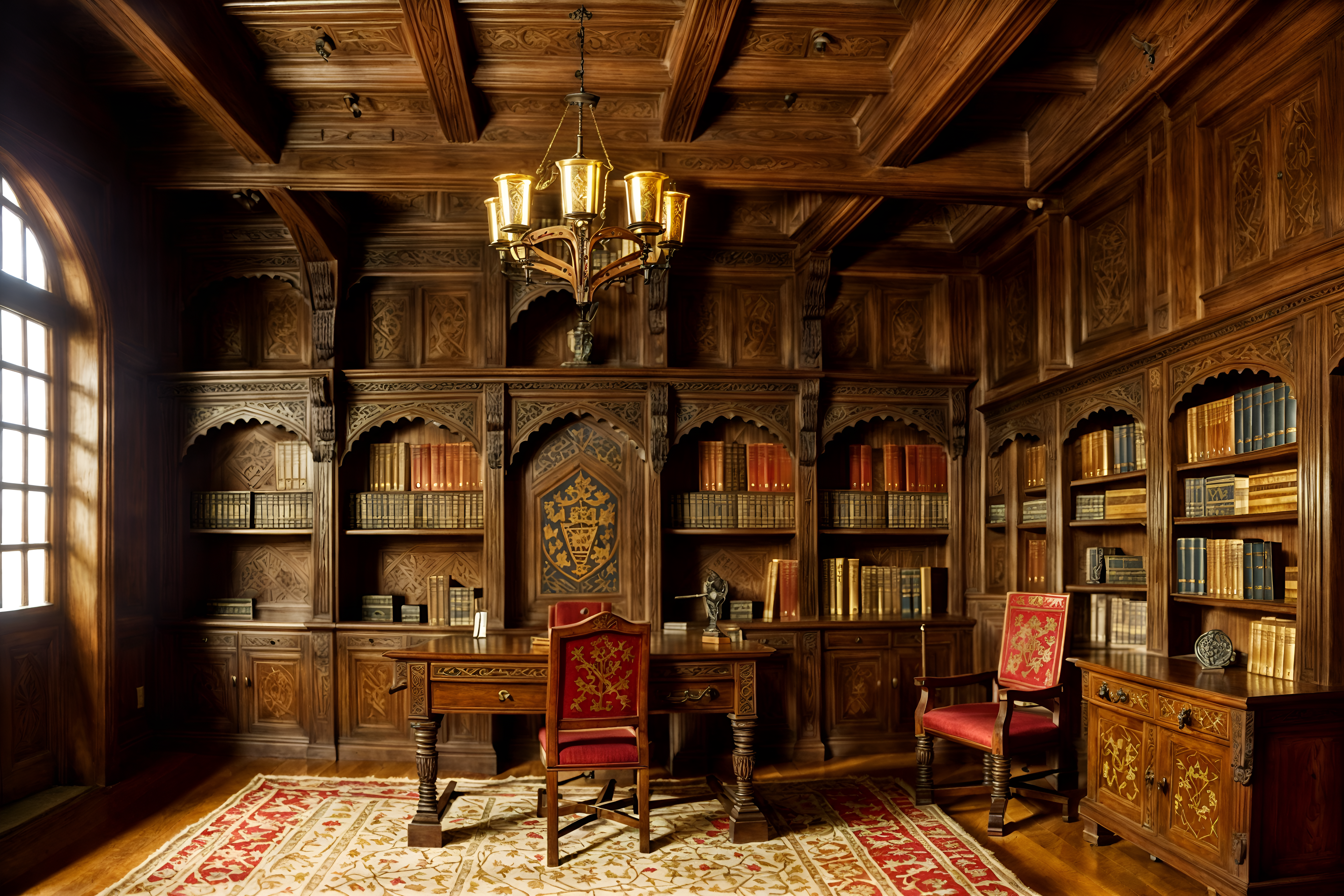 photo from pinterest of medieval-style interior designed (study room interior) with cabinets and desk lamp and office chair and bookshelves and lounge chair and plant and writing desk and cabinets. . with deep colors like red, gold, or blue and castle interior and medieval shields on the wall and carved wooden benches and heavy furniture pieces and timber walls and intricate wooden inlay designs and carvings and upholstery on chairs and sofas. . cinematic photo, highly detailed, cinematic lighting, ultra-detailed, ultrarealistic, photorealism, 8k. trending on pinterest. medieval interior design style. masterpiece, cinematic light, ultrarealistic+, photorealistic+, 8k, raw photo, realistic, sharp focus on eyes, (symmetrical eyes), (intact eyes), hyperrealistic, highest quality, best quality, , highly detailed, masterpiece, best quality, extremely detailed 8k wallpaper, masterpiece, best quality, ultra-detailed, best shadow, detailed background, detailed face, detailed eyes, high contrast, best illumination, detailed face, dulux, caustic, dynamic angle, detailed glow. dramatic lighting. highly detailed, insanely detailed hair, symmetrical, intricate details, professionally retouched, 8k high definition. strong bokeh. award winning photo.