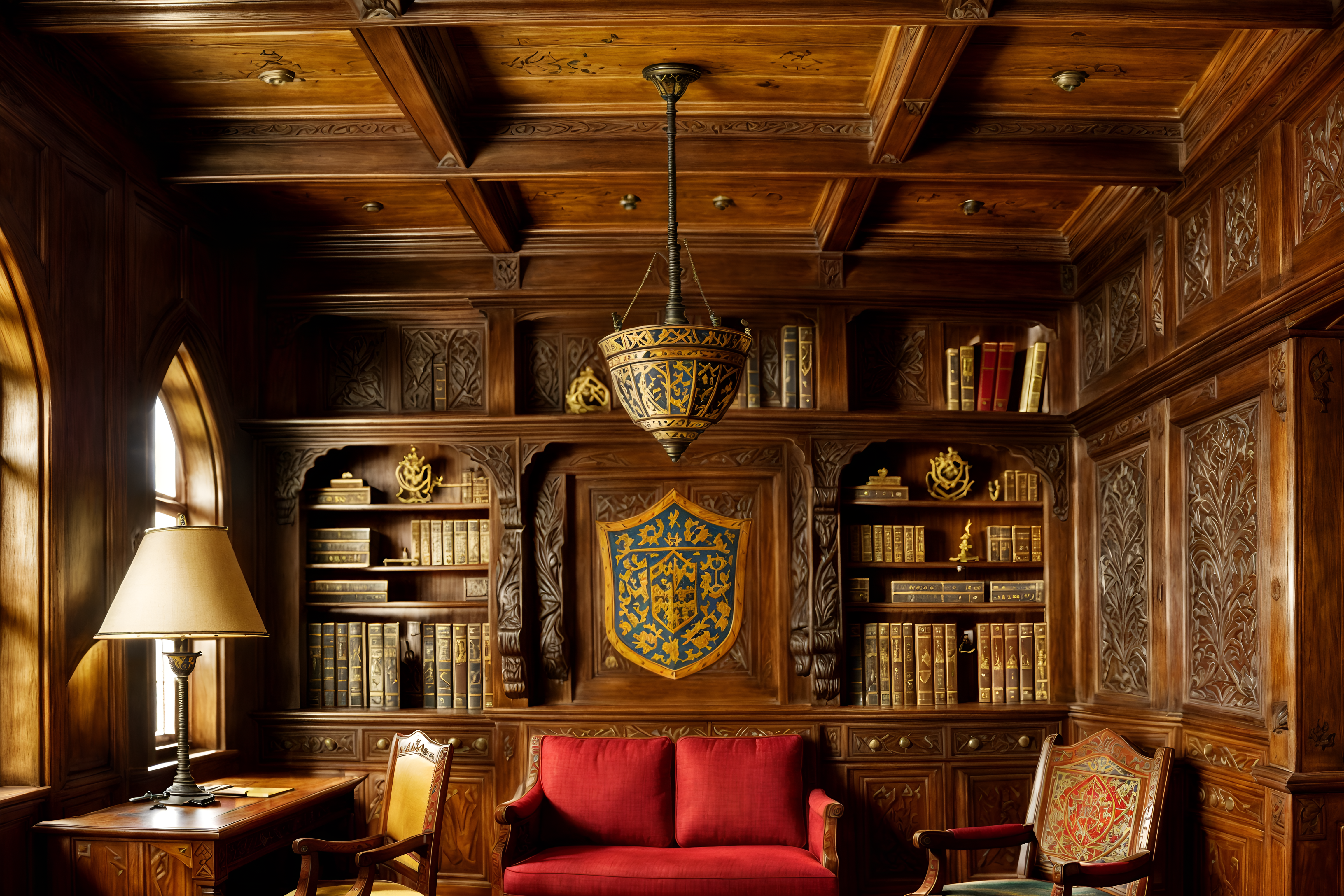 photo from pinterest of medieval-style interior designed (study room interior) with cabinets and desk lamp and office chair and bookshelves and lounge chair and plant and writing desk and cabinets. . with deep colors like red, gold, or blue and castle interior and medieval shields on the wall and carved wooden benches and heavy furniture pieces and timber walls and intricate wooden inlay designs and carvings and upholstery on chairs and sofas. . cinematic photo, highly detailed, cinematic lighting, ultra-detailed, ultrarealistic, photorealism, 8k. trending on pinterest. medieval interior design style. masterpiece, cinematic light, ultrarealistic+, photorealistic+, 8k, raw photo, realistic, sharp focus on eyes, (symmetrical eyes), (intact eyes), hyperrealistic, highest quality, best quality, , highly detailed, masterpiece, best quality, extremely detailed 8k wallpaper, masterpiece, best quality, ultra-detailed, best shadow, detailed background, detailed face, detailed eyes, high contrast, best illumination, detailed face, dulux, caustic, dynamic angle, detailed glow. dramatic lighting. highly detailed, insanely detailed hair, symmetrical, intricate details, professionally retouched, 8k high definition. strong bokeh. award winning photo.