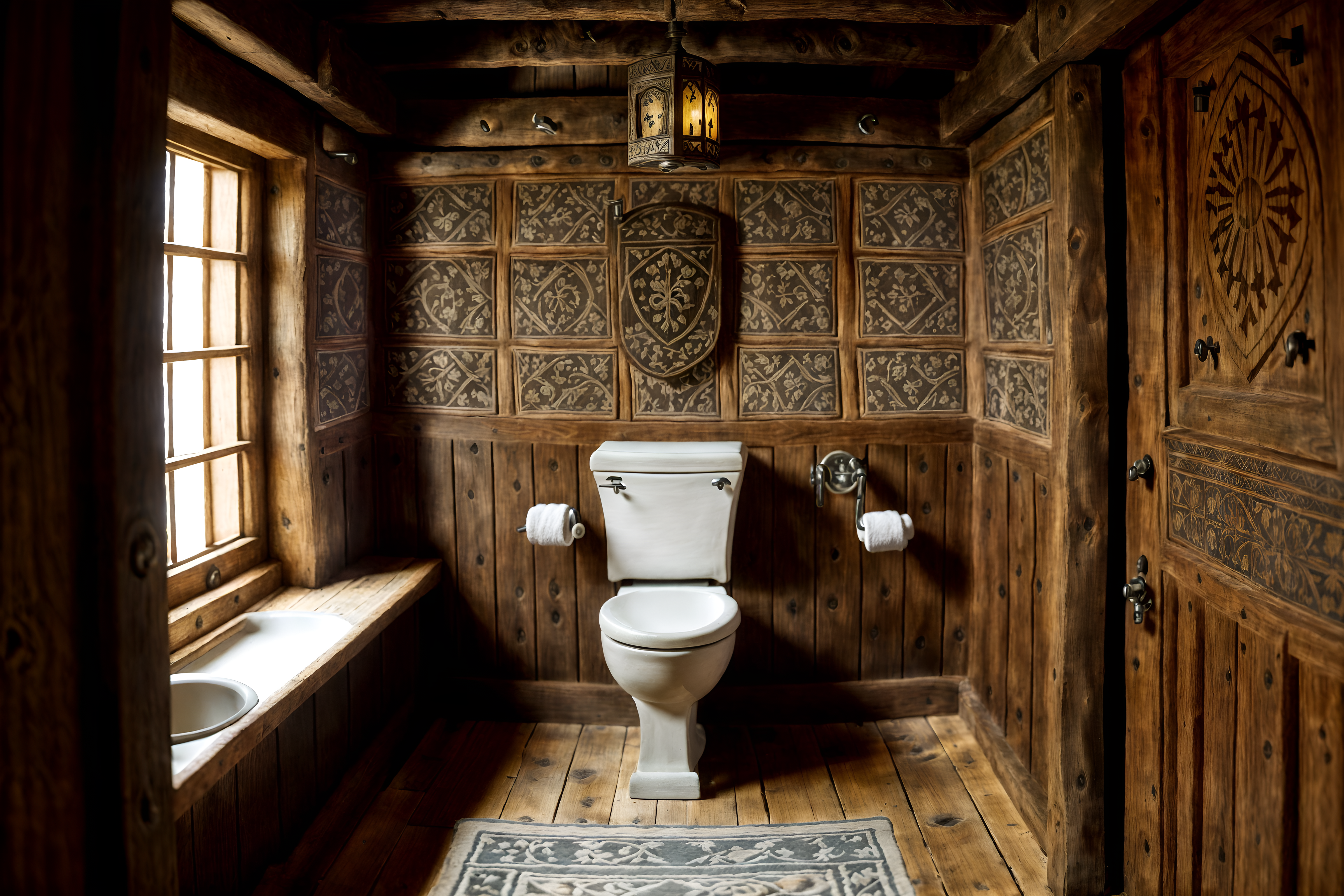 photo from pinterest of medieval-style interior designed (toilet interior) with toilet with toilet seat up and toilet paper hanger and sink with tap and toilet with toilet seat up. . with heavy furniture pieces and stone walls and castle interior and carved wooden tables and timber beams and medieval shields on the wall and intricate wooden inlay designs and carvings and upholstery on chairs and sofas. . cinematic photo, highly detailed, cinematic lighting, ultra-detailed, ultrarealistic, photorealism, 8k. trending on pinterest. medieval interior design style. masterpiece, cinematic light, ultrarealistic+, photorealistic+, 8k, raw photo, realistic, sharp focus on eyes, (symmetrical eyes), (intact eyes), hyperrealistic, highest quality, best quality, , highly detailed, masterpiece, best quality, extremely detailed 8k wallpaper, masterpiece, best quality, ultra-detailed, best shadow, detailed background, detailed face, detailed eyes, high contrast, best illumination, detailed face, dulux, caustic, dynamic angle, detailed glow. dramatic lighting. highly detailed, insanely detailed hair, symmetrical, intricate details, professionally retouched, 8k high definition. strong bokeh. award winning photo.