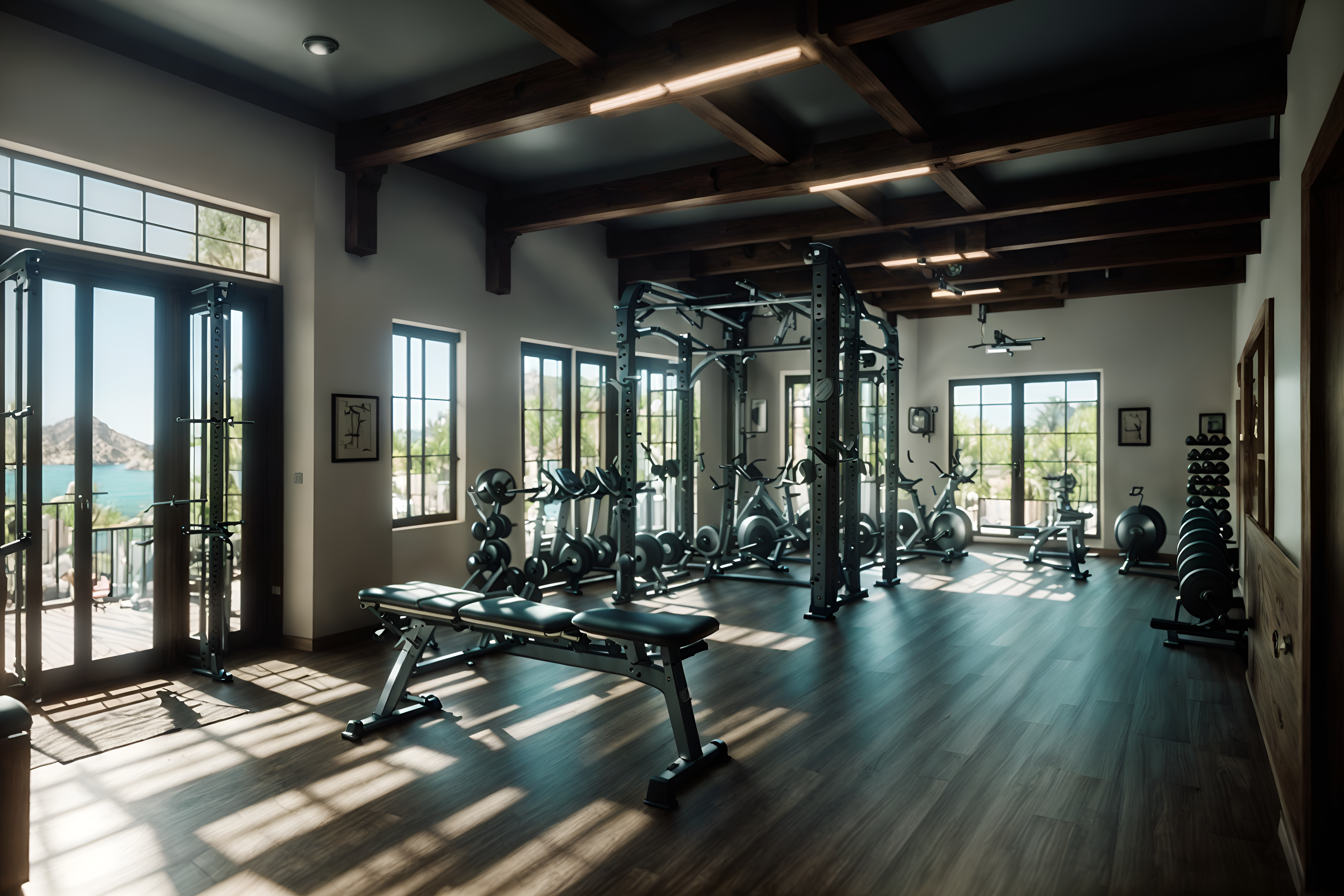 photo from pinterest of mediterranean-style interior designed (fitness gym interior) with crosstrainer and bench press and dumbbell stand and squat rack and exercise bicycle and crosstrainer cinematic photo, highly detailed, cinematic lighting, ultra-detailed, ultrarealistic, photorealism, 8k. trending on pinterest. mediterranean interior design style. masterpiece, cinematic light, ultrarealistic+, photorealistic+, 8k, raw photo, realistic, sharp focus on eyes, (symmetrical eyes), (intact eyes), hyperrealistic, highest quality, best quality, , highly detailed, masterpiece, best quality, extremely detailed 8k wallpaper, masterpiece, best quality, ultra-detailed, best shadow, detailed background, detailed face, detailed eyes, high contrast, best illumination, detailed face, dulux, caustic, dynamic angle, detailed glow. dramatic lighting. highly detailed, insanely detailed hair, symmetrical, intricate details, professionally retouched, 8k high definition. strong bokeh. award winning photo.