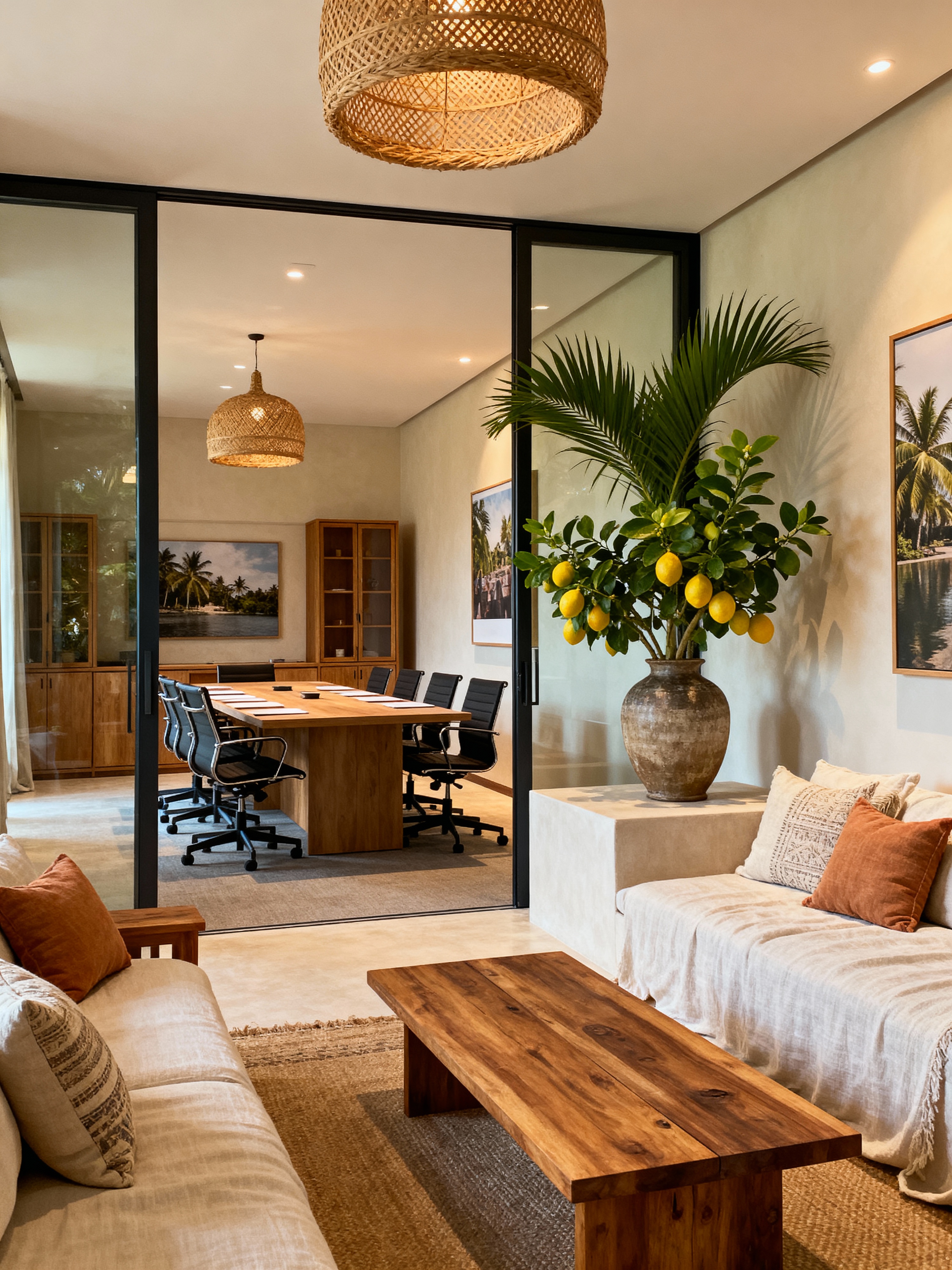 meeting room with bali style with cabinets and painting or photo on wall and glass walls and boardroom table and office chairs and vase and plant and glass doors. . with conversation pit with pillows and neutral color palette and modern boho chic and linen or cotton fabrics and wooden coffee and dining tables and lush tropical plants (palms, lemon trees) and warm ambient lighting and woven pendant lamps