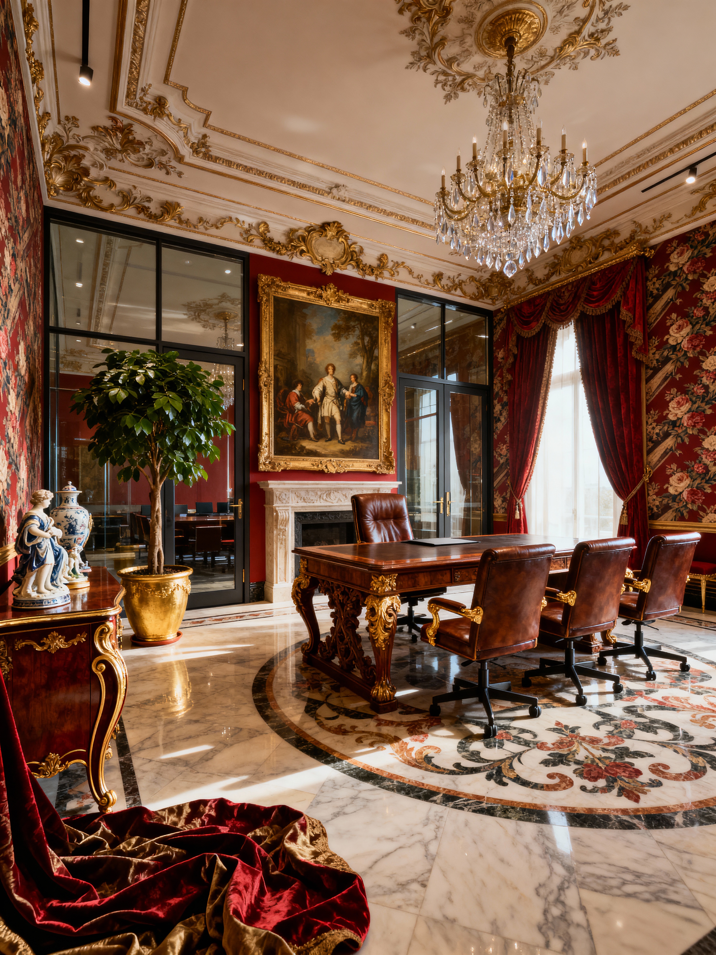 meeting room with baroque style with painting or photo on wall and boardroom table and office chairs and glass walls and plant and vase and cabinets and glass doors. . with heavy moldings and luxurious floral and damask fabrics and sensuous richness and movement and dynamism and elaborate ornamentation and grandeur and tension