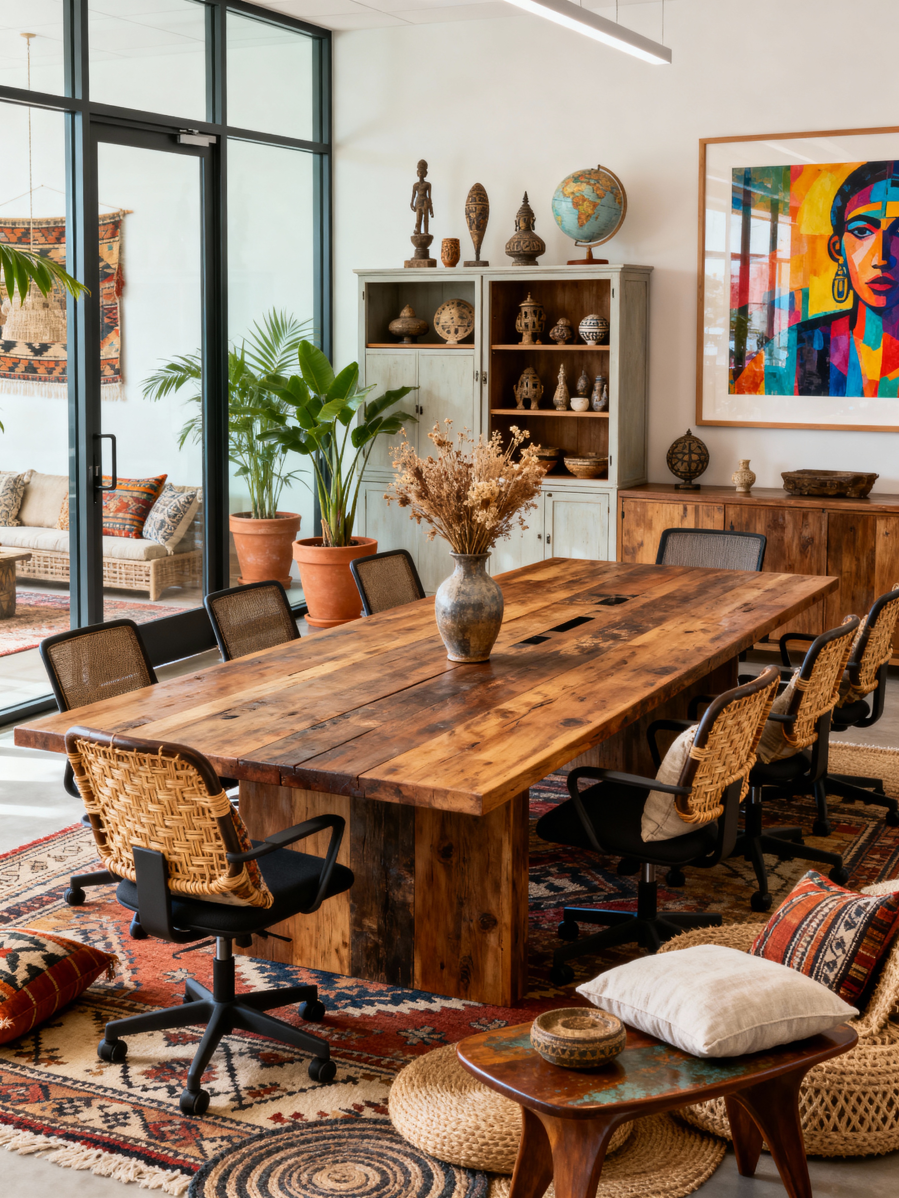 meeting room with boho-chic style with glass walls and office chairs and cabinets and boardroom table and glass doors and vase and painting or photo on wall and plant. . with global artifacts and bohemian flair and relaxed atmosphere and eclectic mix and vintage finds and free-spirited and natural materials and layered textiles