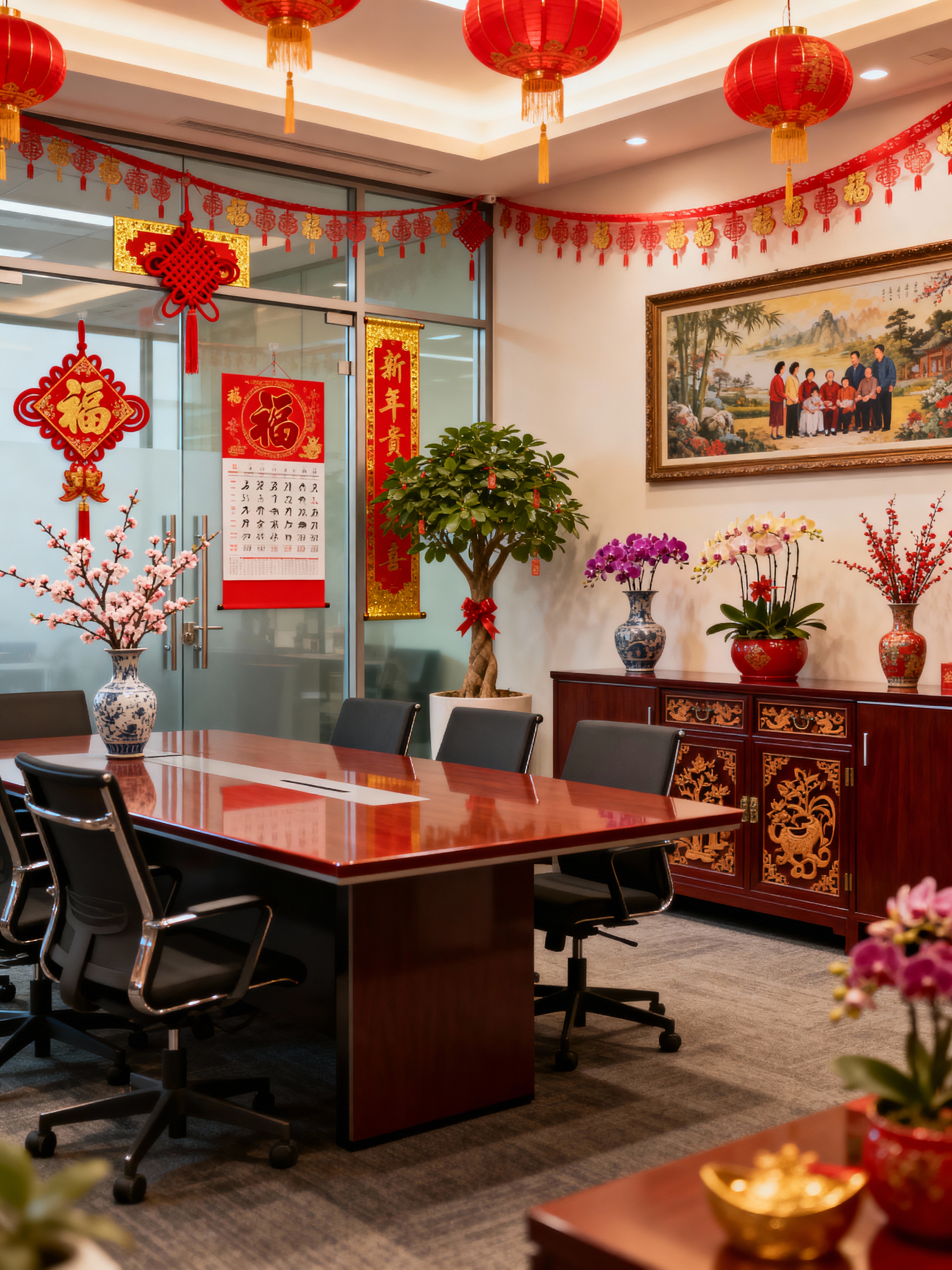 meeting room with chinese new year style with glass doors and vase and boardroom table and office chairs and painting or photo on wall and plant and cabinets and glass walls. . with vases of plum blossoms and orchids and mei hwa flowers and zodiac calendar and money tree and fai chun banners and chinese red lanterns and chinese knots and door couplets