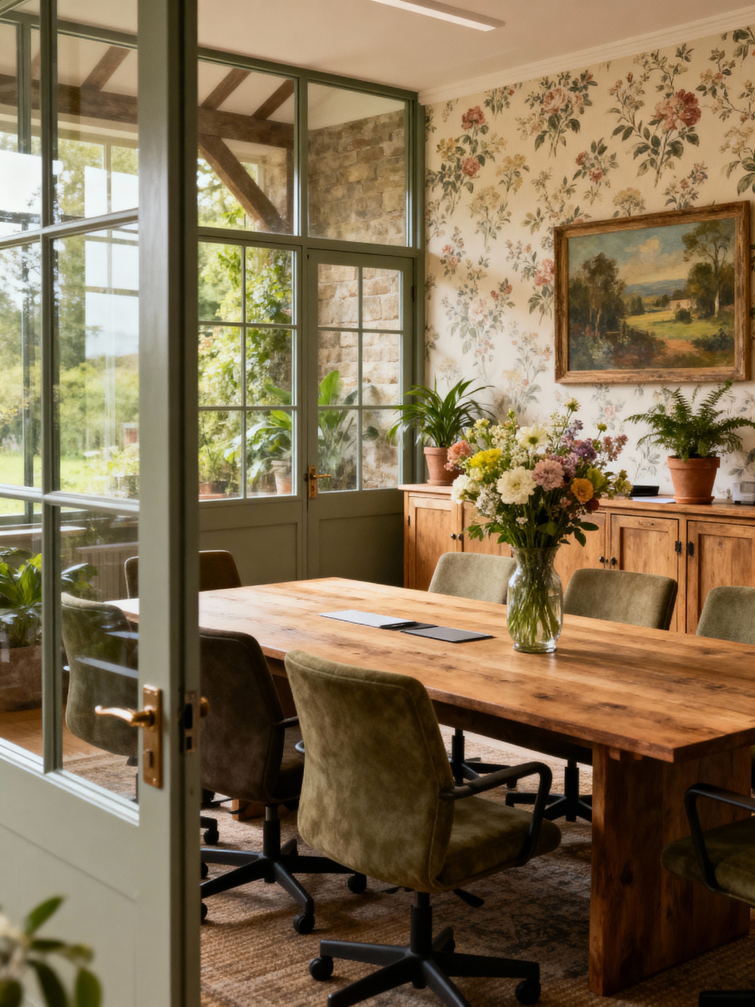 meeting room with cottagecore style with vase and glass walls and glass doors and painting or photo on wall and office chairs and plant and boardroom table and cabinets. . with earthy and muted colors and rustic and organic and country style and traditional and cottage style and floral patterns